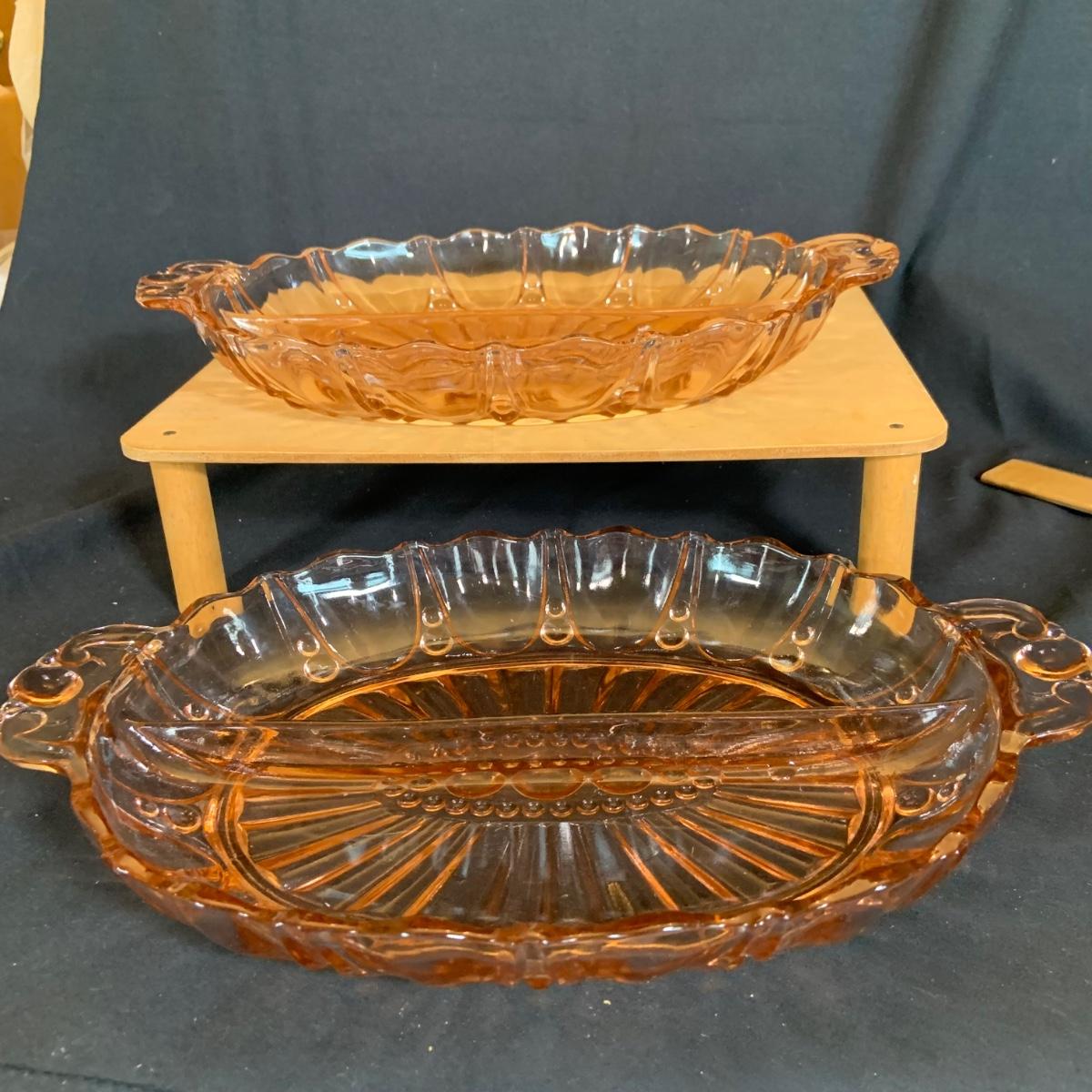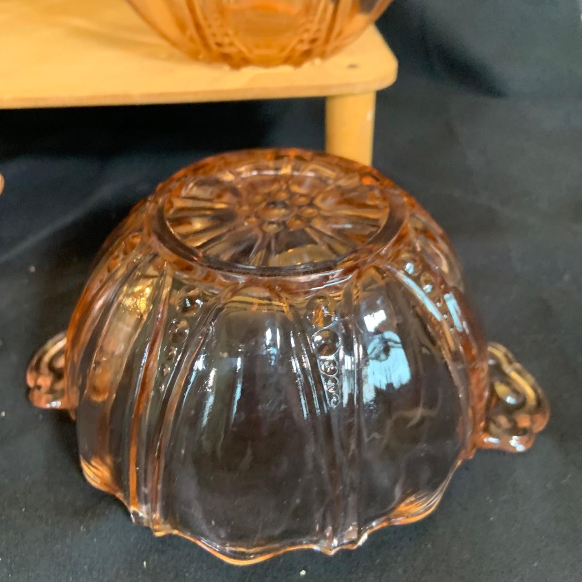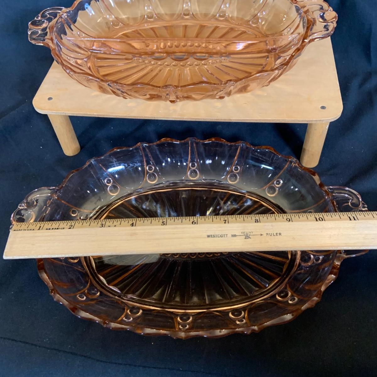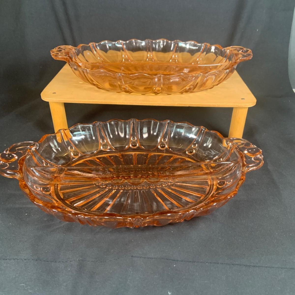 LOT:273: Fenton Cranberry Glass Bowl with Ruffles, Pink Depression Glass Bowls and Divided Serving Dish