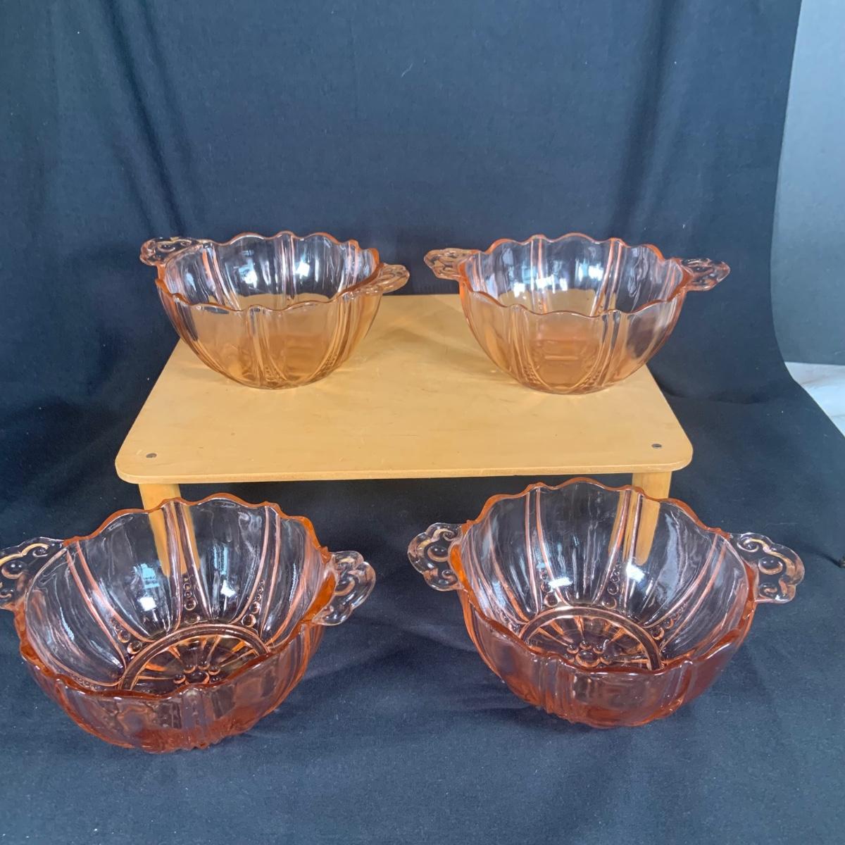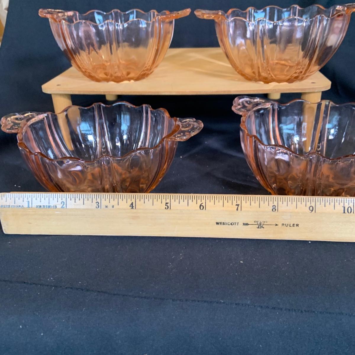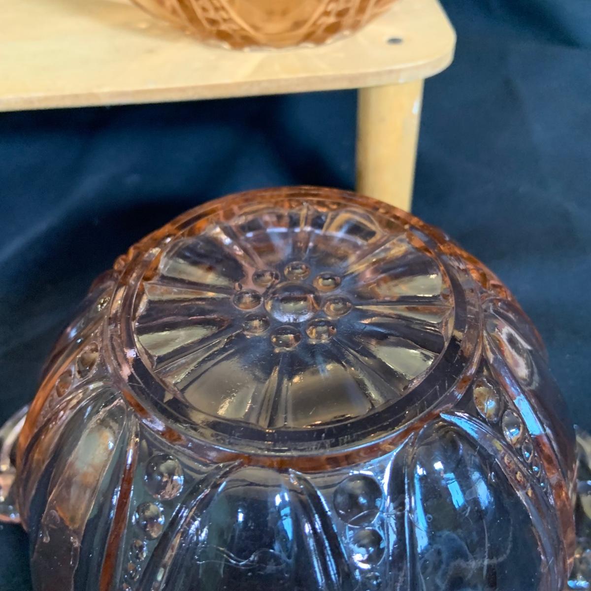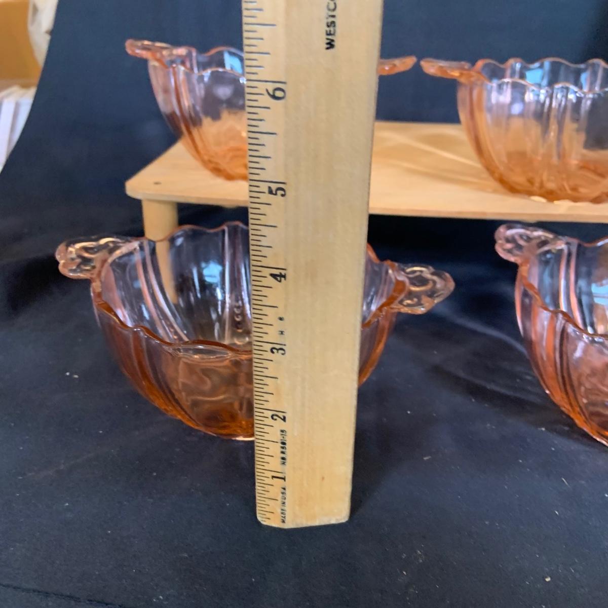 LOT:273: Fenton Cranberry Glass Bowl with Ruffles, Pink Depression Glass Bowls and Divided Serving Dish