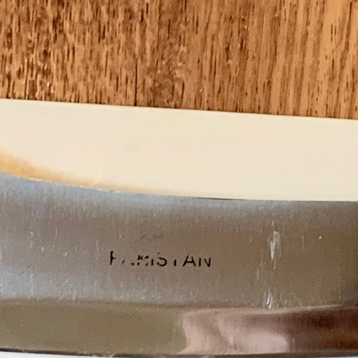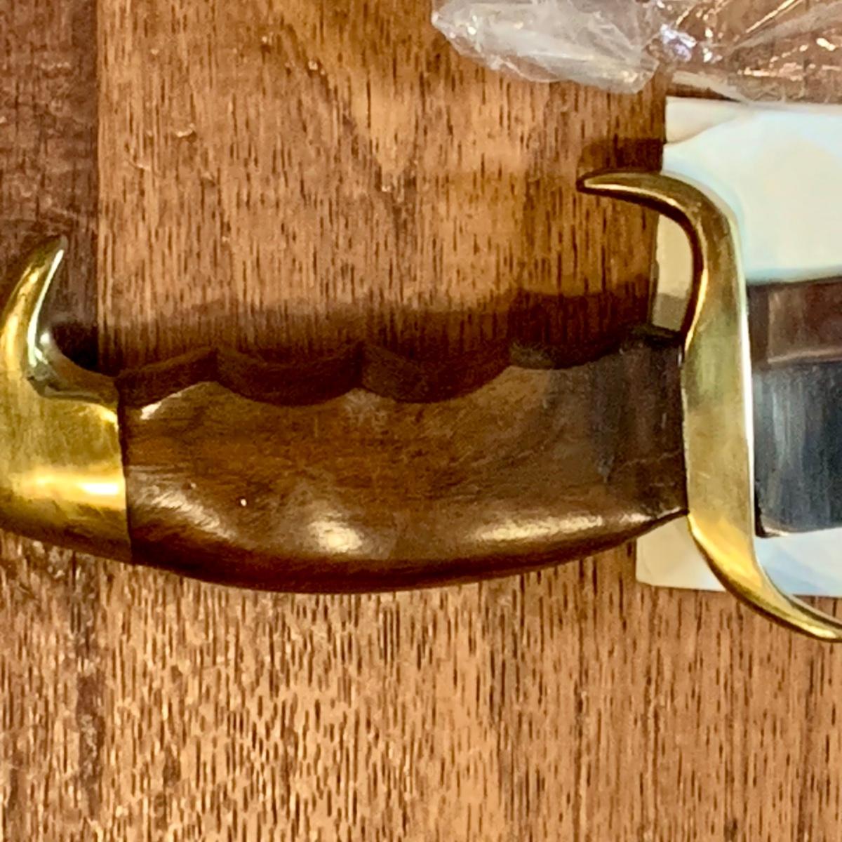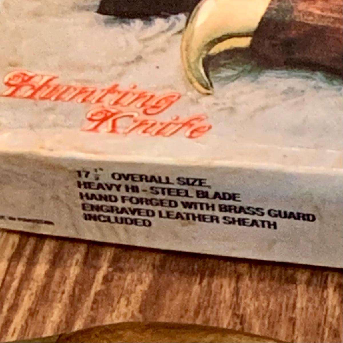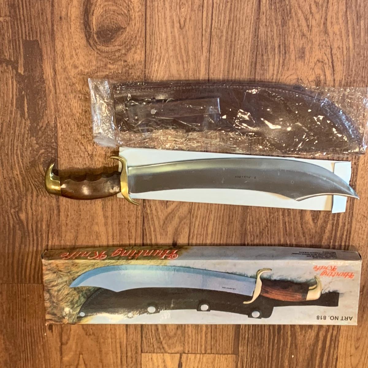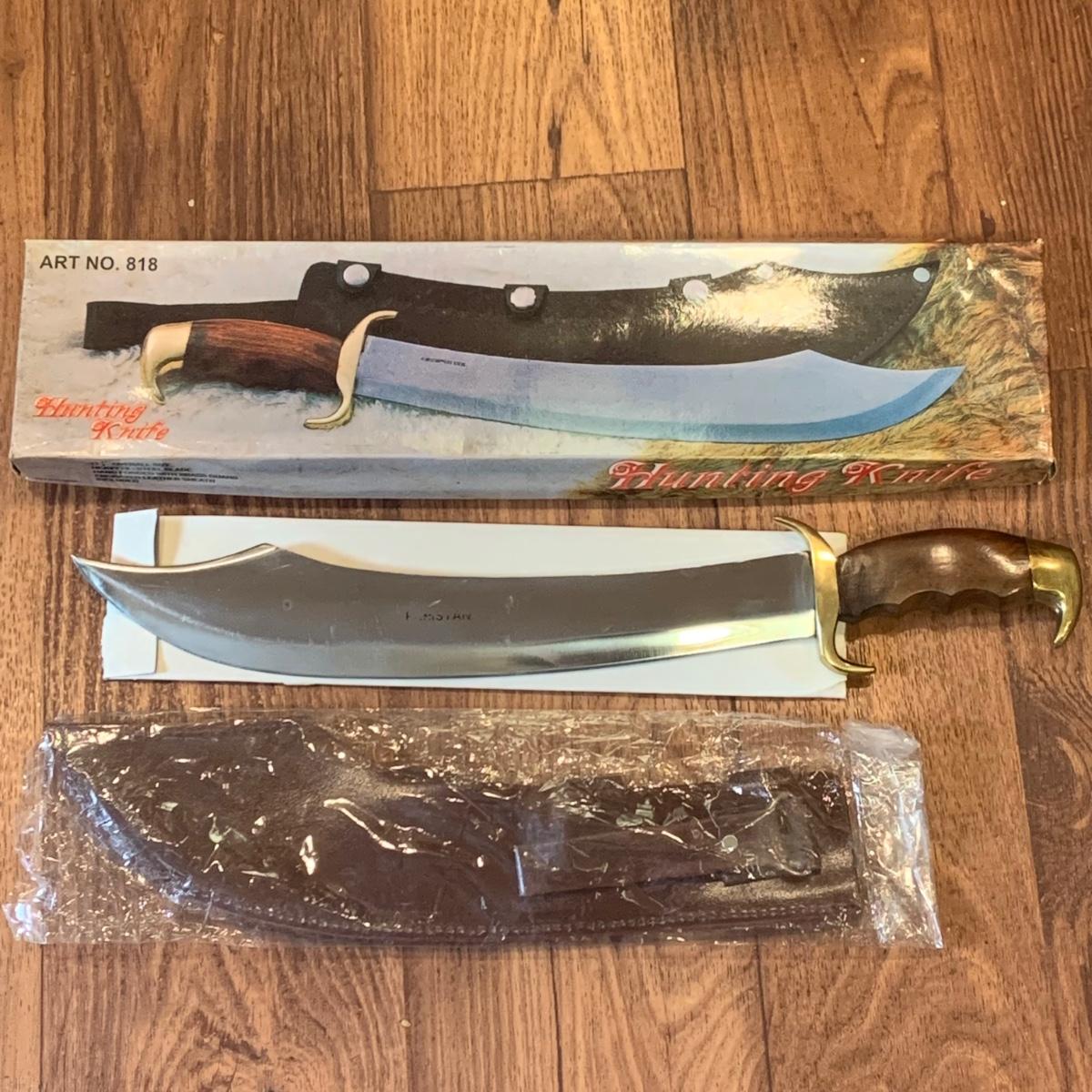 LOT:274 Heavy Hi-Steel Blade Hunting Knife/Saber with Brass Gard and Leather Sheath In Original Box