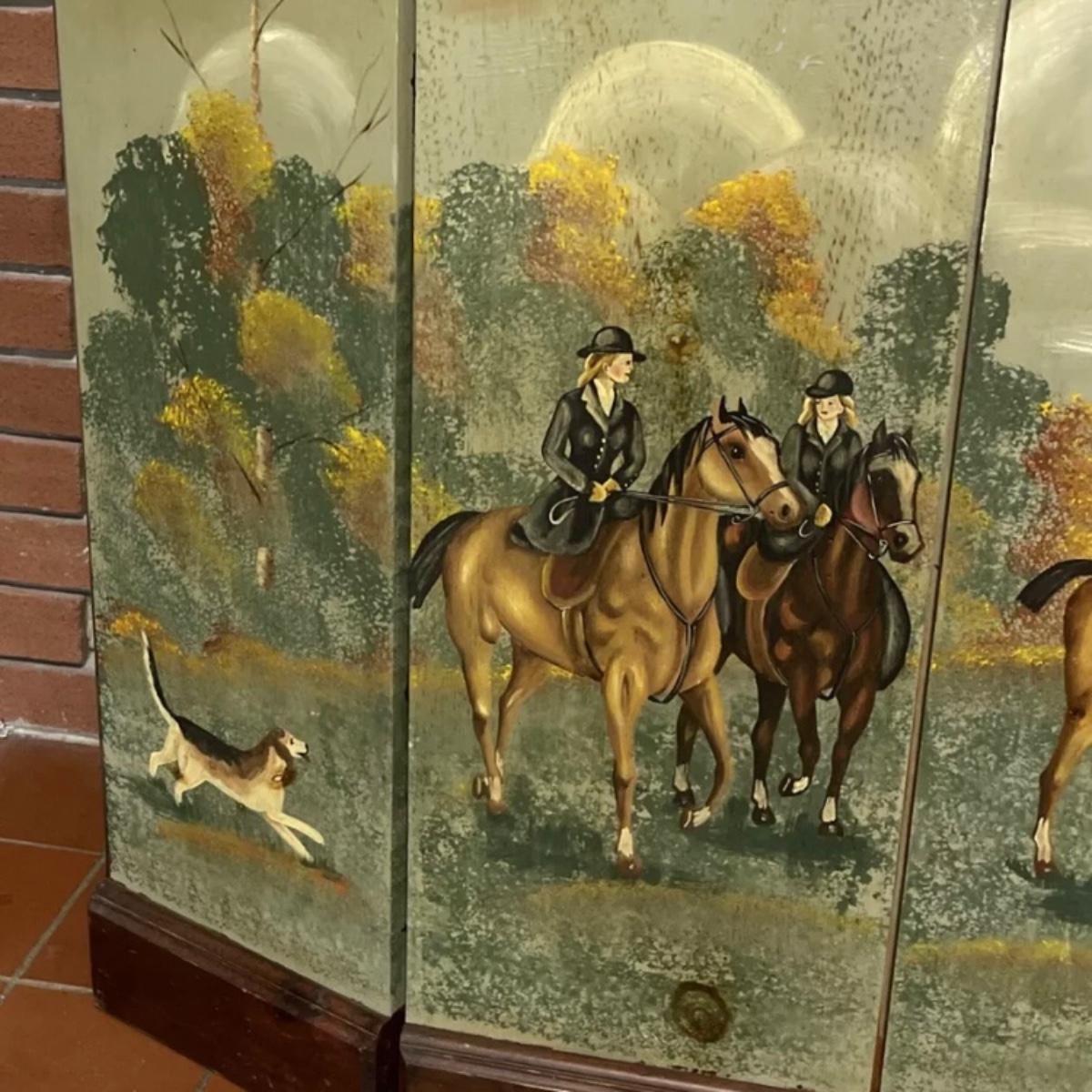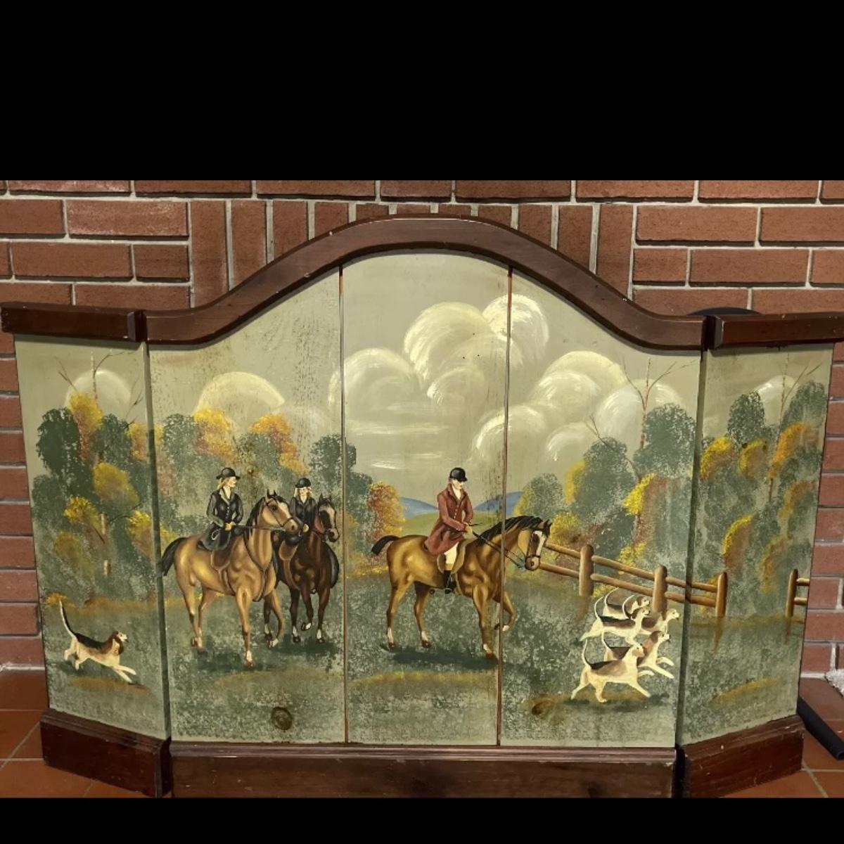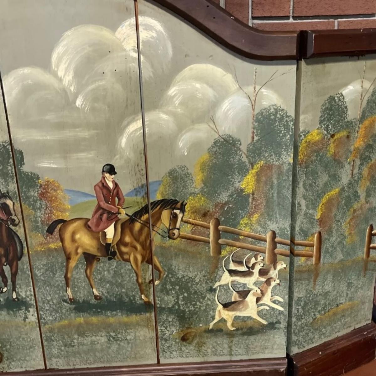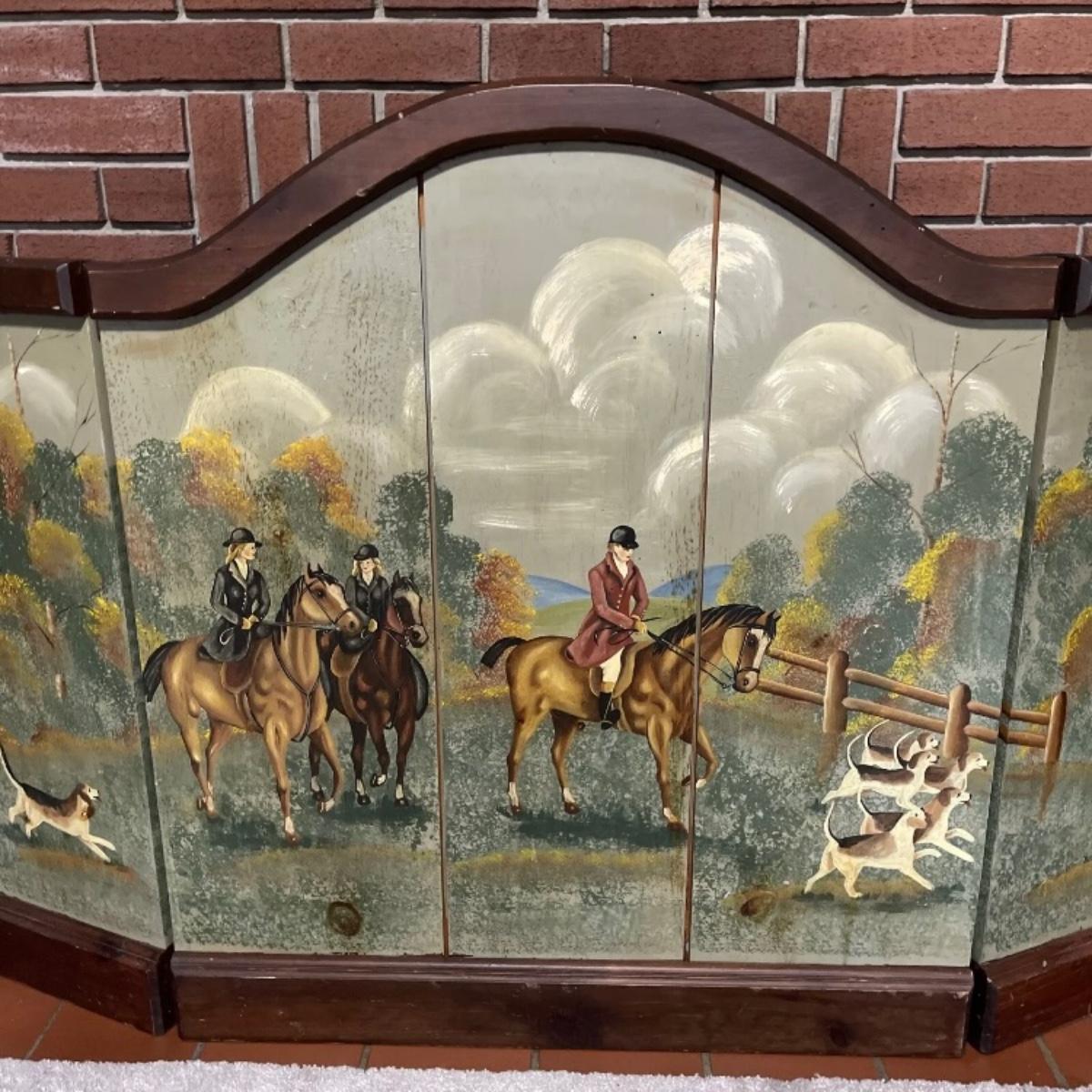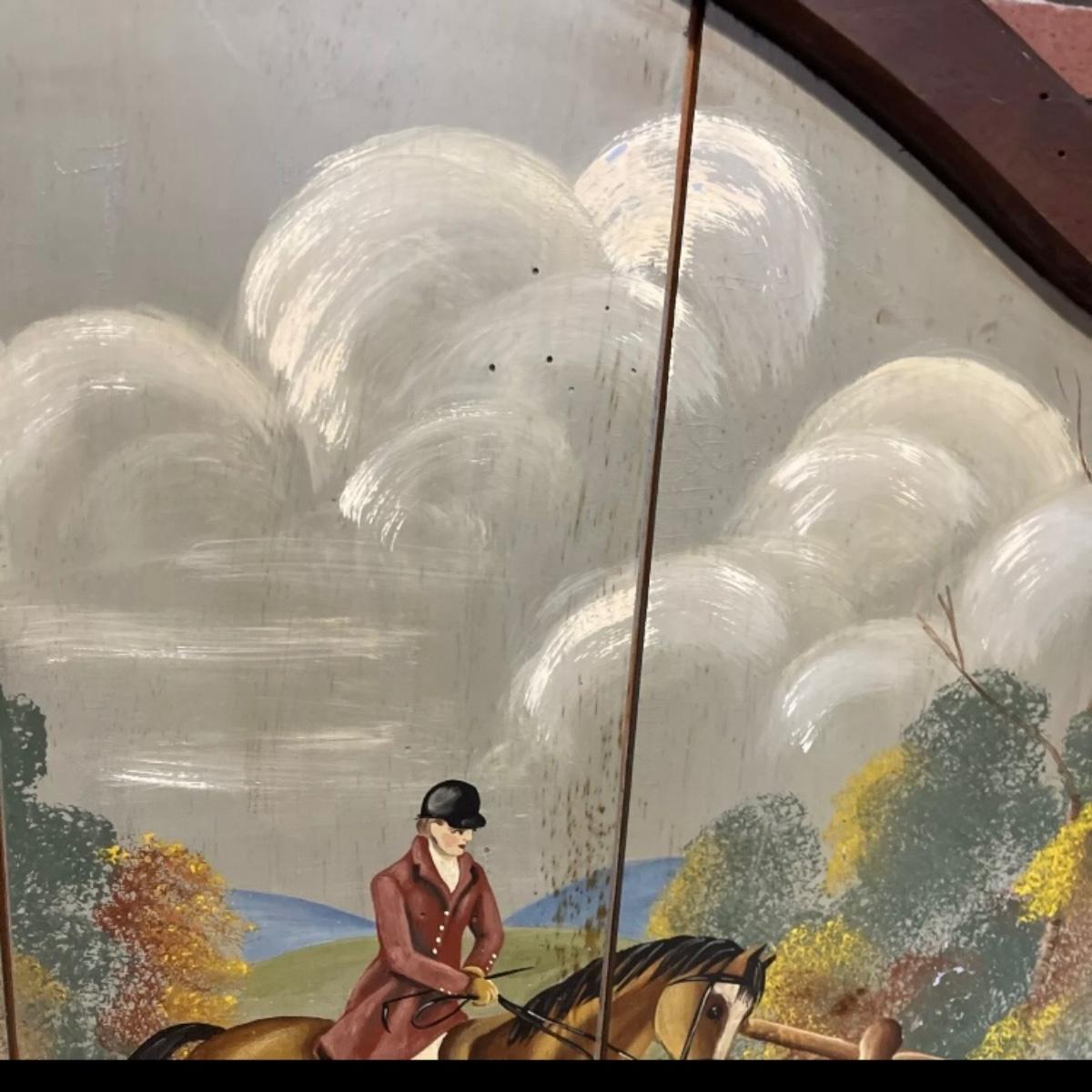 LOT:294: Beautiful Hand Painted Fox Hunt Wood Fireplace Cover