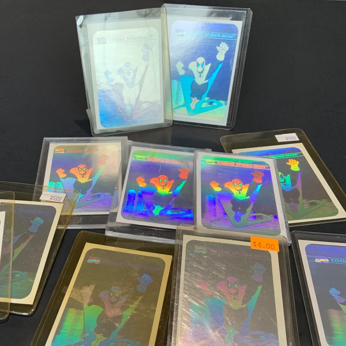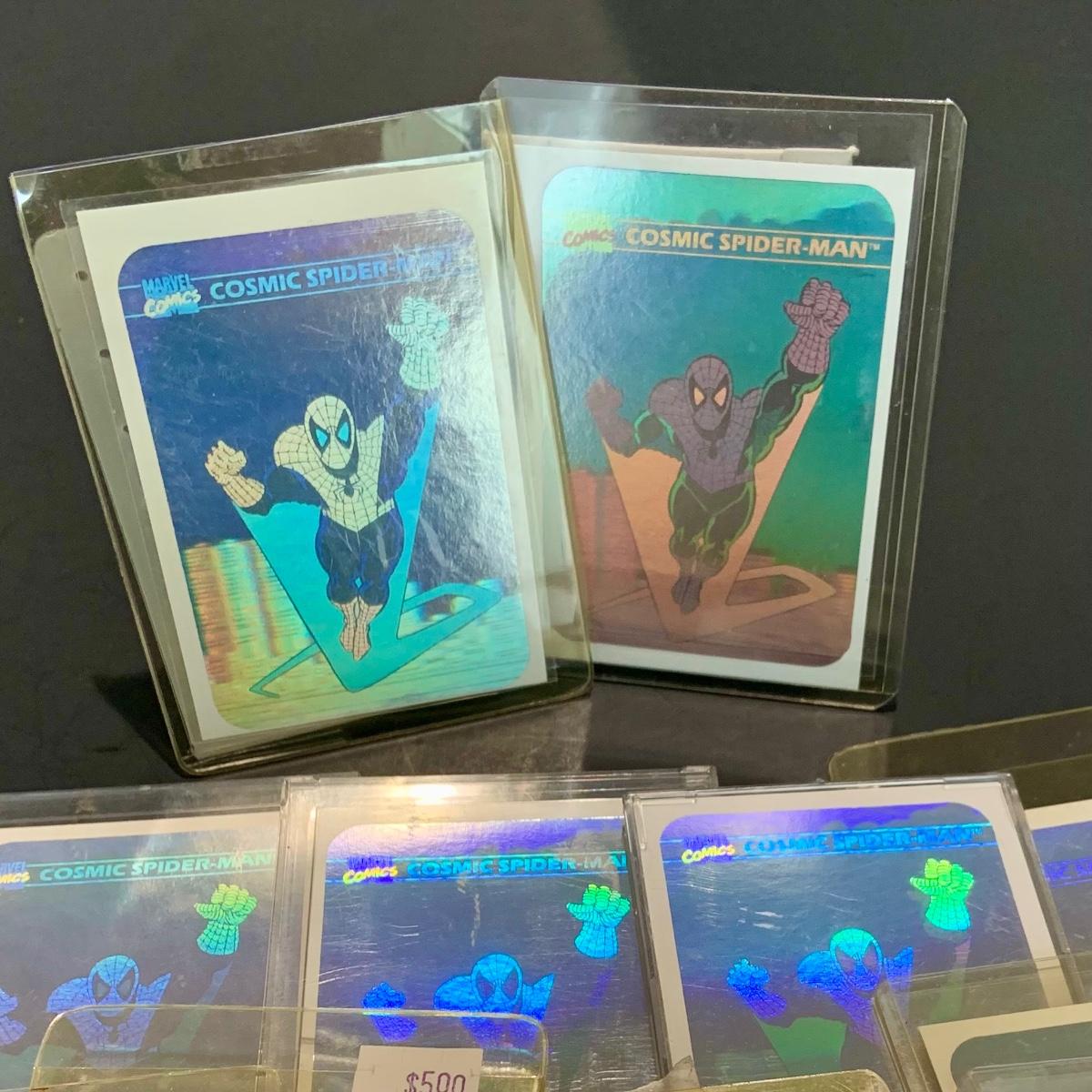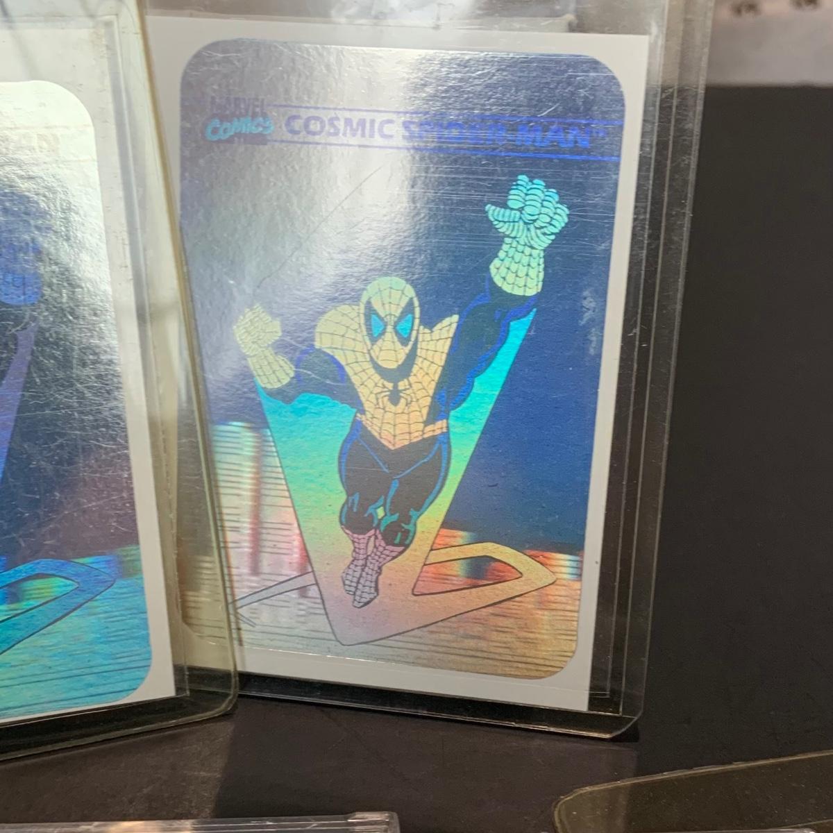 LOT 162: 11 cards of the 1990 Marvel Cosmic Spiderman Insert Hologram card!