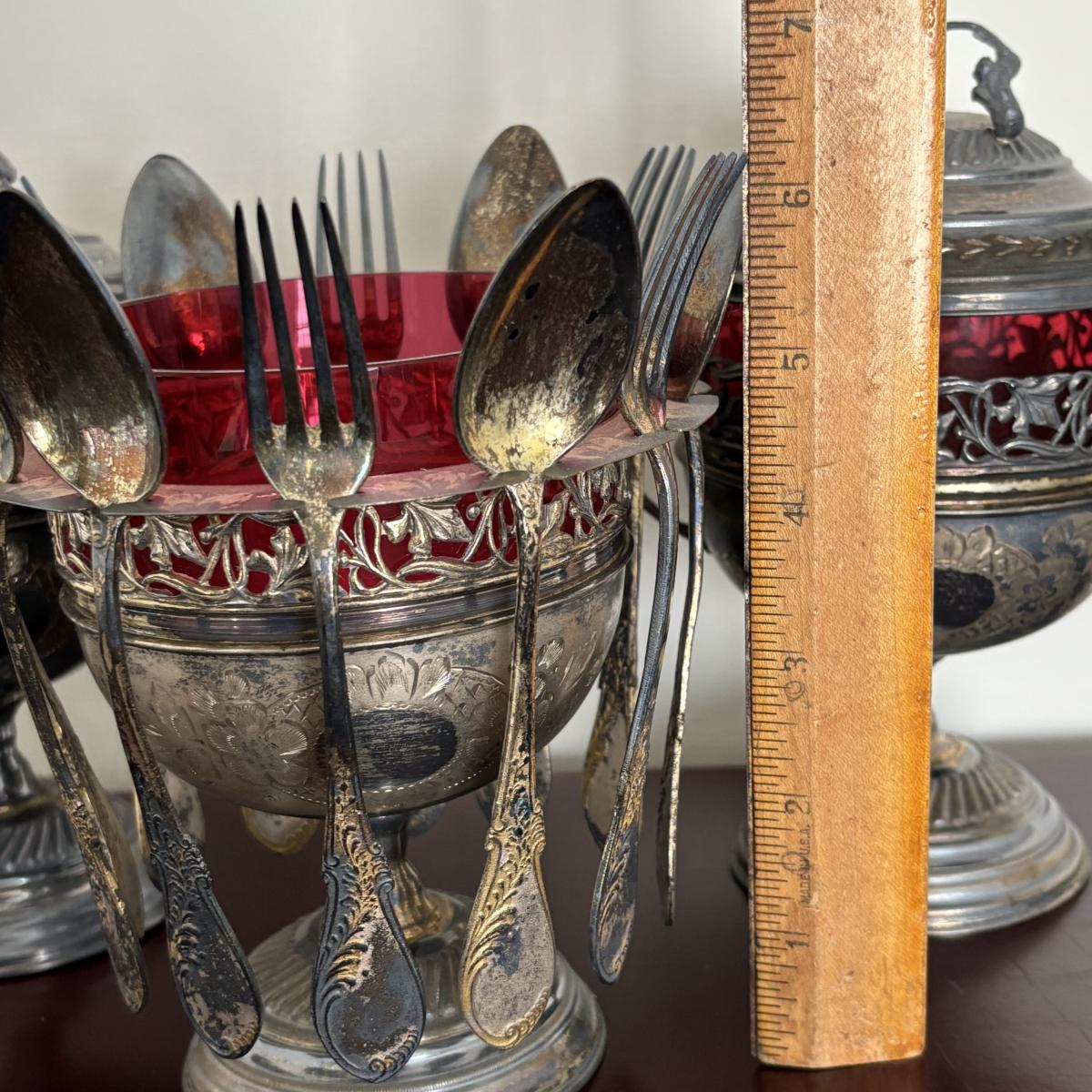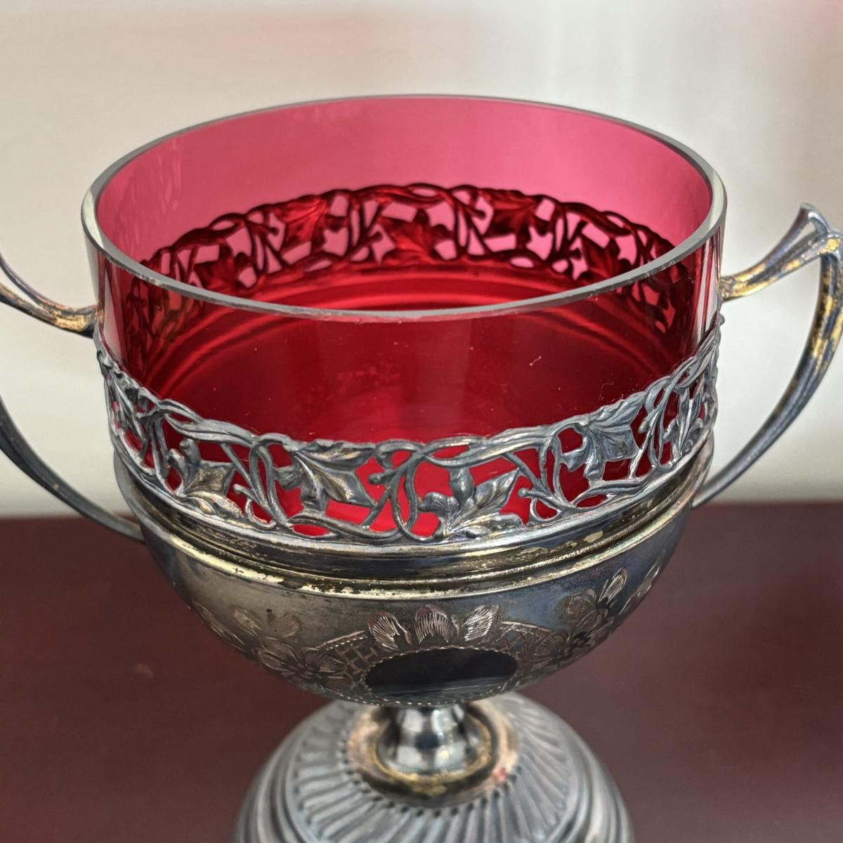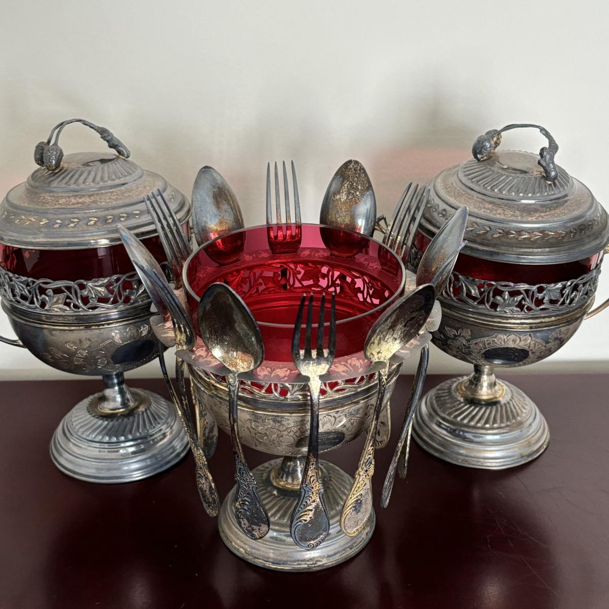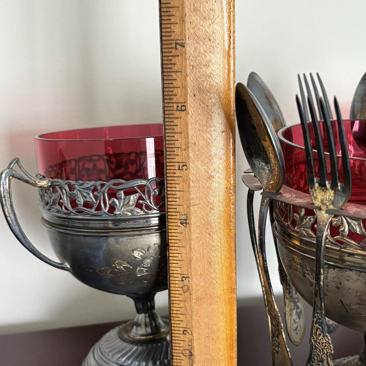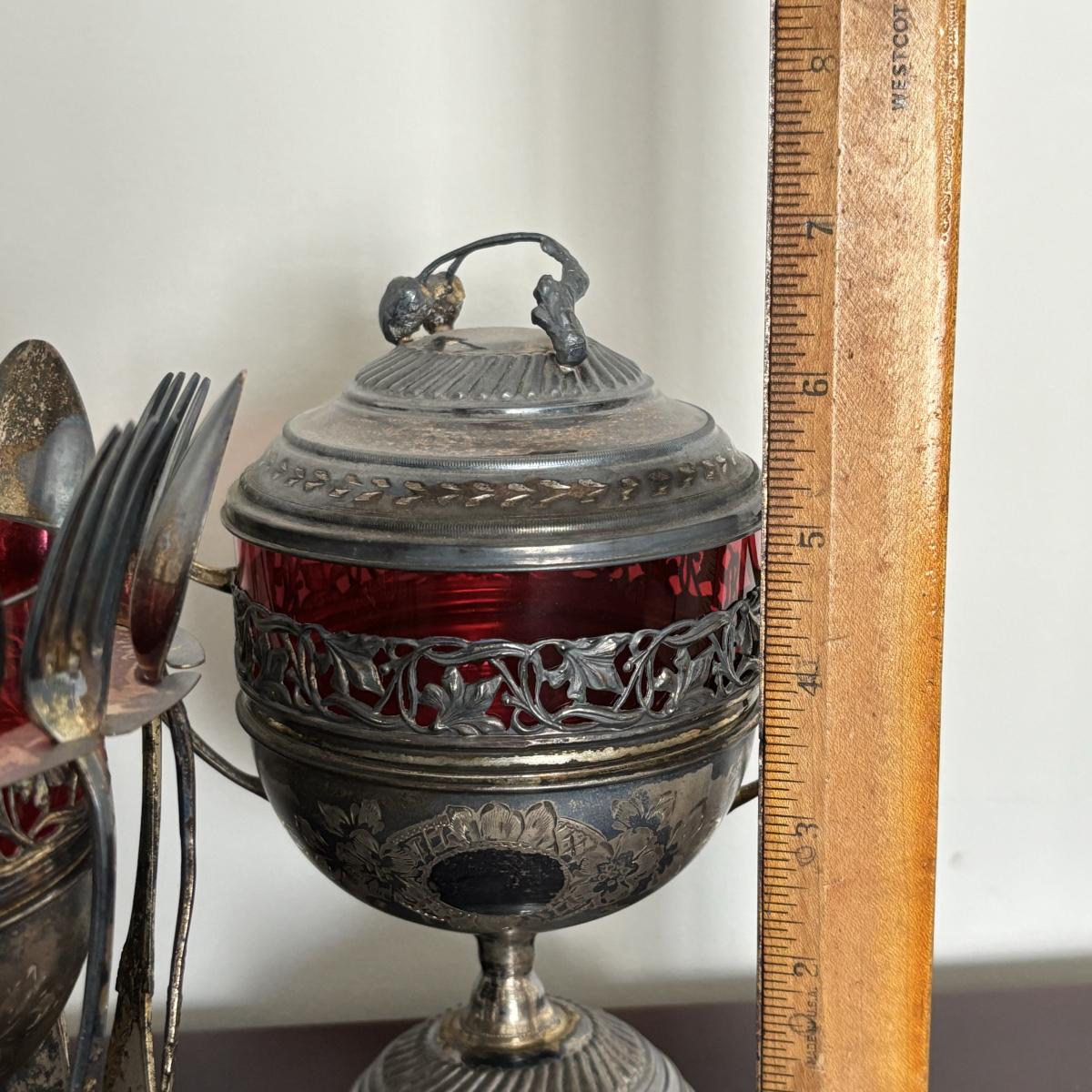 LOT 15: Antique Silver-Plated Caviar/Compote Set w/Cranberry Glass