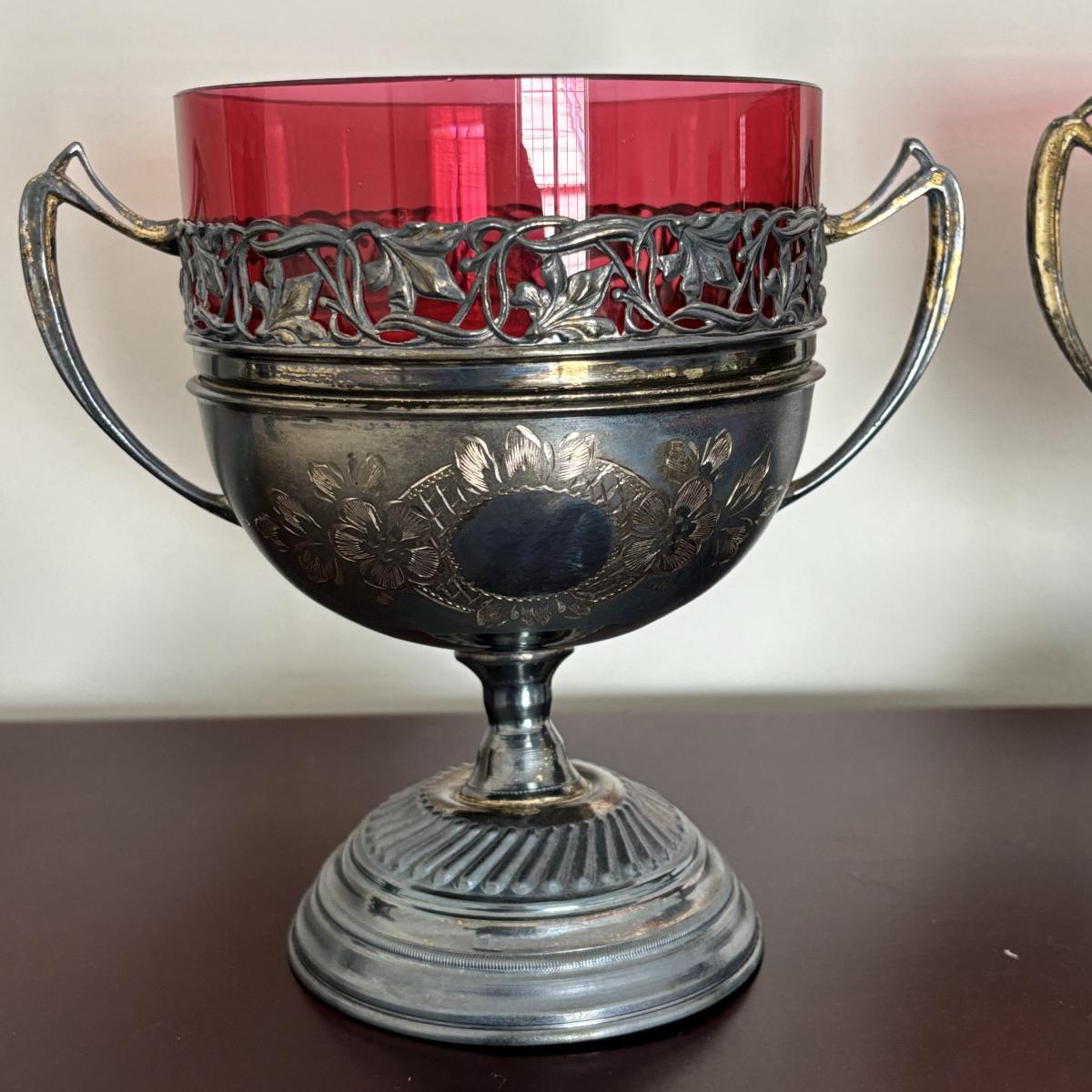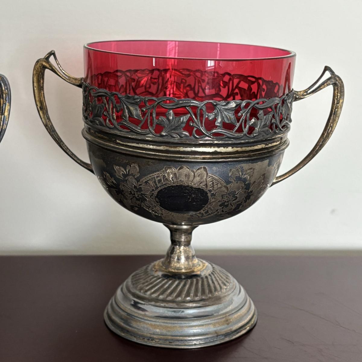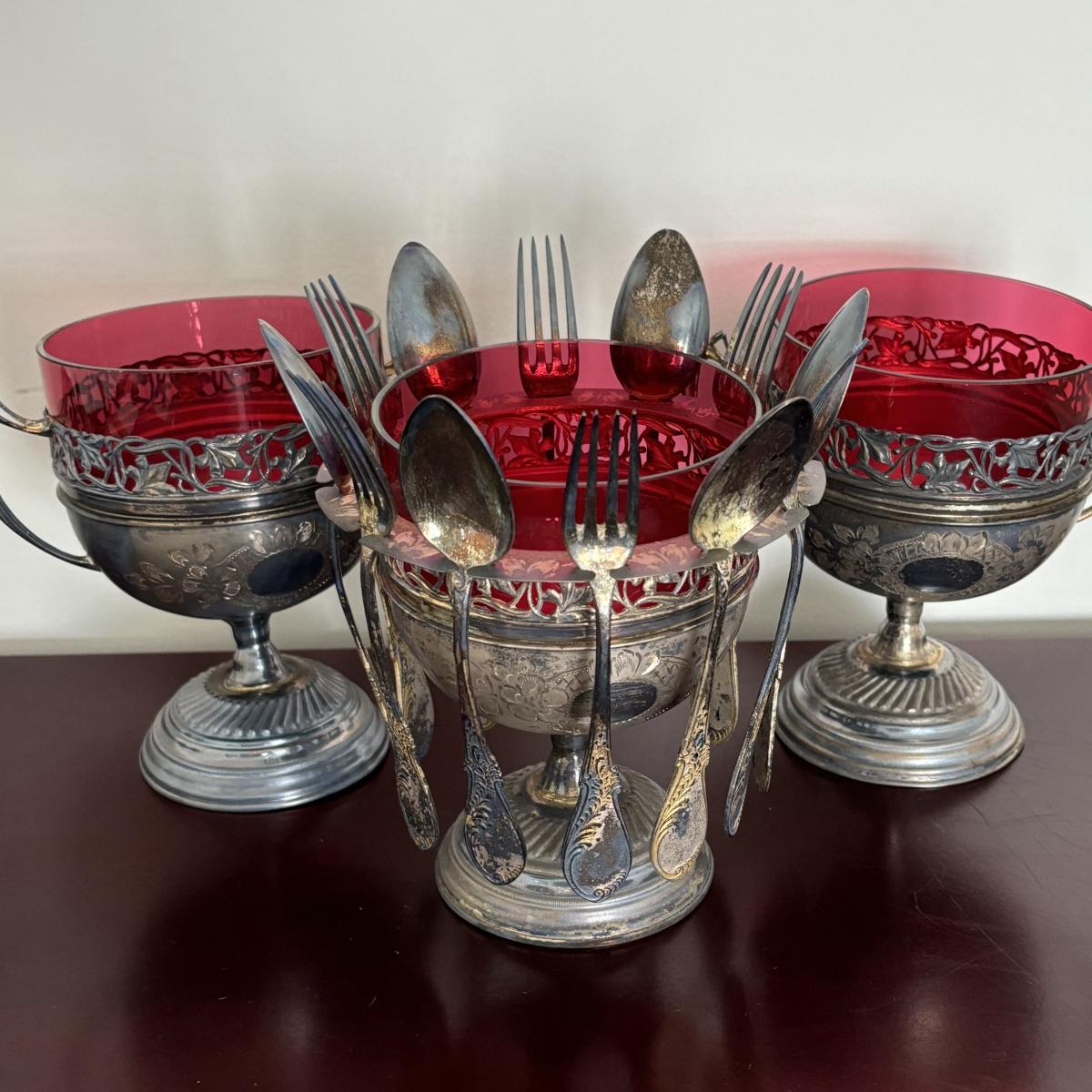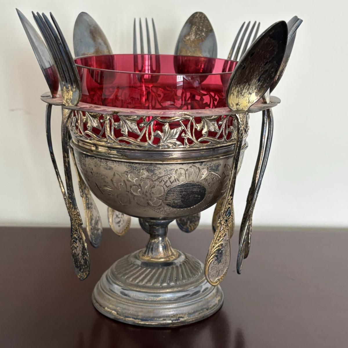 LOT 15: Antique Silver-Plated Caviar/Compote Set w/Cranberry Glass