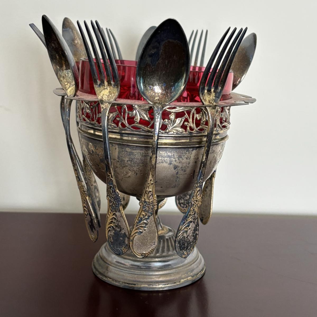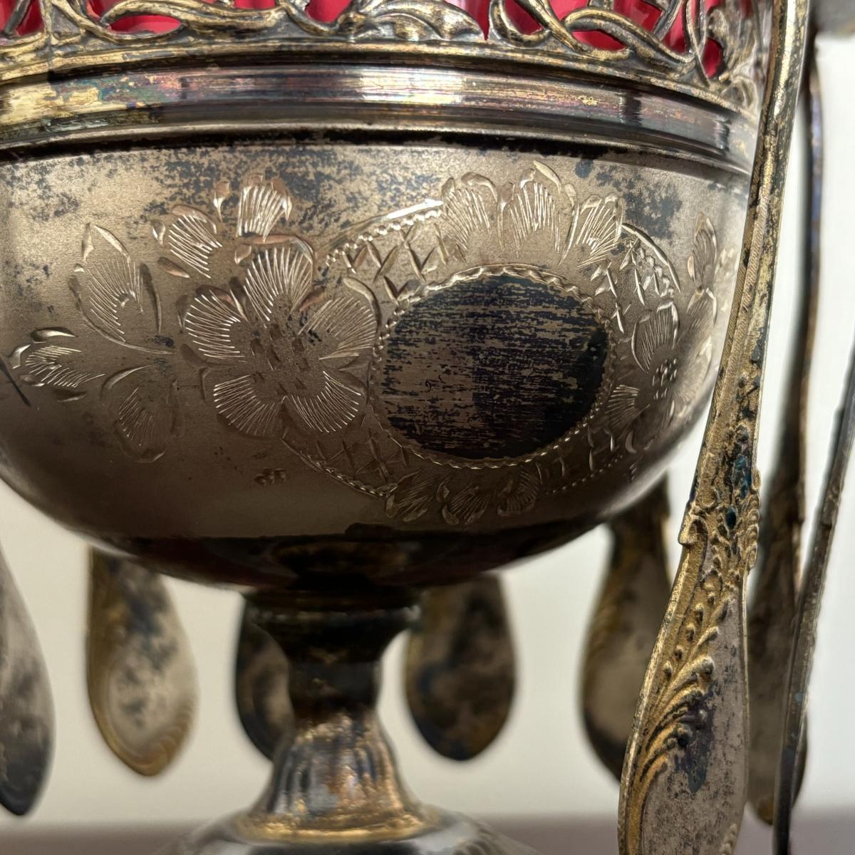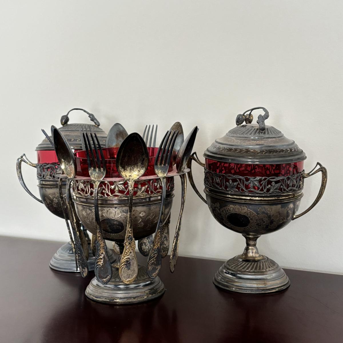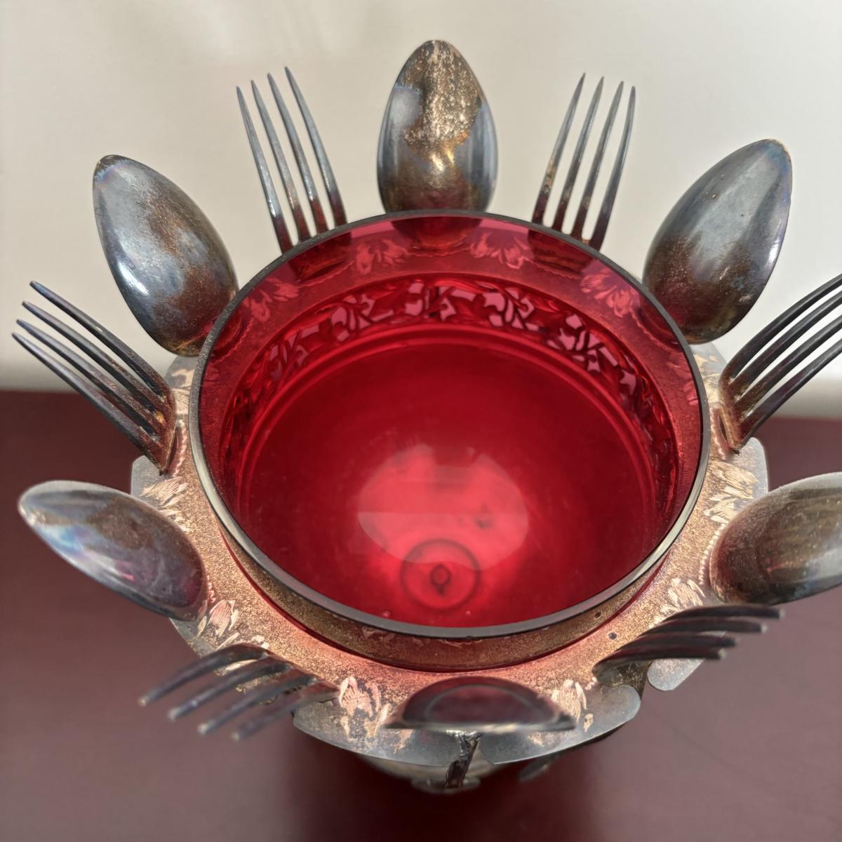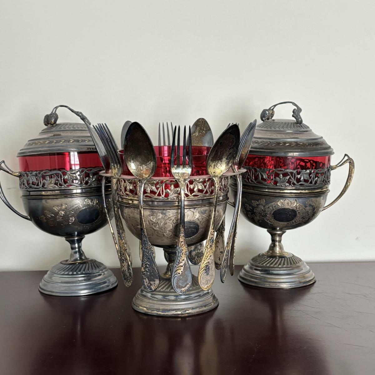 LOT 15: Antique Silver-Plated Caviar/Compote Set w/Cranberry Glass