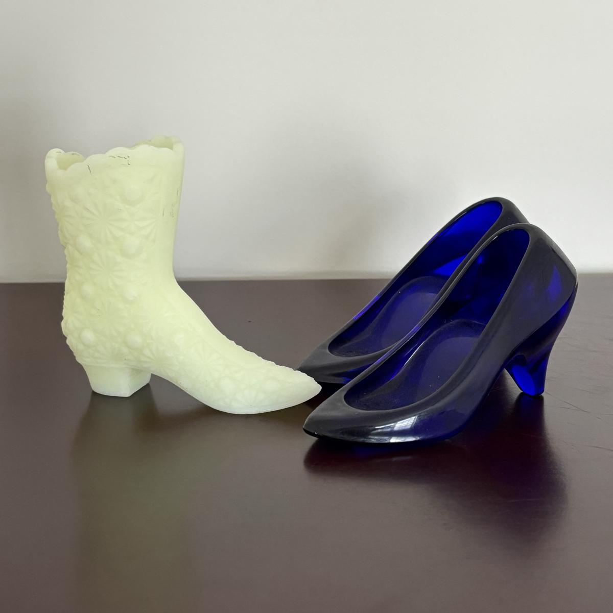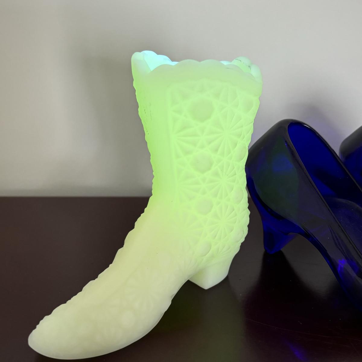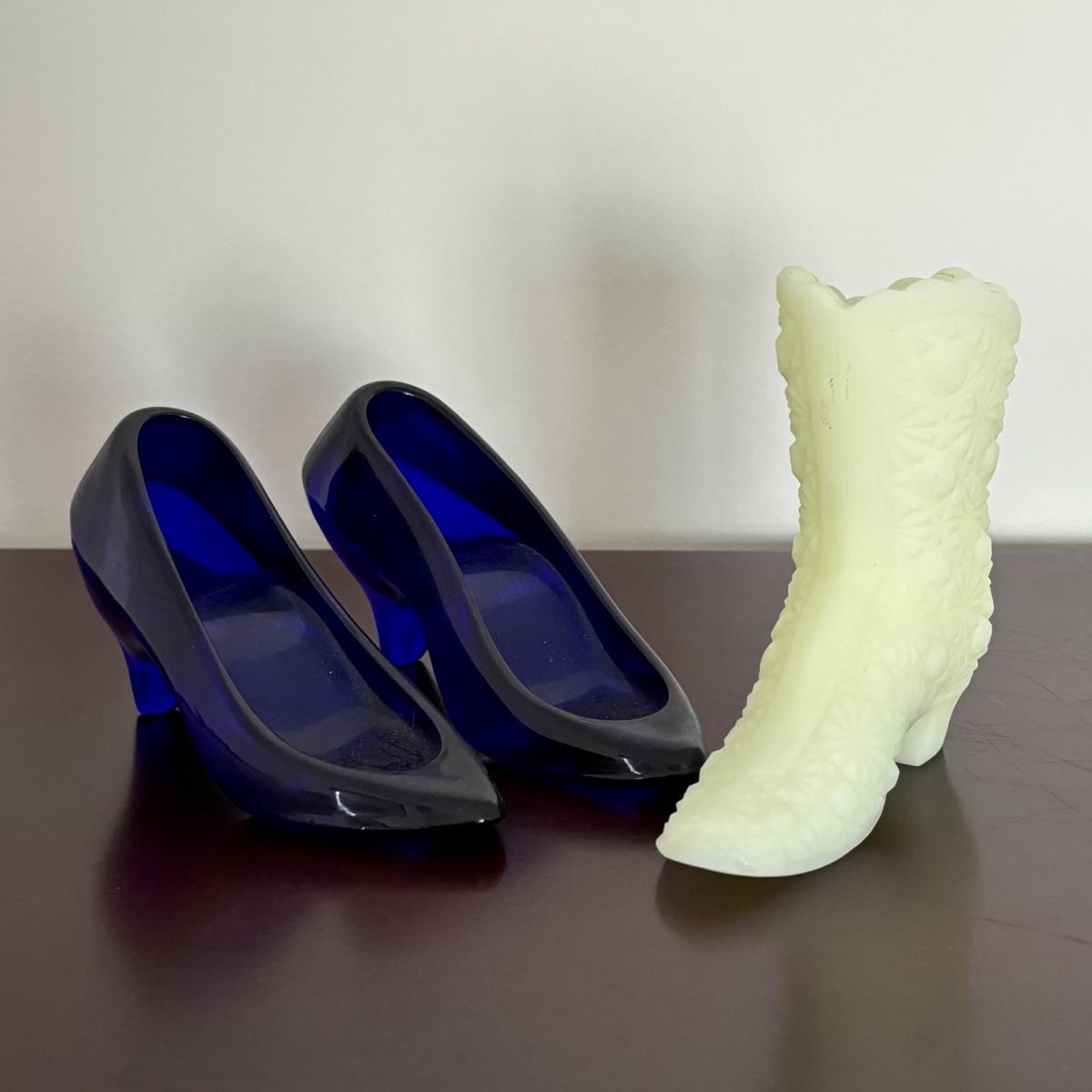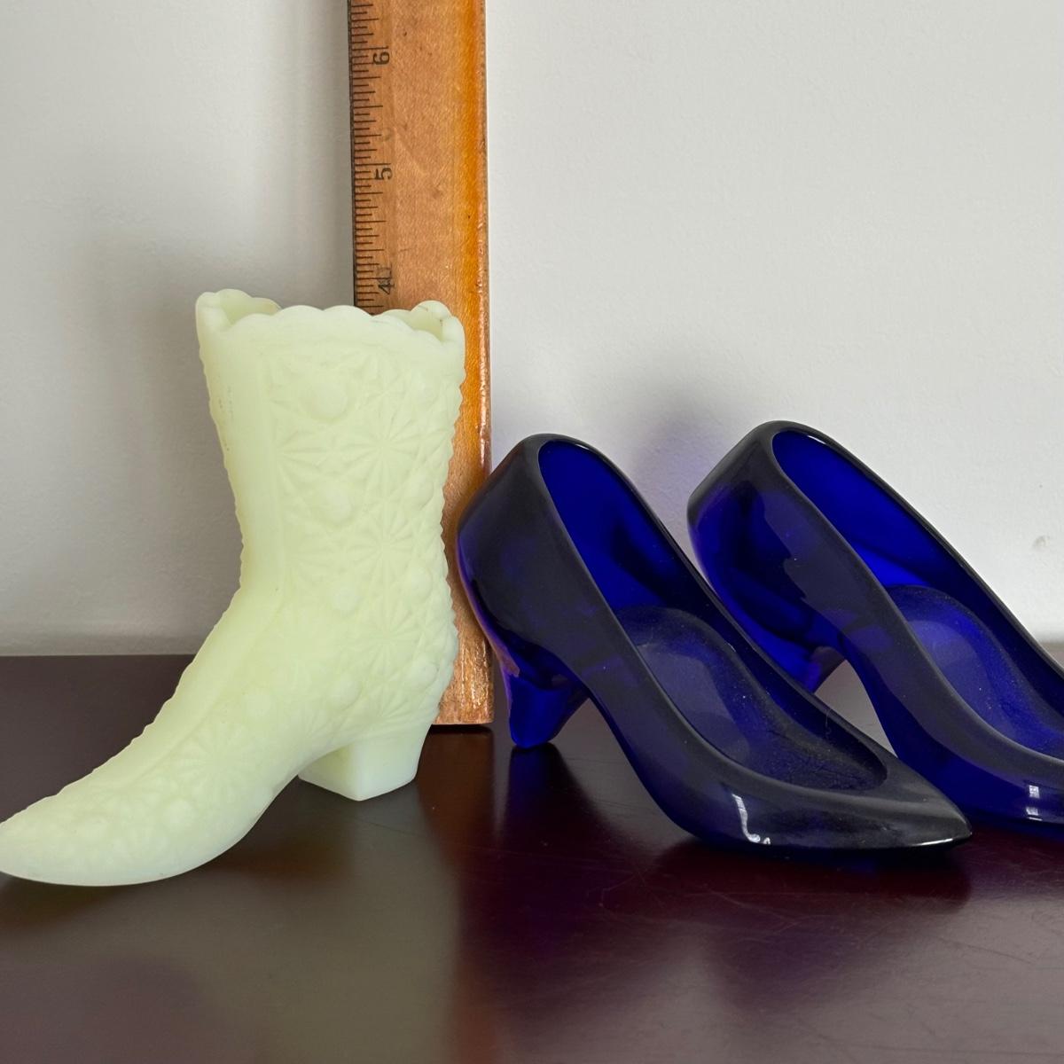 LOT 16: Vintage Oneida Crystal Cobalt Blue Cinderella Glass Slippers & Fenton Pale Yellowish/Green Daisy Button Boot