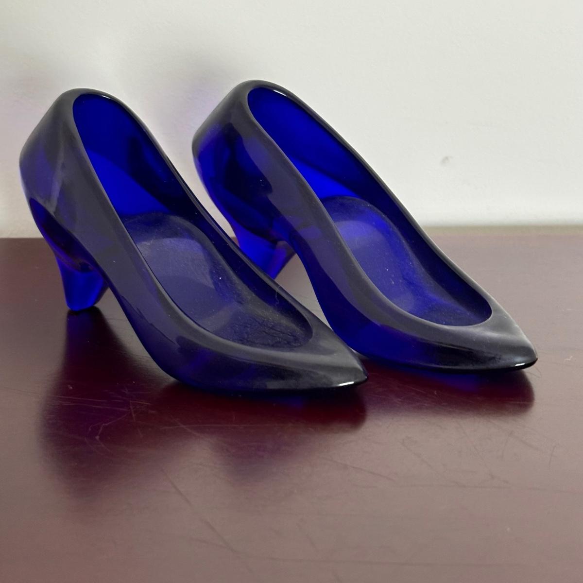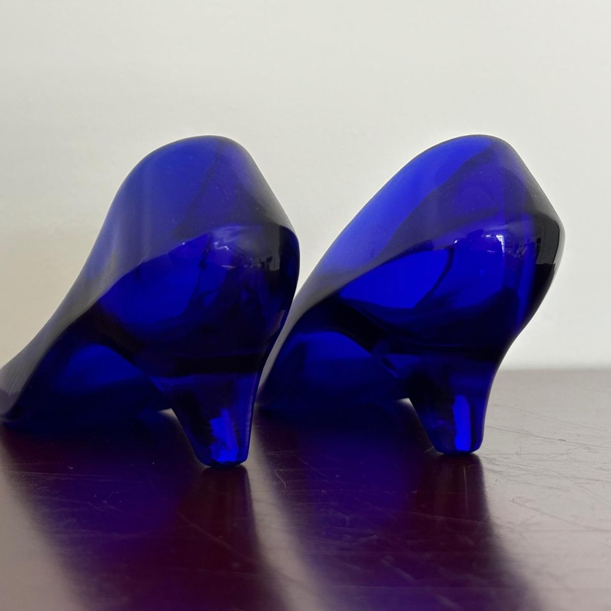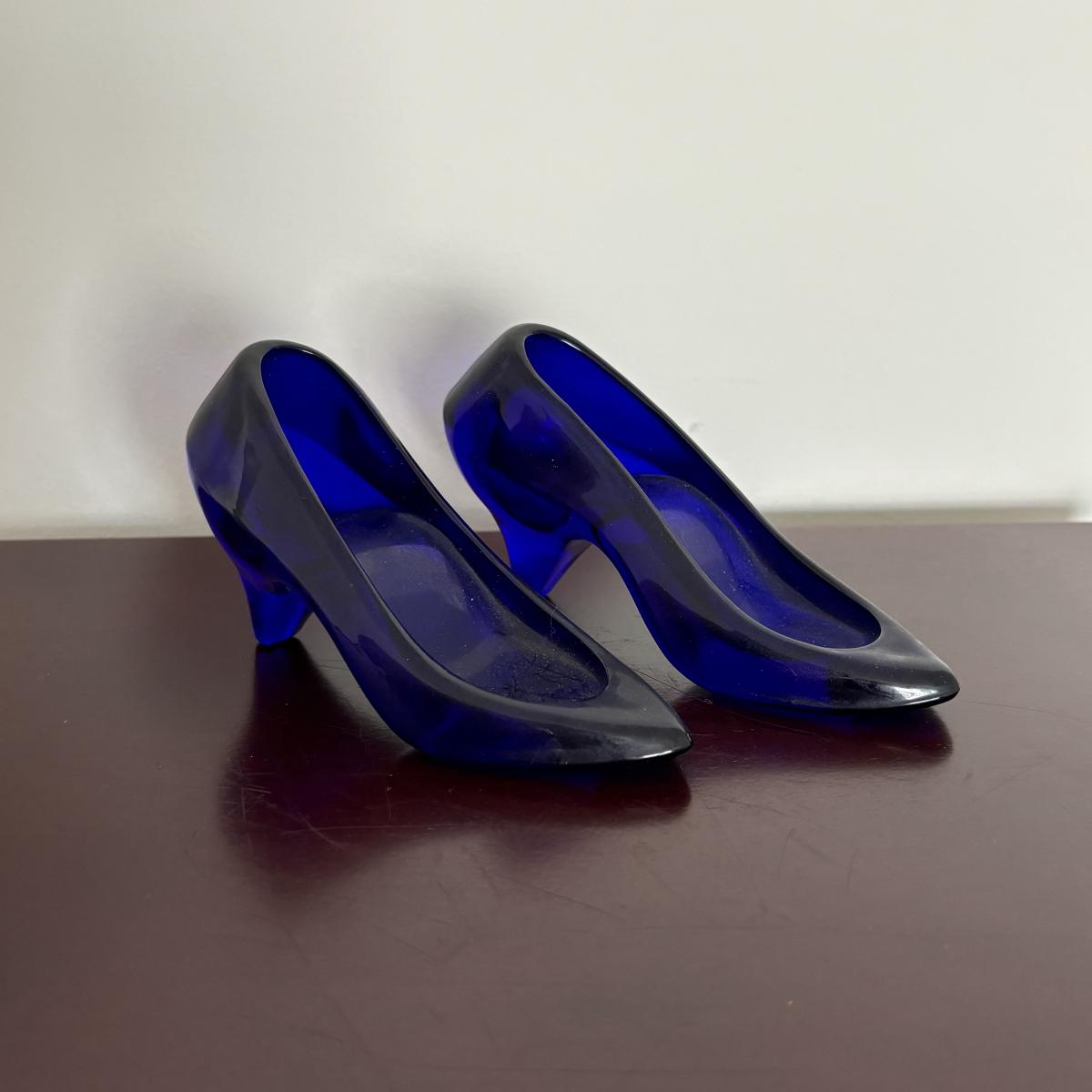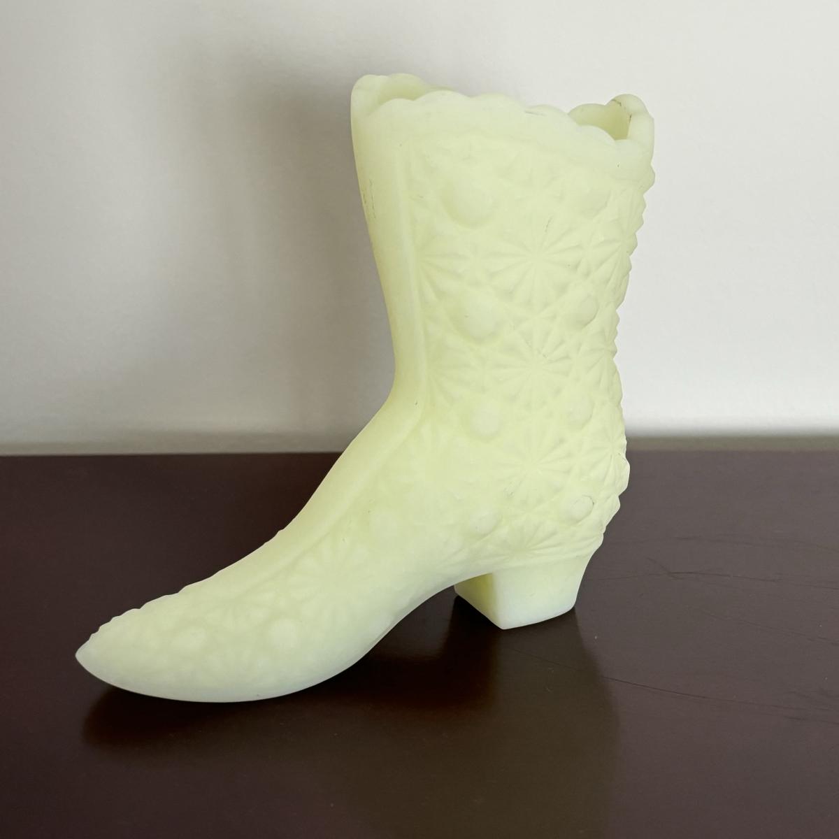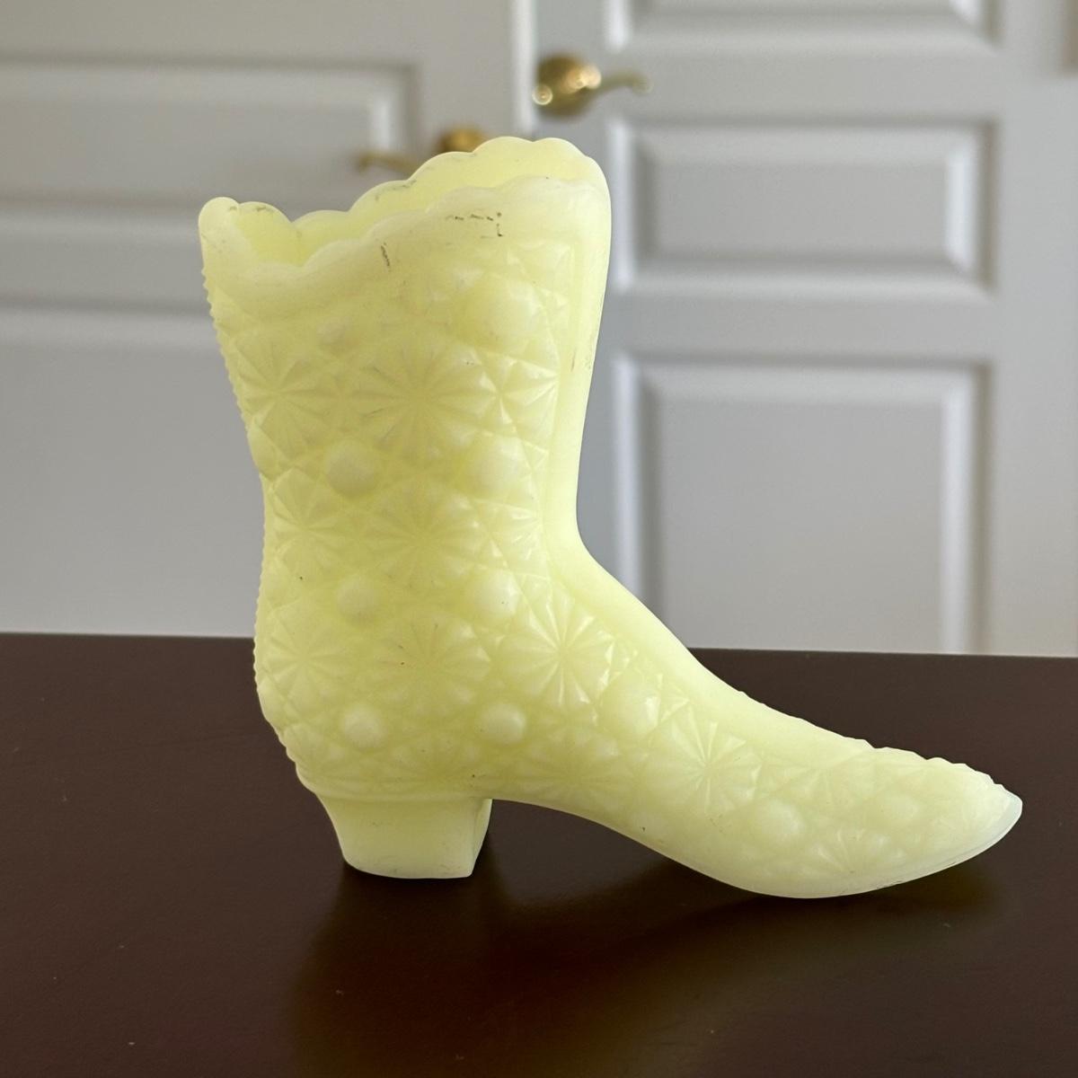 LOT 16: Vintage Oneida Crystal Cobalt Blue Cinderella Glass Slippers & Fenton Pale Yellowish/Green Daisy Button Boot