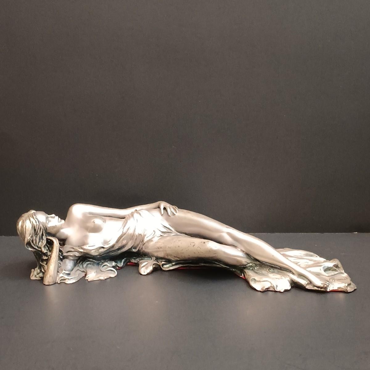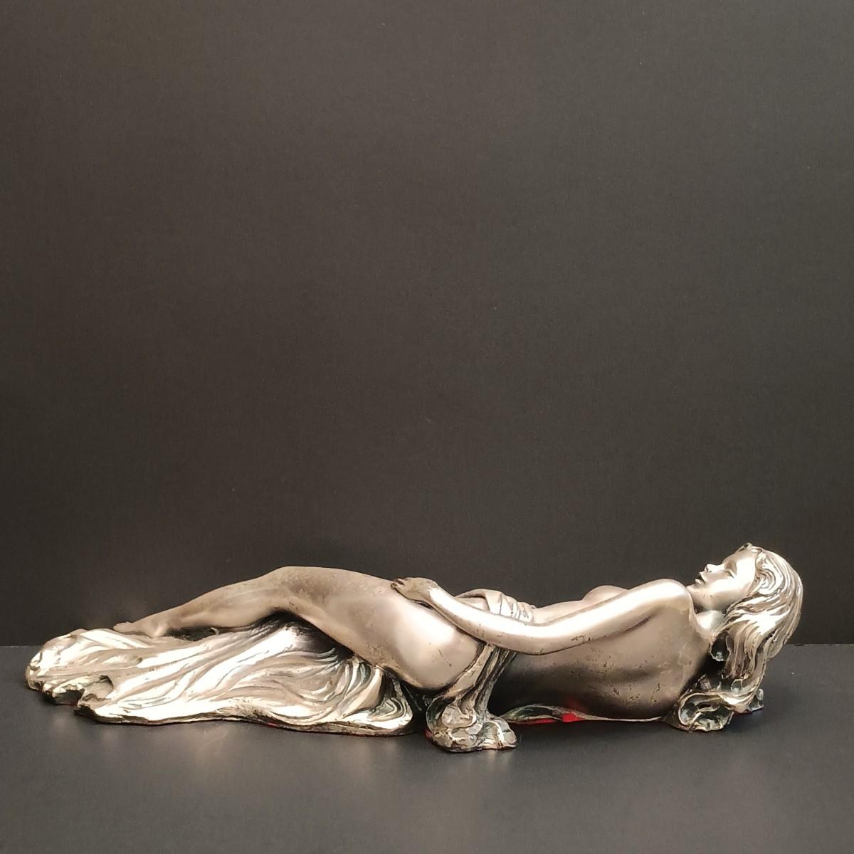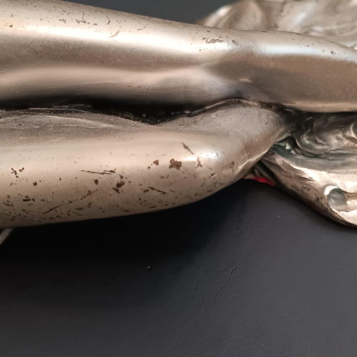The statue is very light and has an almost metallic surface that feels like it could be a thin coating over another material. Possibly a very light aluminum cast or something similar.