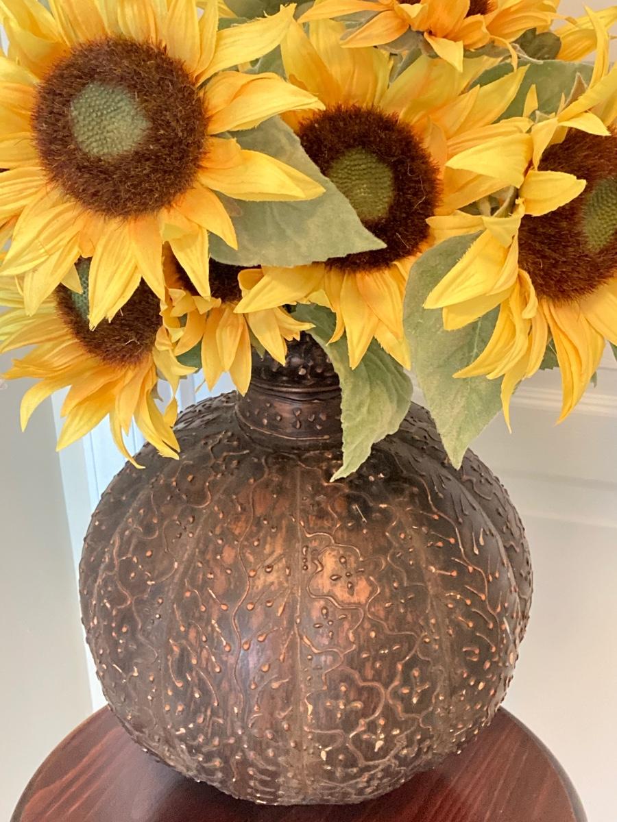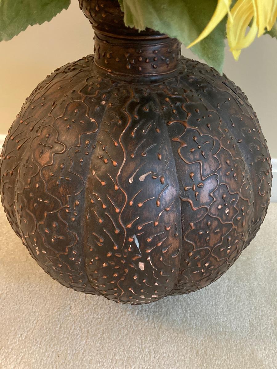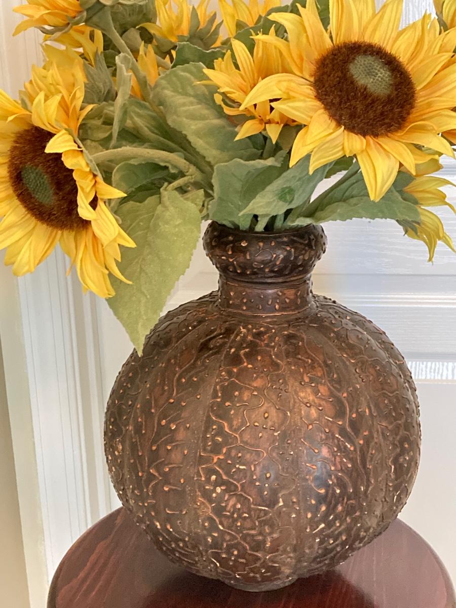 LOT 56U: Round Wood Accent Table with Metal Copper Tone Relief Vase and Faux Sunflowers