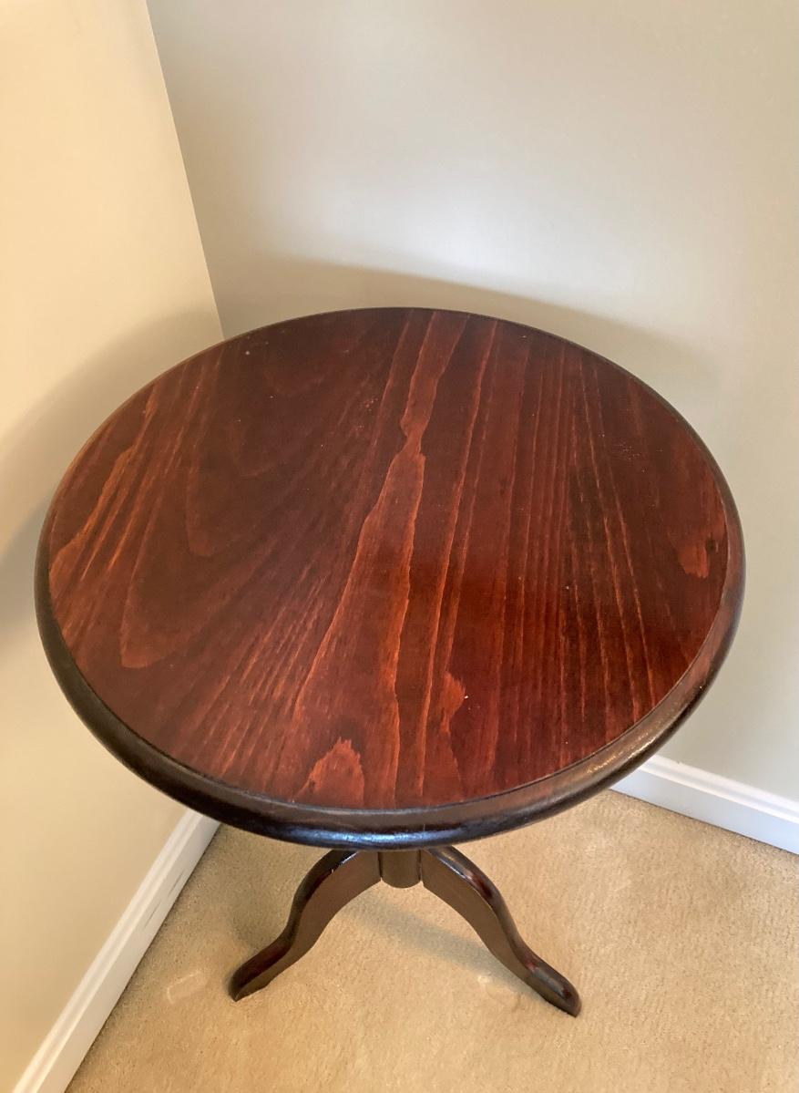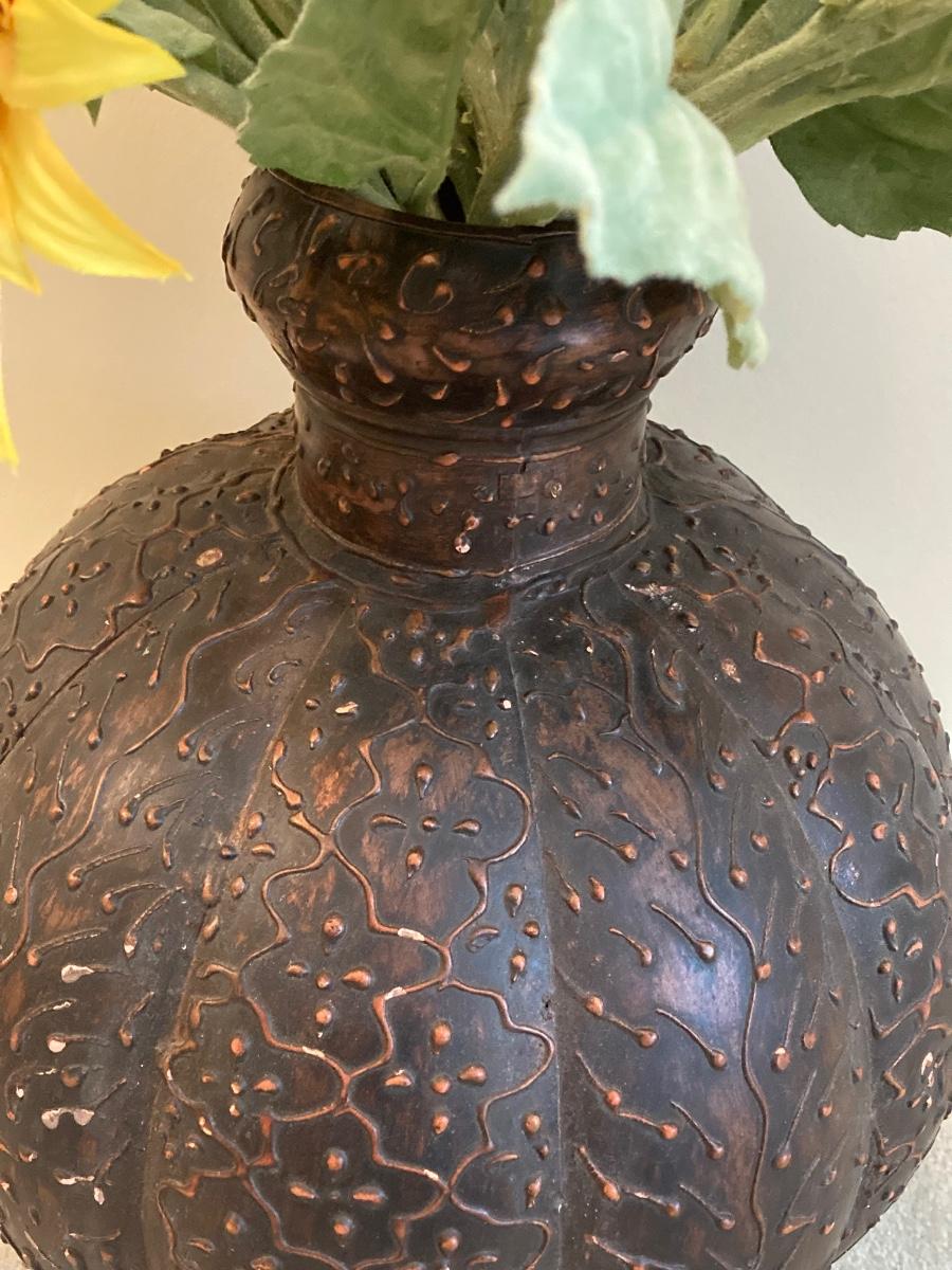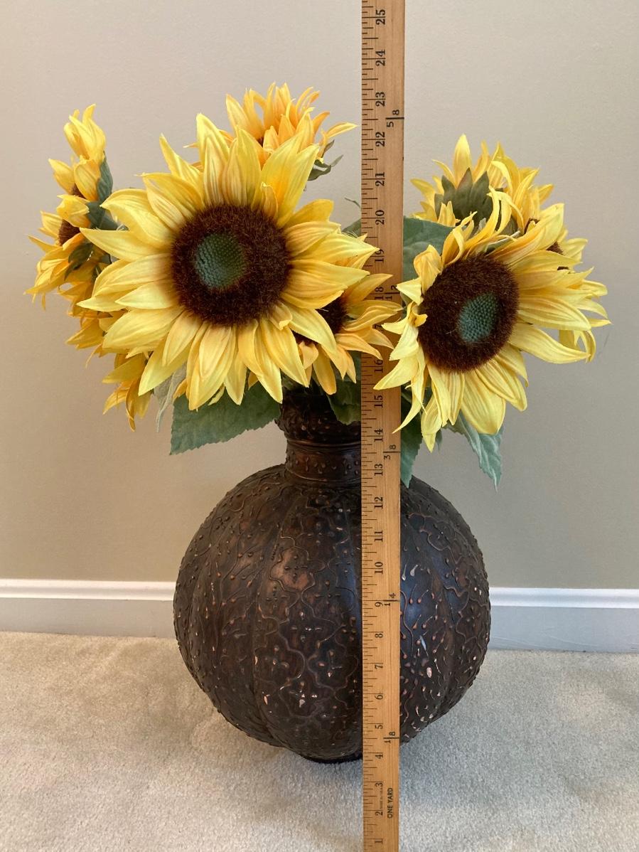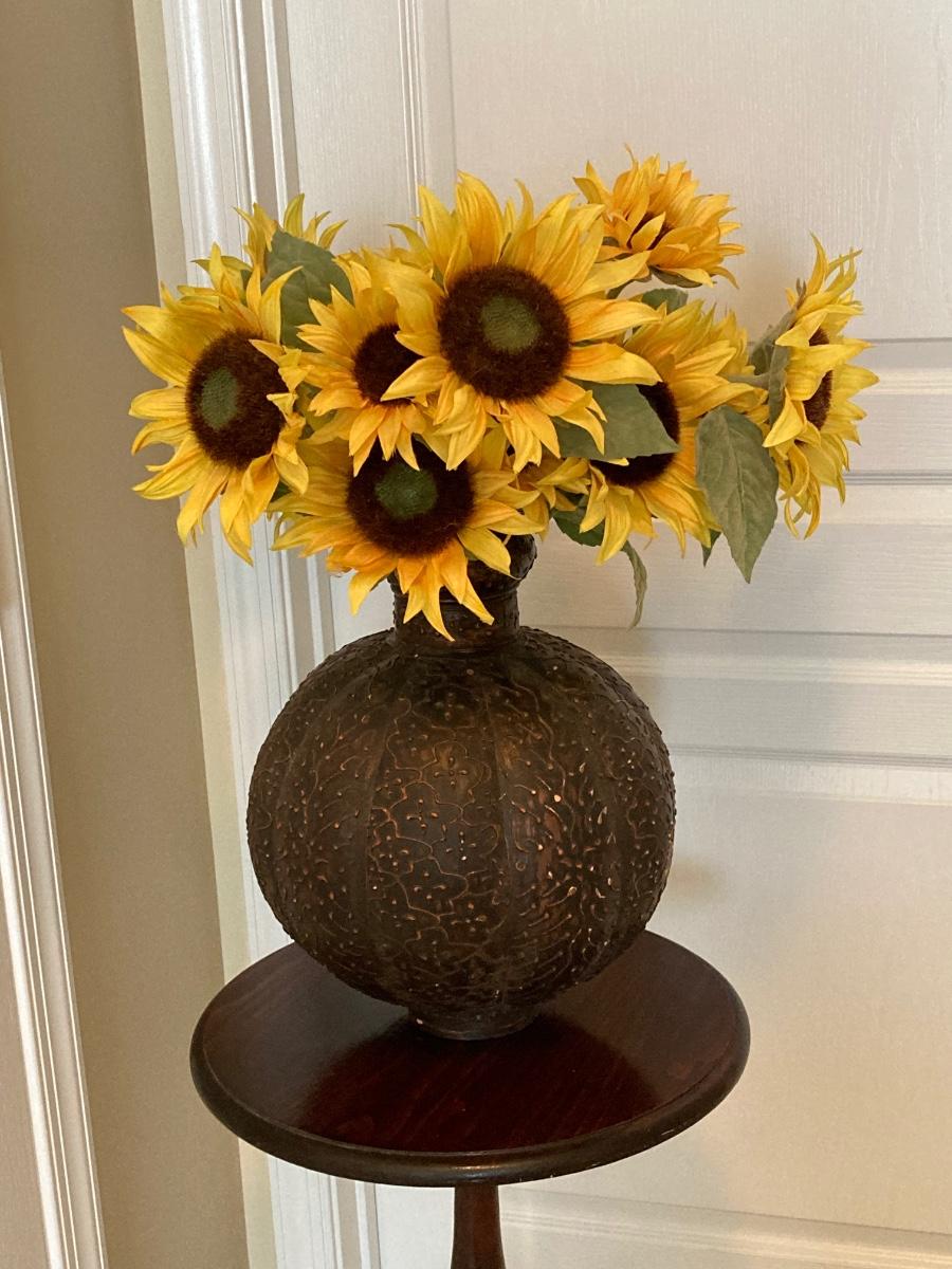 LOT 56U: Round Wood Accent Table with Metal Copper Tone Relief Vase and Faux Sunflowers