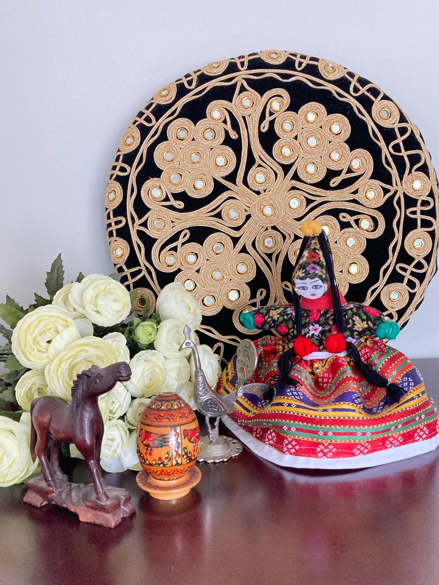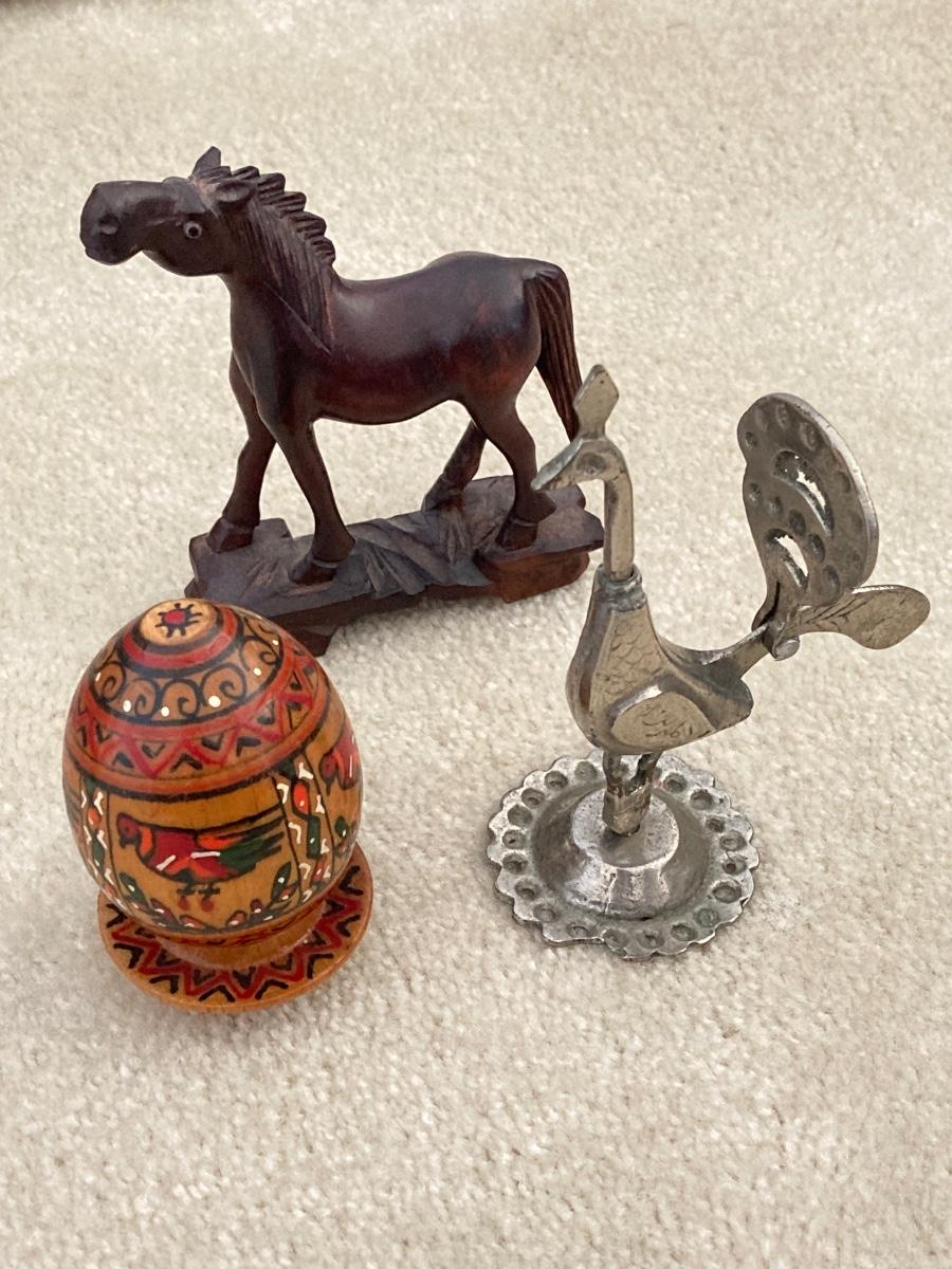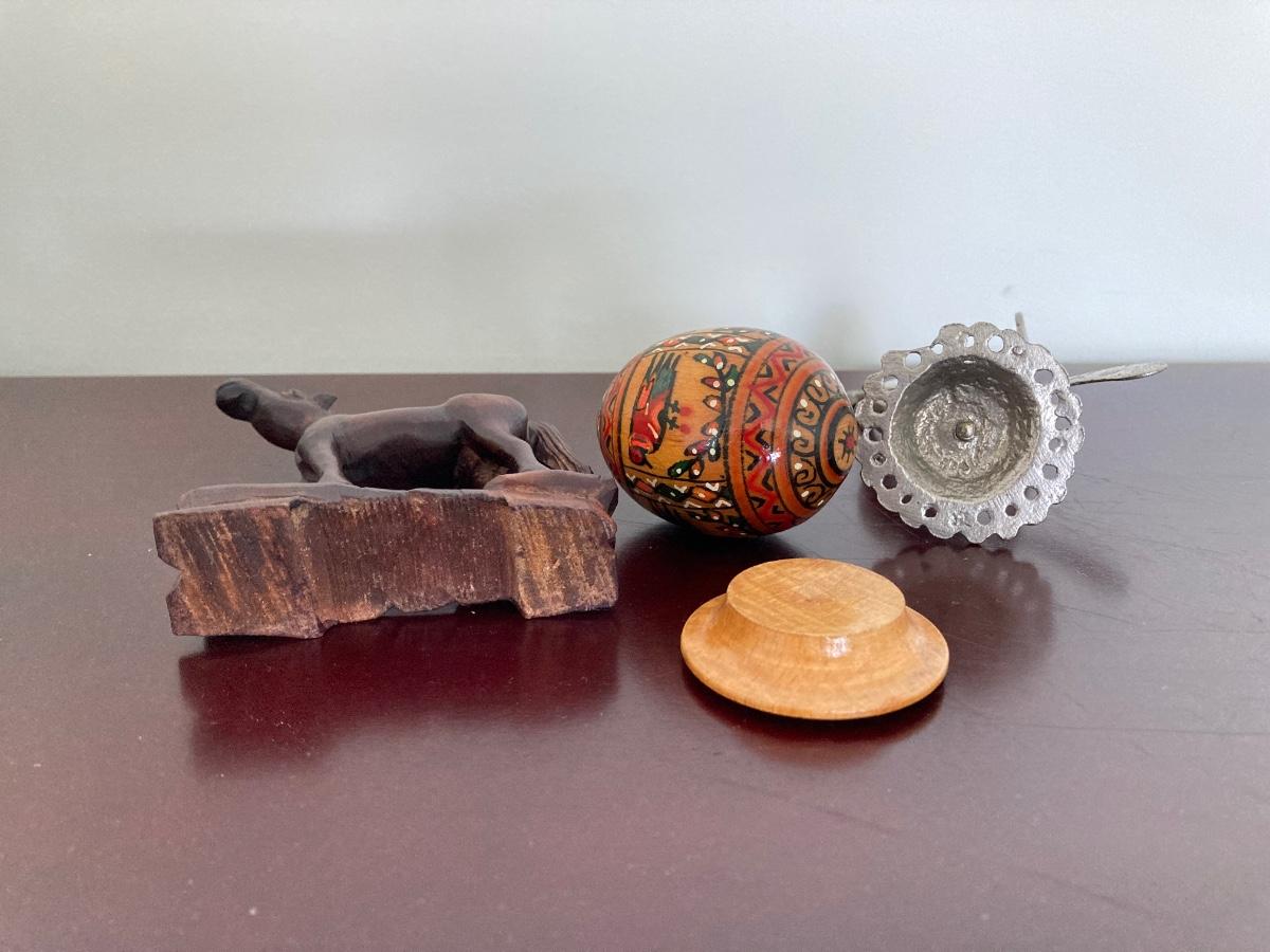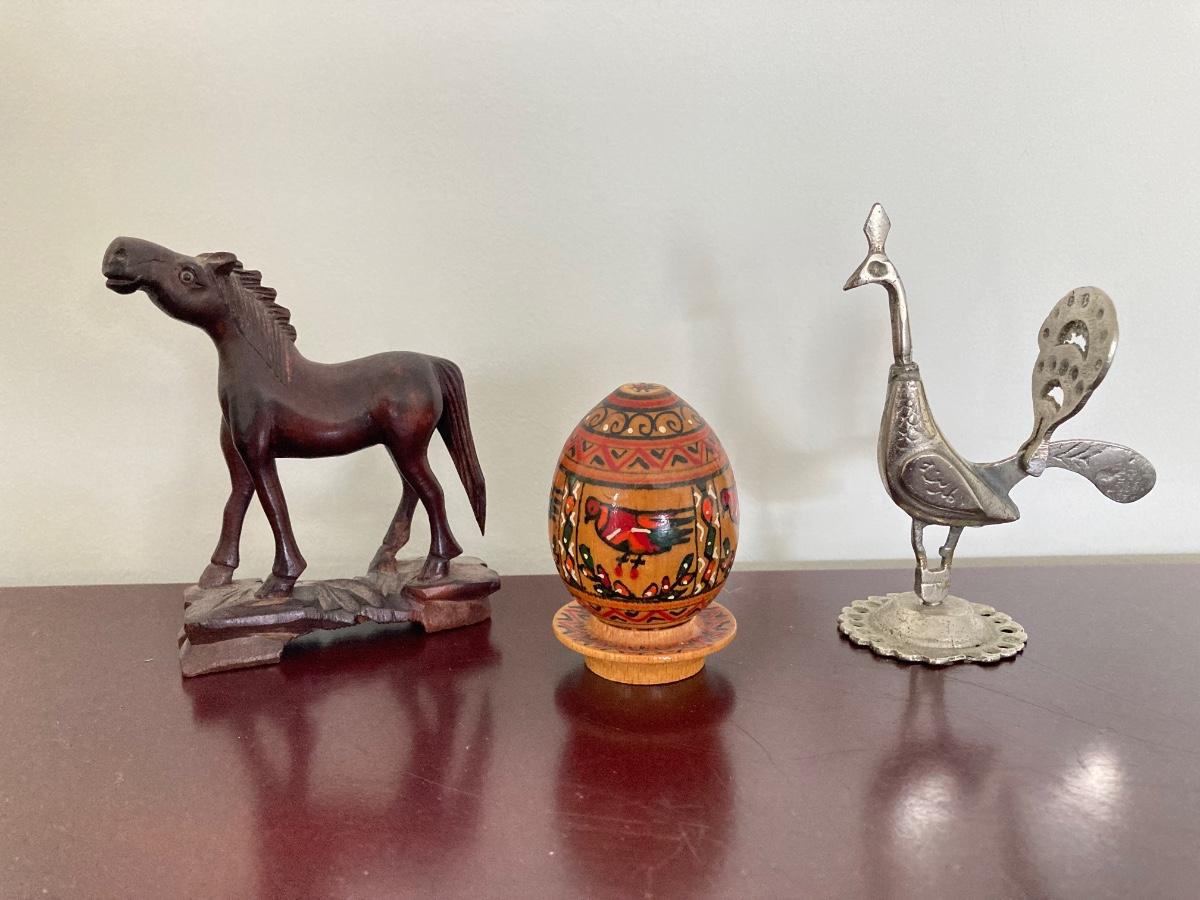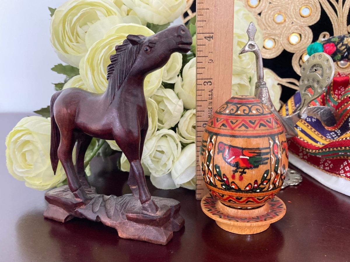 LOT 67U: Hand Crafted Collection and More - Folk Art Doll, Round Bohemian Style Pillow, Wooden Egg, Carved Horse and Peacock Figurine