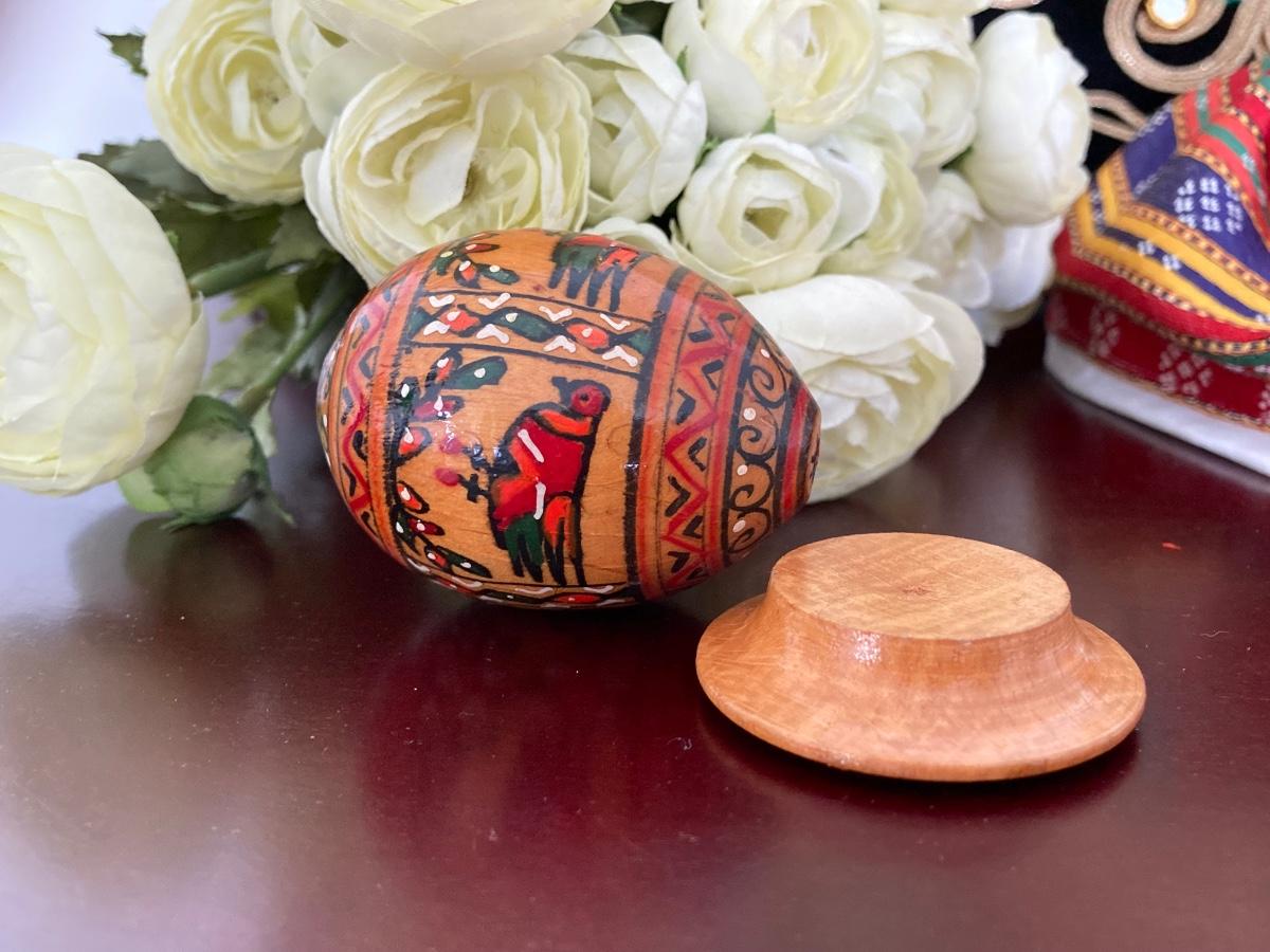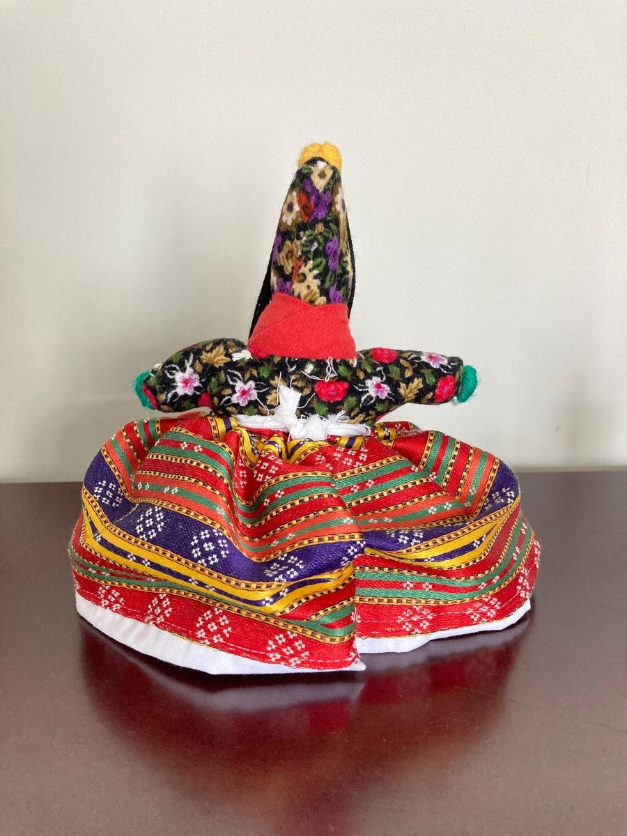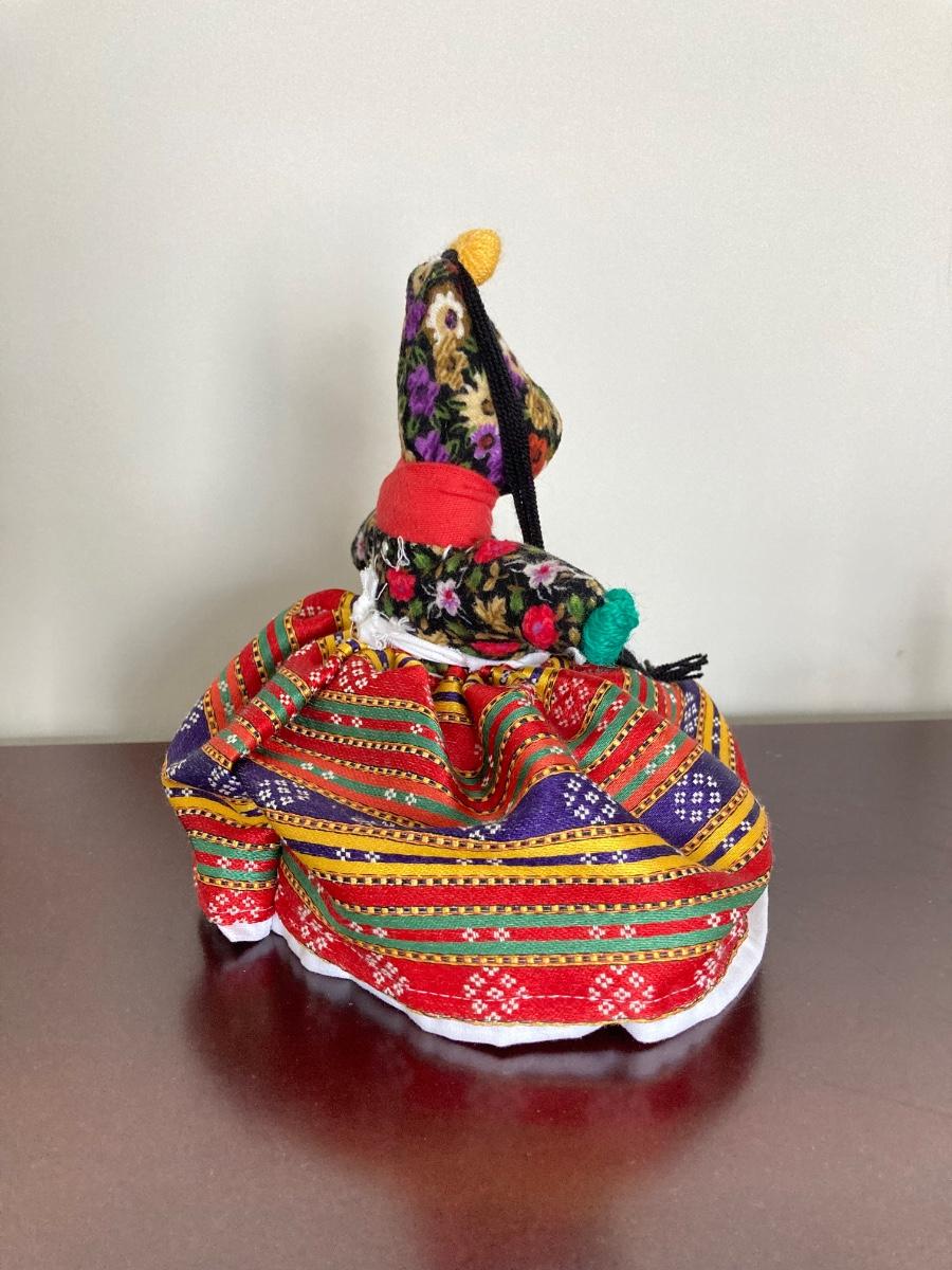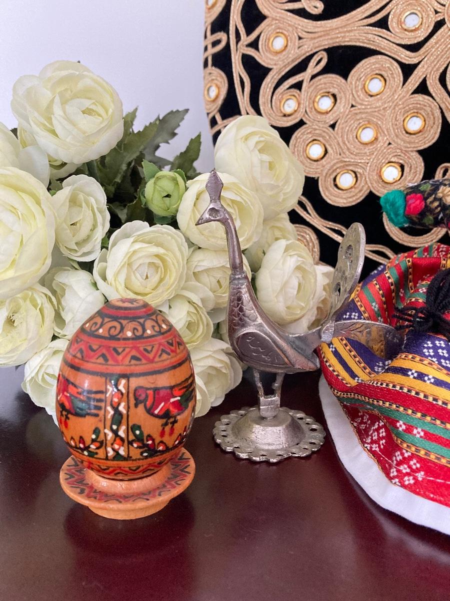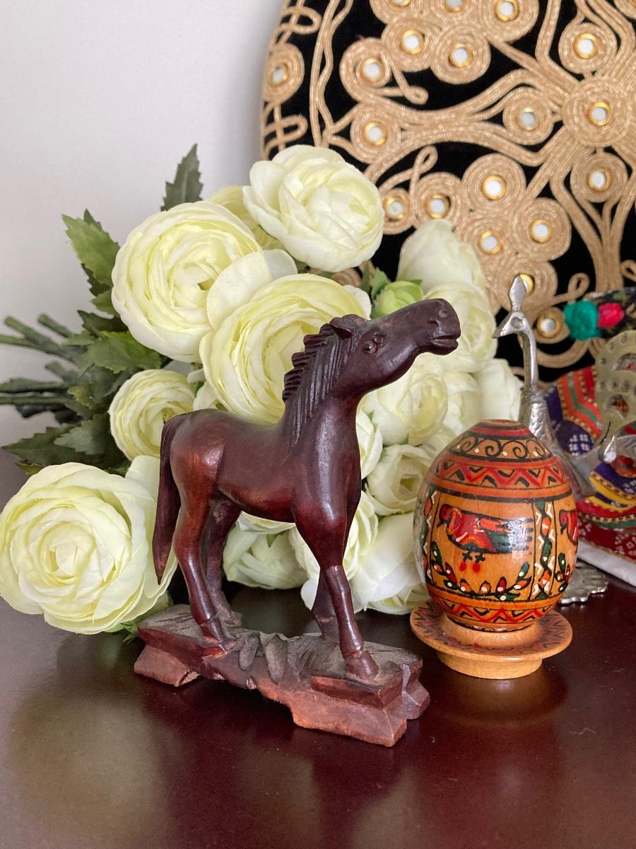 LOT 67U: Hand Crafted Collection and More - Folk Art Doll, Round Bohemian Style Pillow, Wooden Egg, Carved Horse and Peacock Figurine