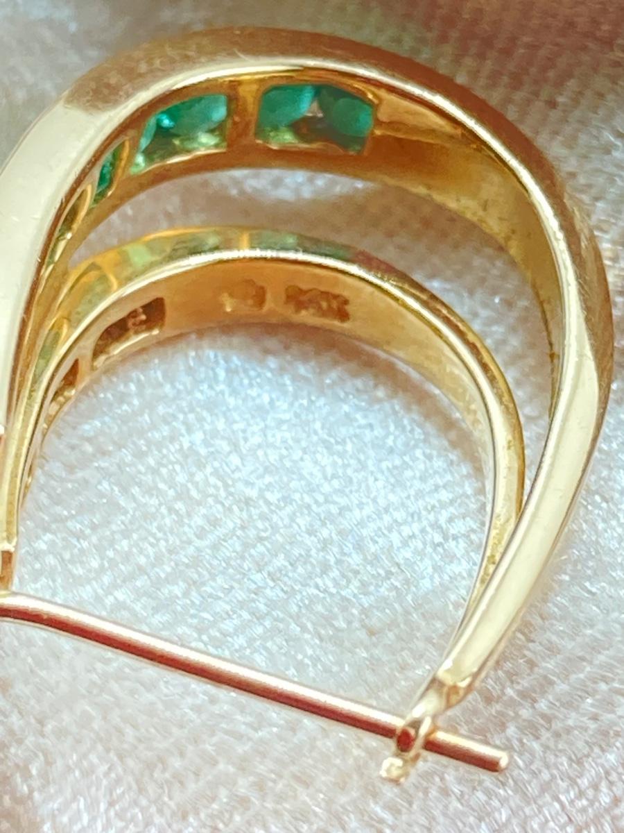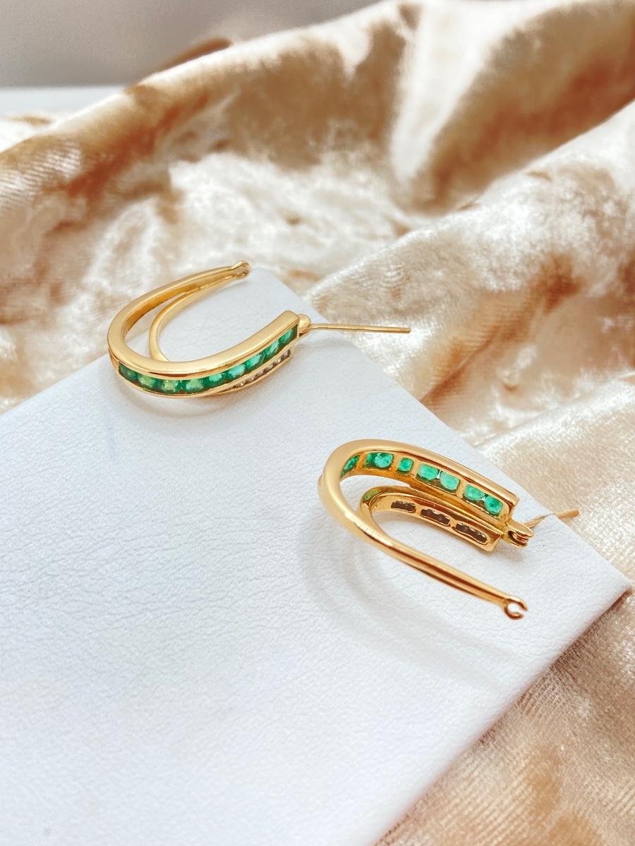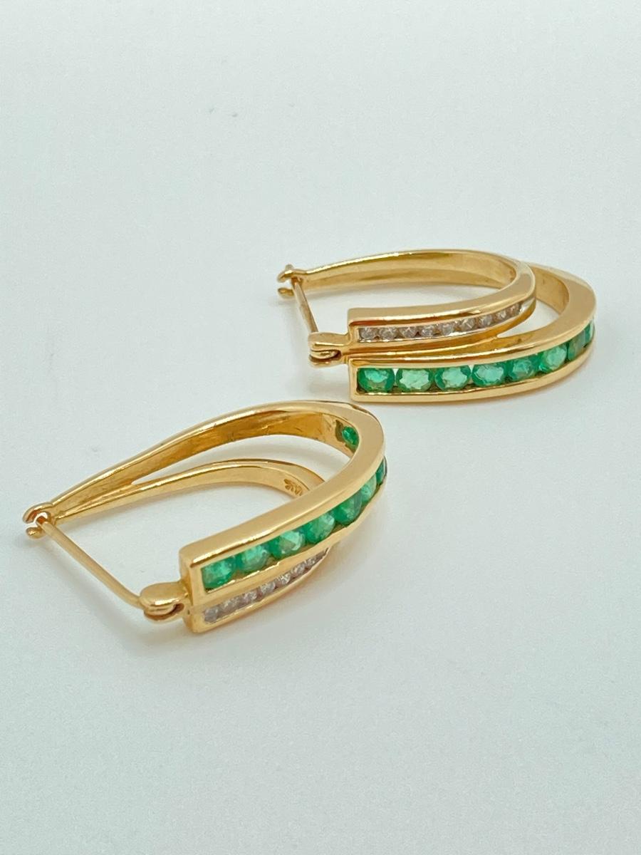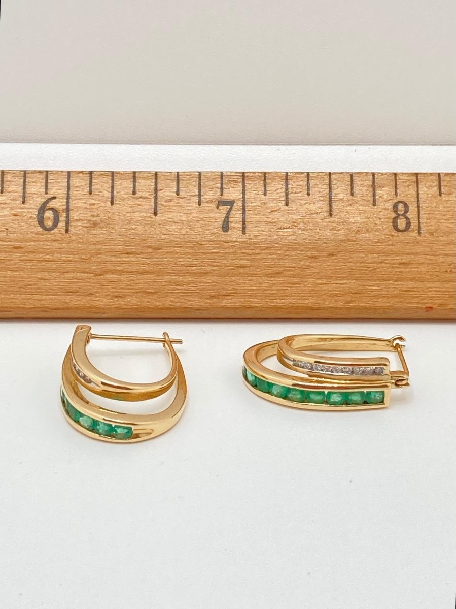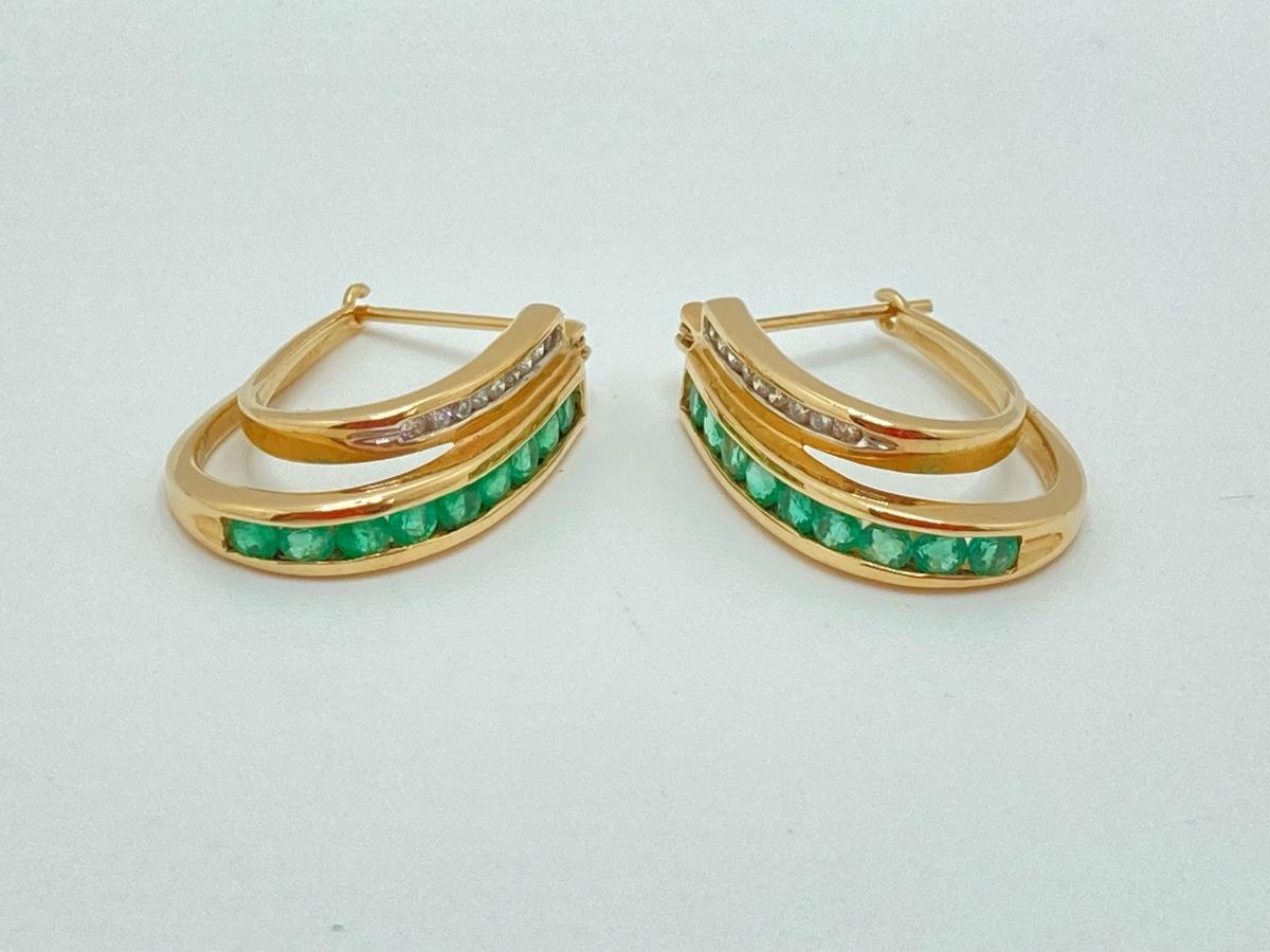 LOT 75J: Gold / Diamond / Emerald Half Hoop Oblong Pierced Earrings 14K, TW 6.2g