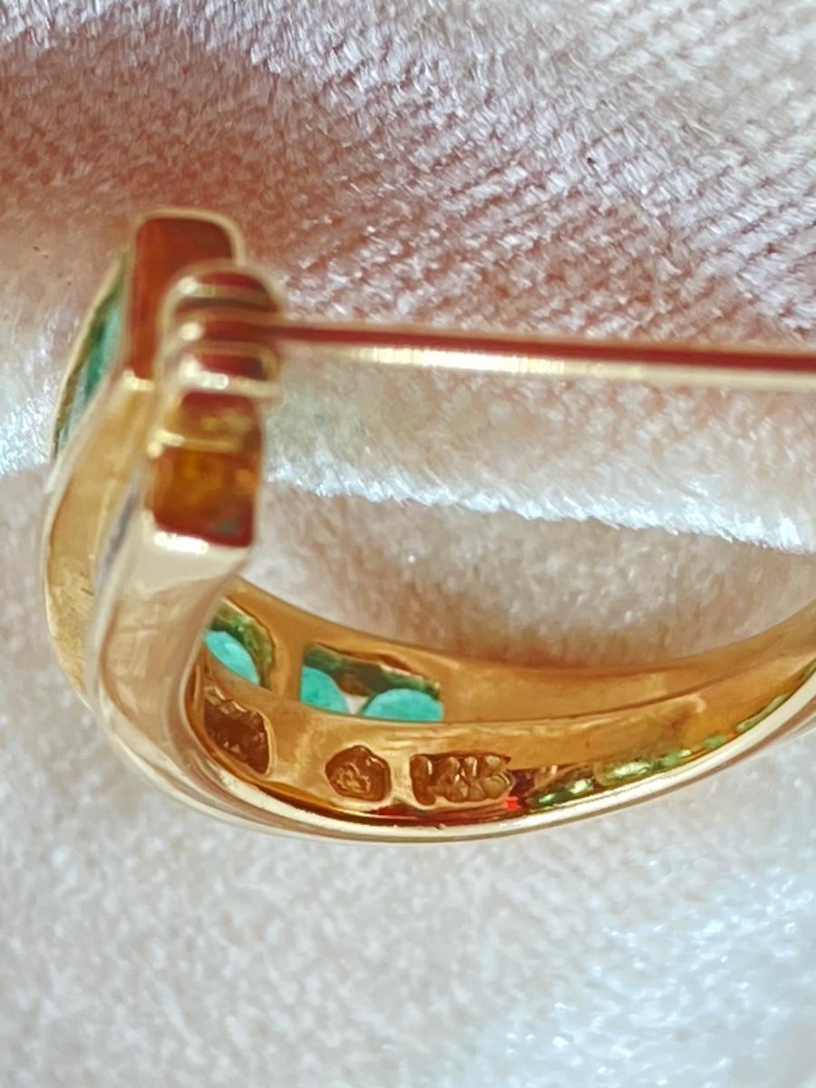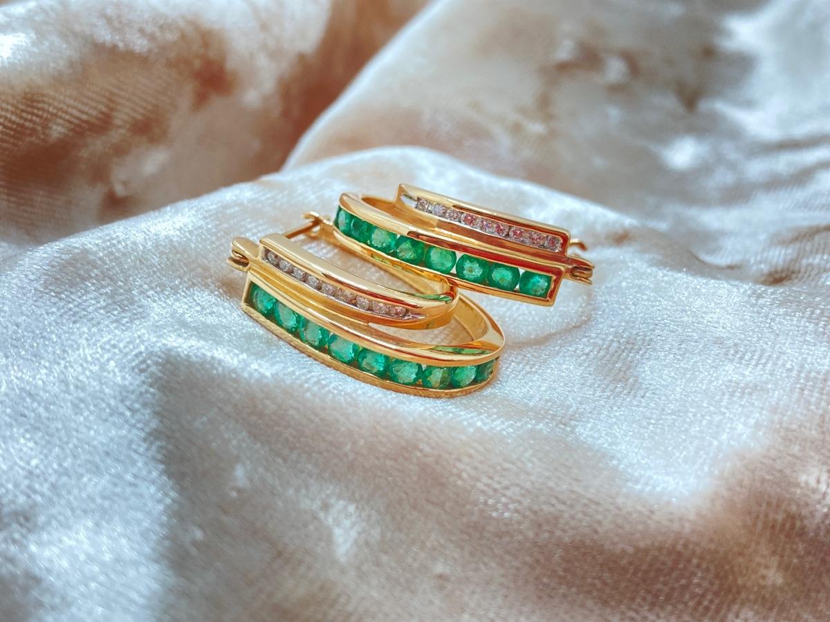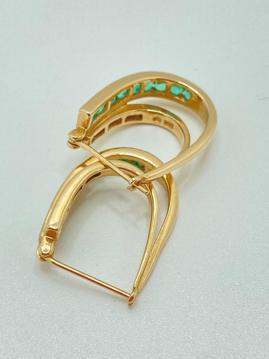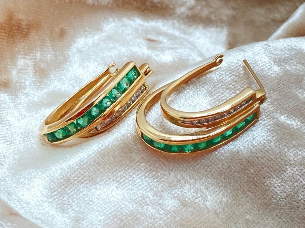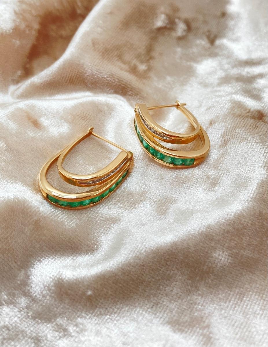 LOT 75J: Gold / Diamond / Emerald Half Hoop Oblong Pierced Earrings 14K, TW 6.2g
