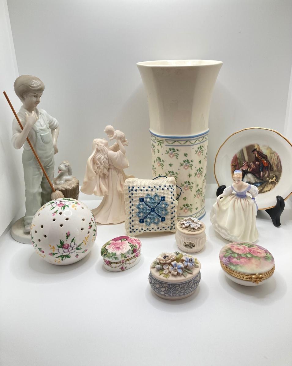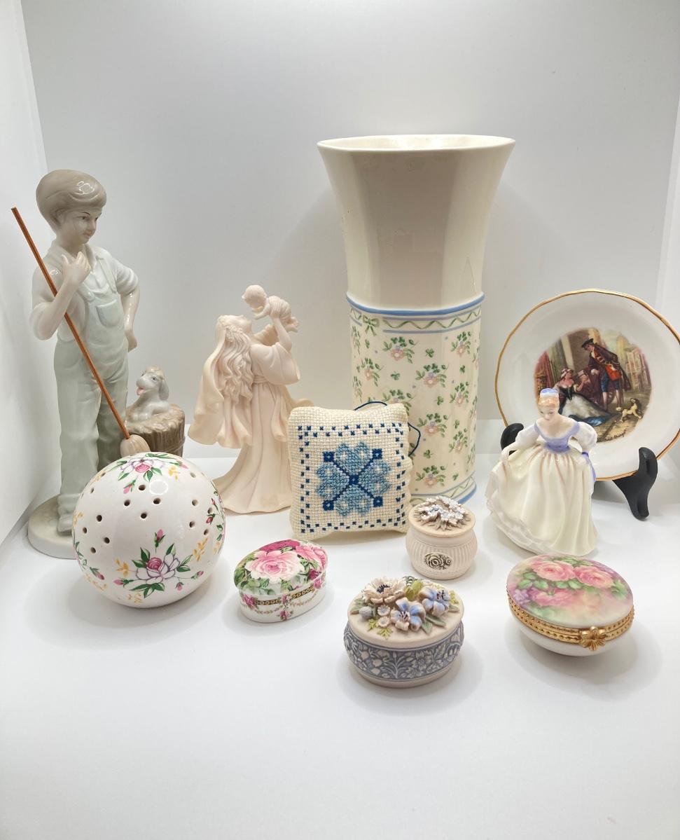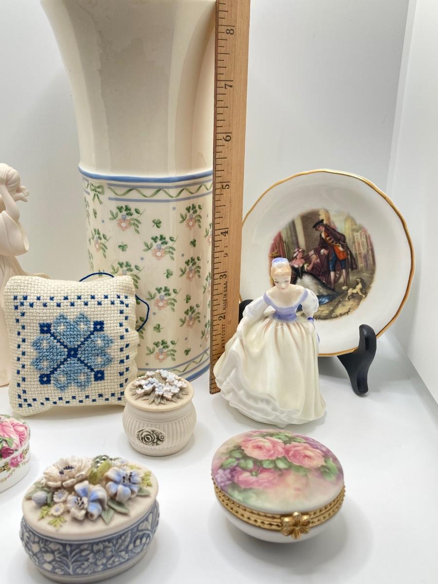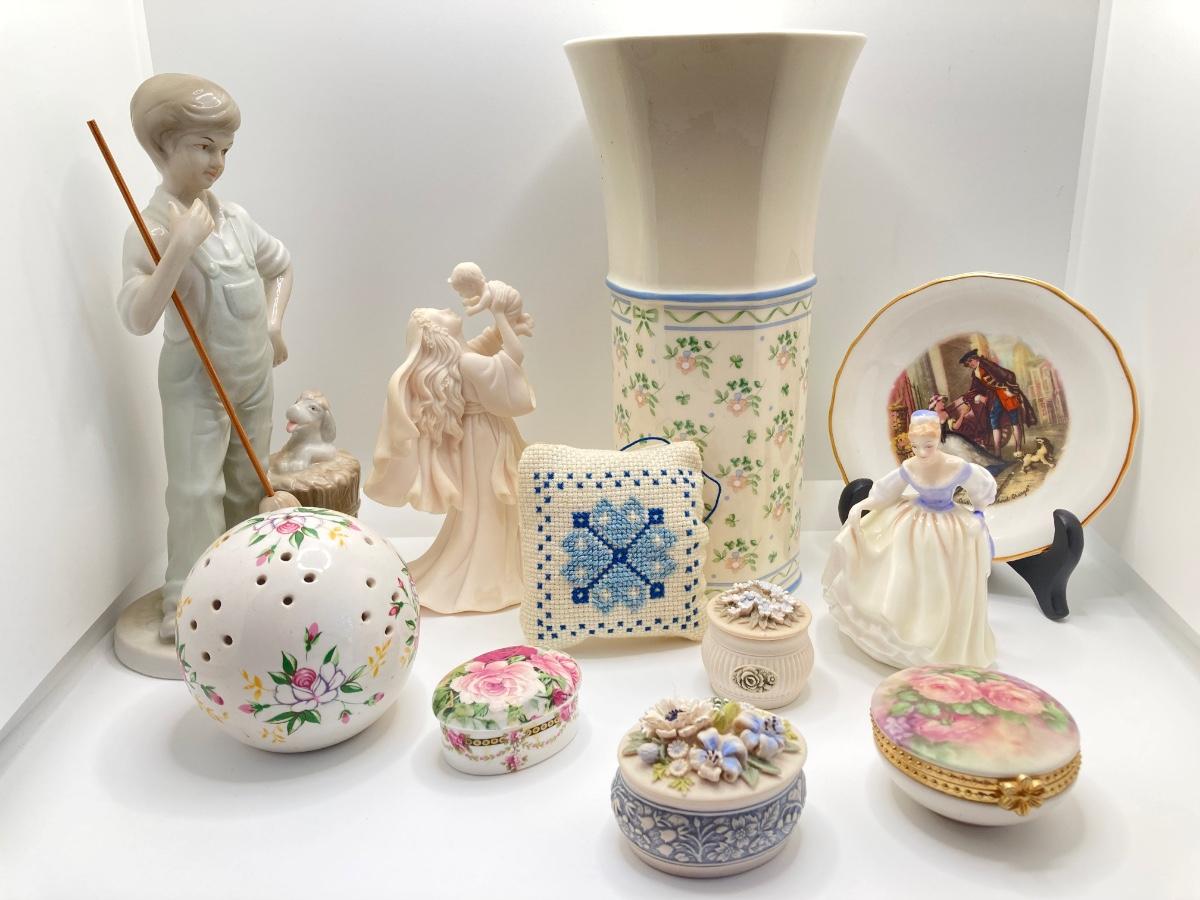 LOT 112D: Decorative Hand Decorated Collection - Royal Doulton and Millenium "Cause of Our Joy" Figurines, Ireland Vase, Royal Grafton Plate, Trinket Boxes and More