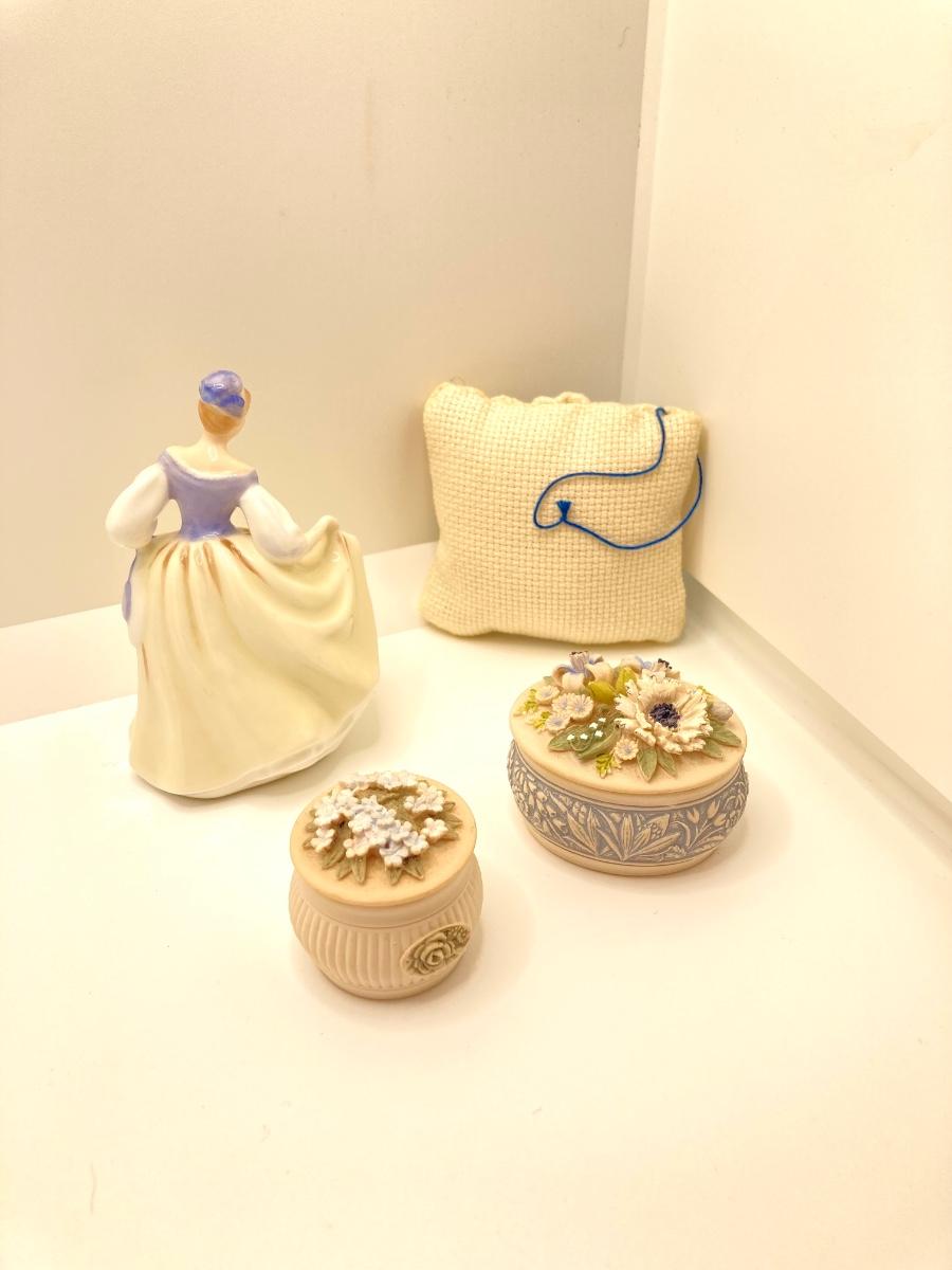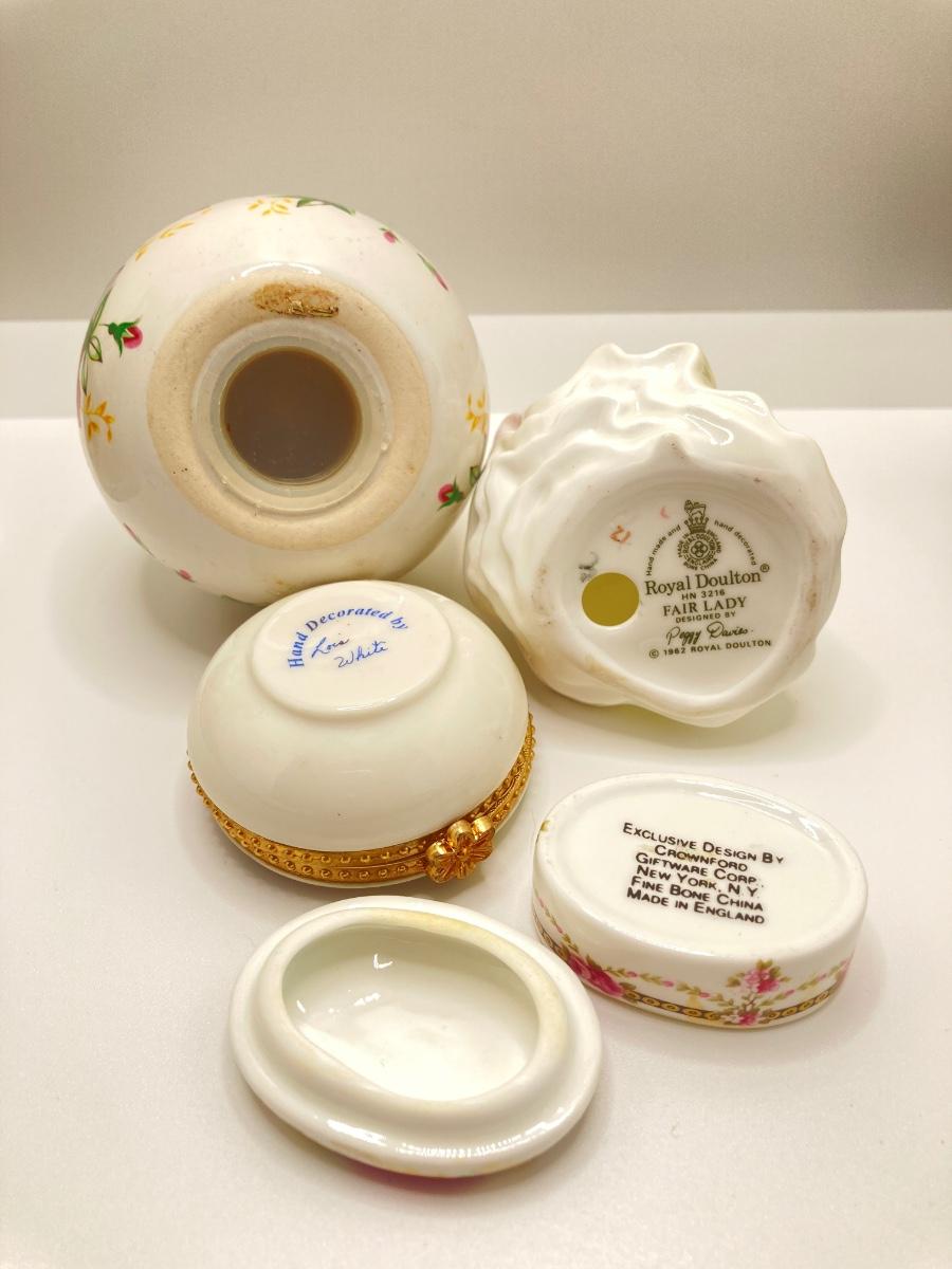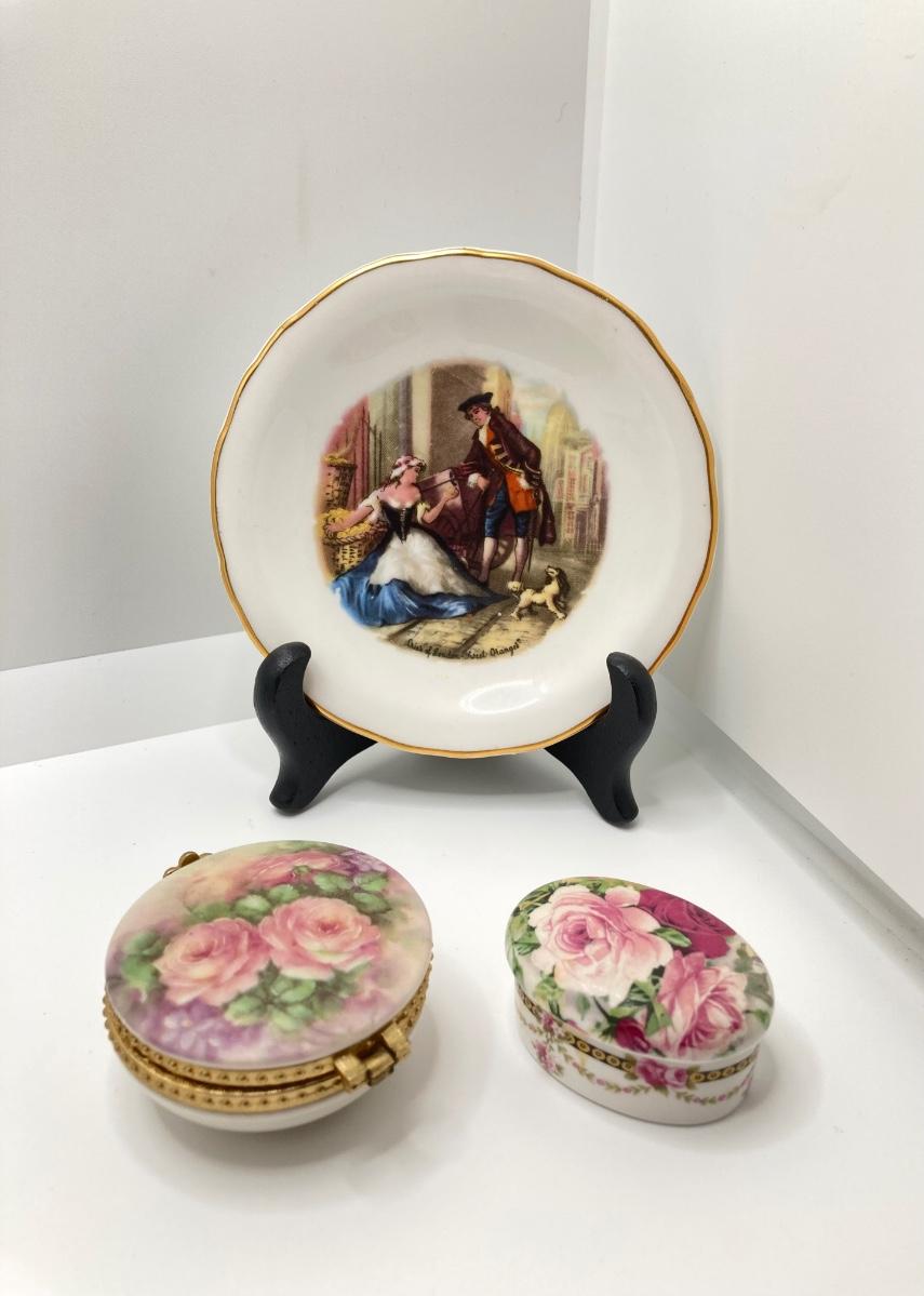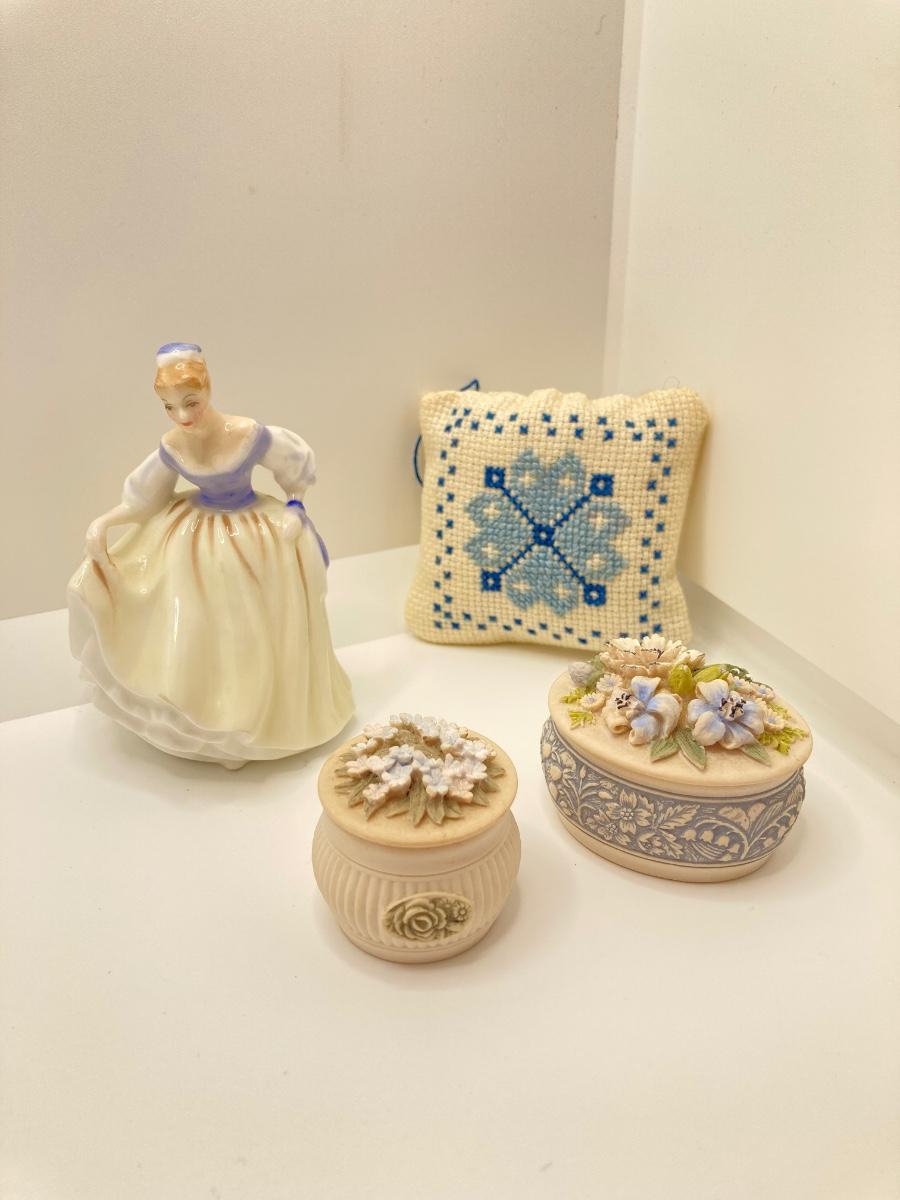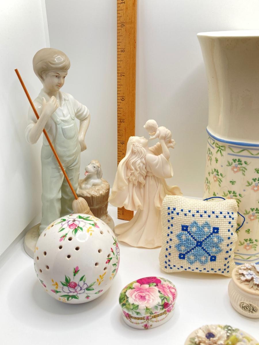 LOT 112D: Decorative Hand Decorated Collection - Royal Doulton and Millenium "Cause of Our Joy" Figurines, Ireland Vase, Royal Grafton Plate, Trinket Boxes and More