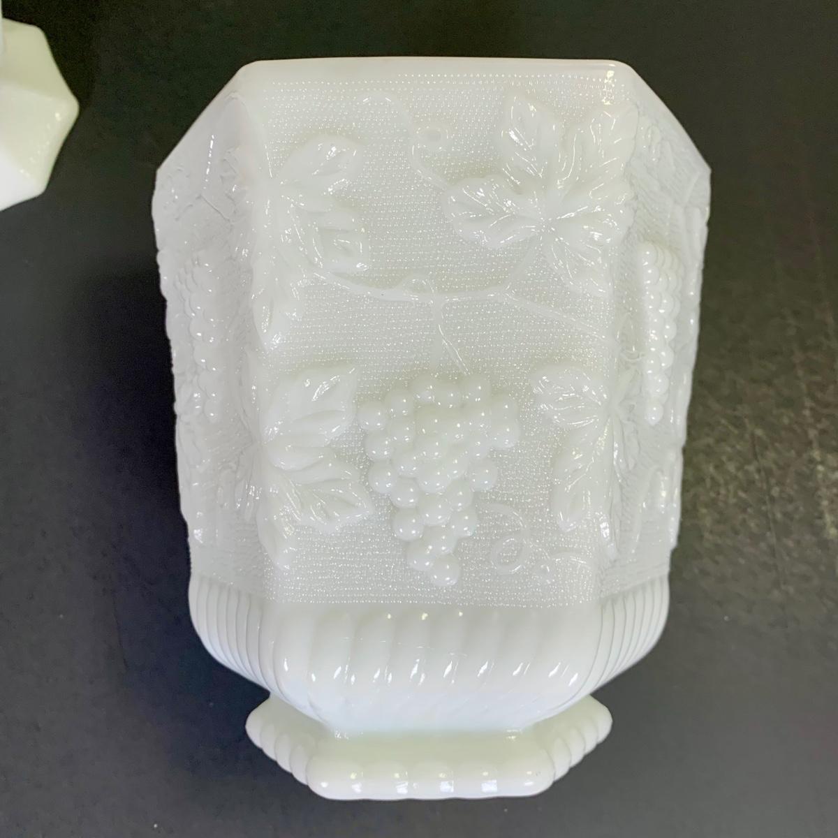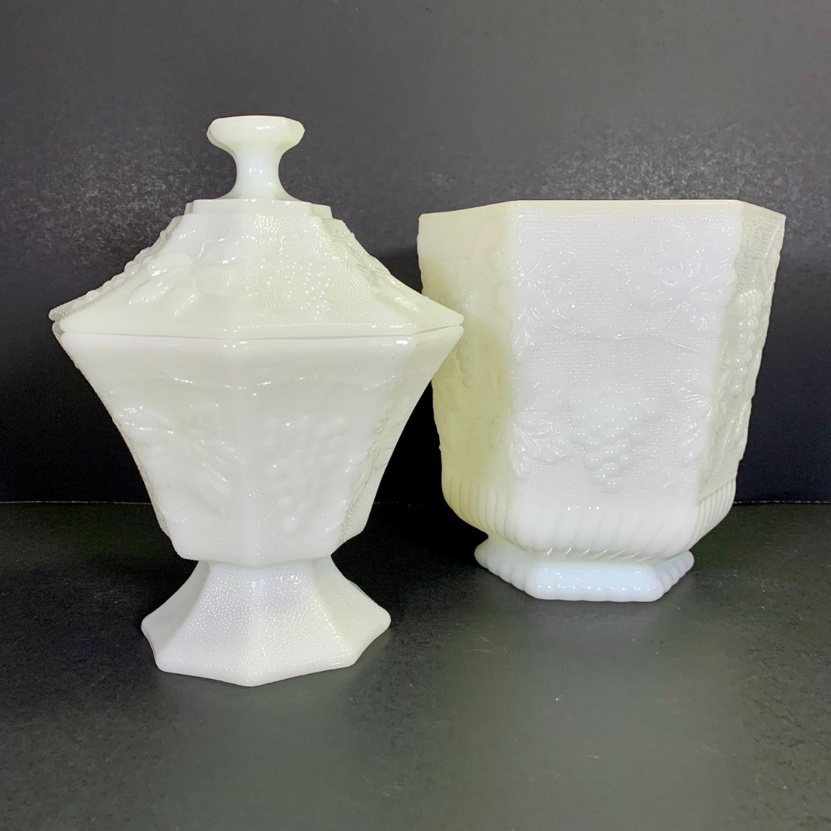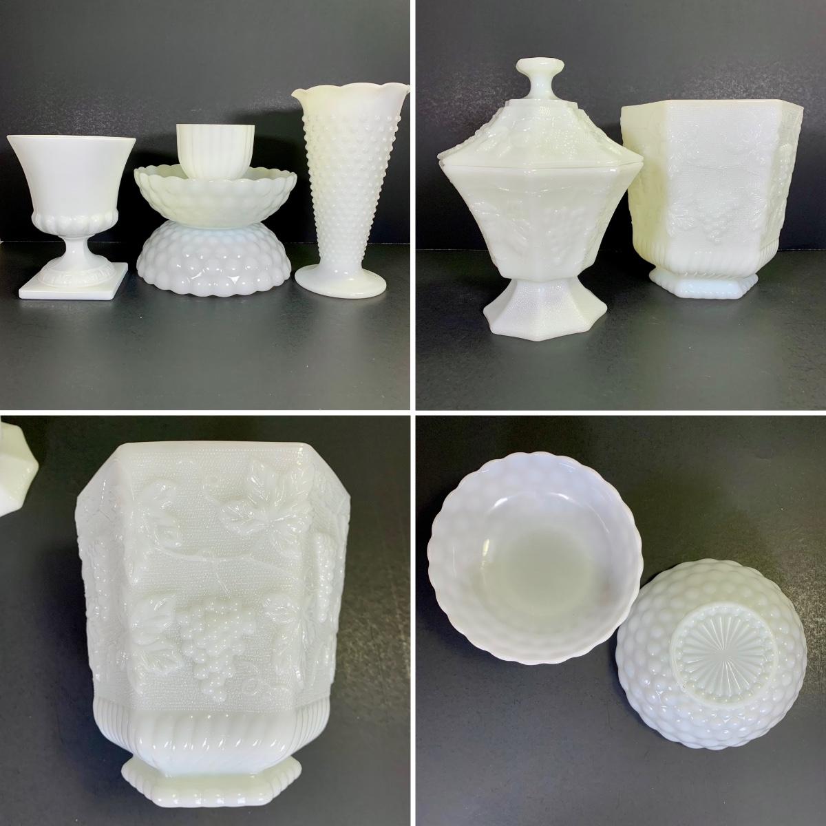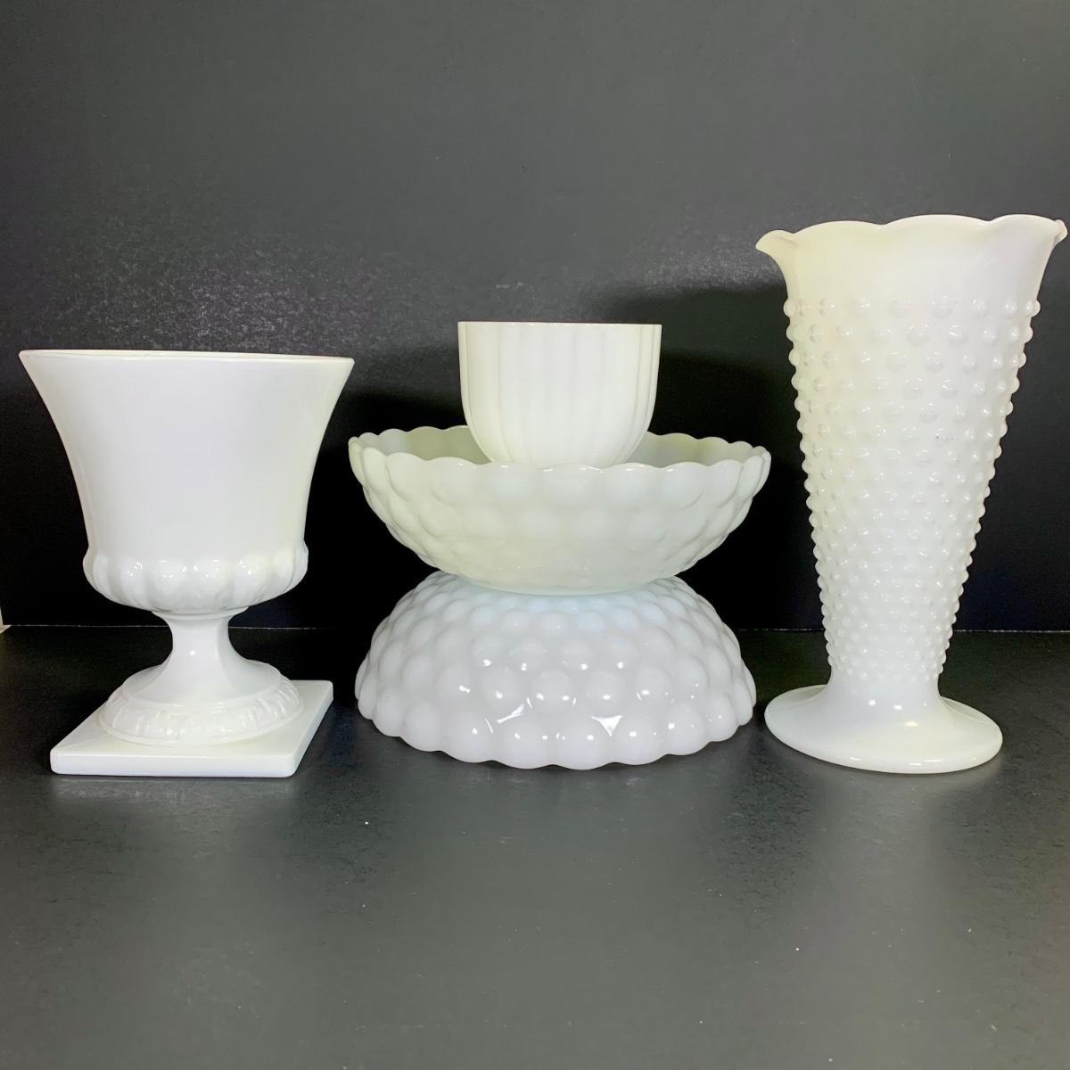 LOT 61: Vintage Milk Glass Anchor Hocking Bubble Bowl, Hobnail Vase, E.O. Brody Compote, Anchor Hocking Fire-King Jar, Vase, & More