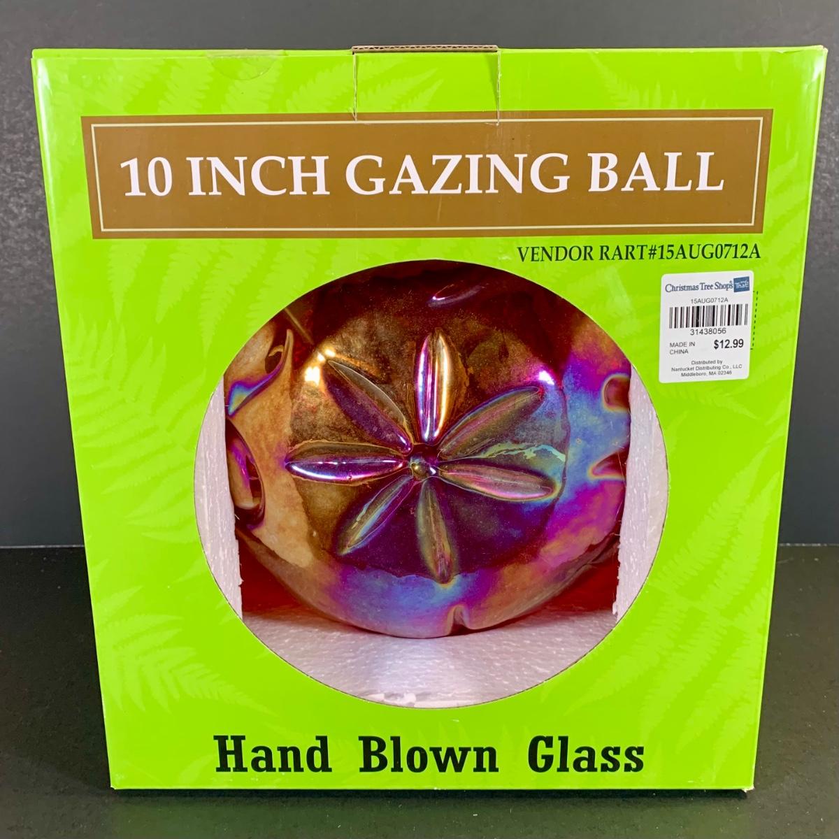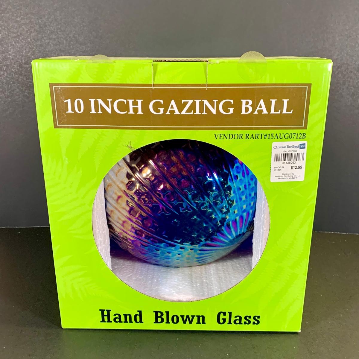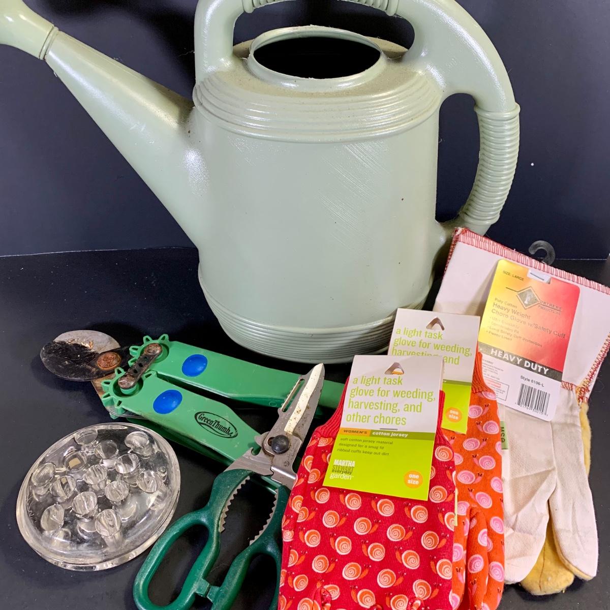 LOT 66: Garden Collection: NIP 2 Hand Blown Gazing Balls, NIP Mosaic Glass Bird Feeder, Watering Can, NIP Gardening Gloves & More