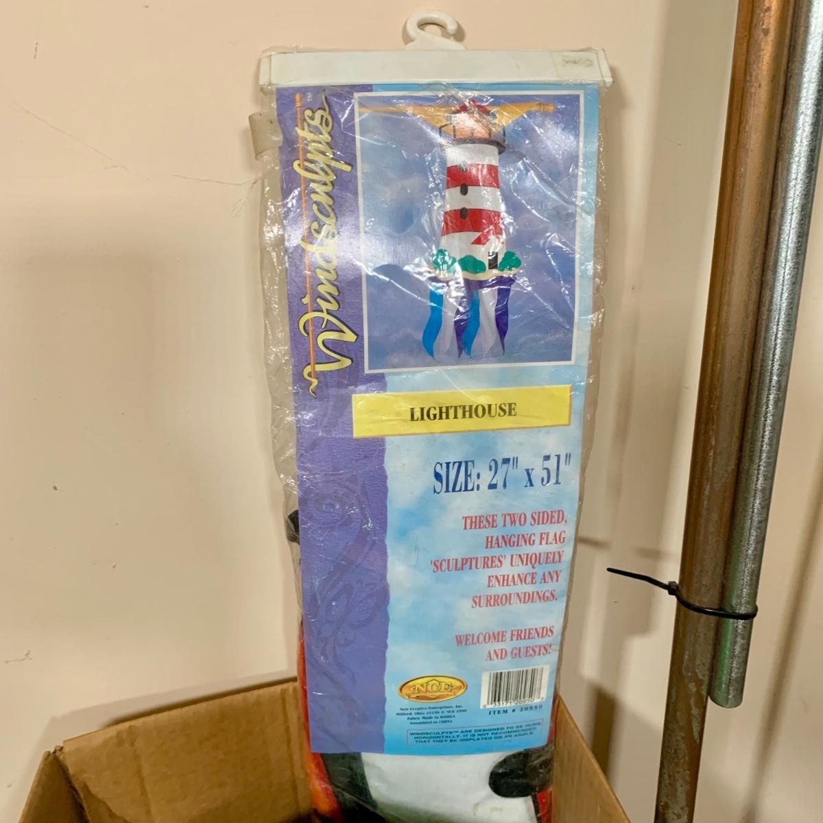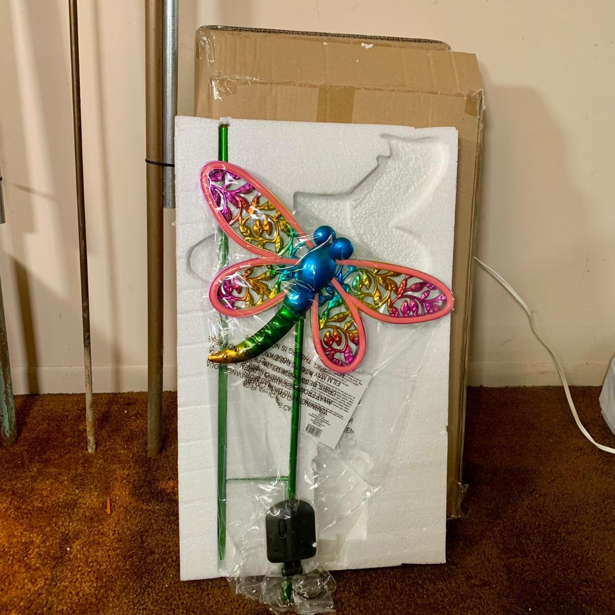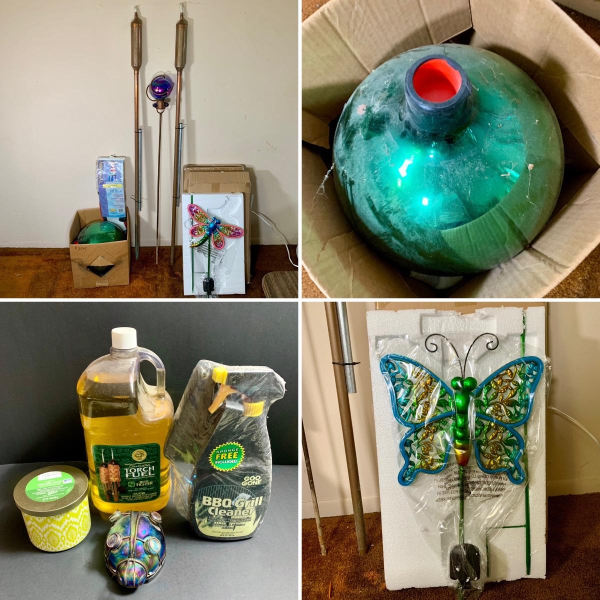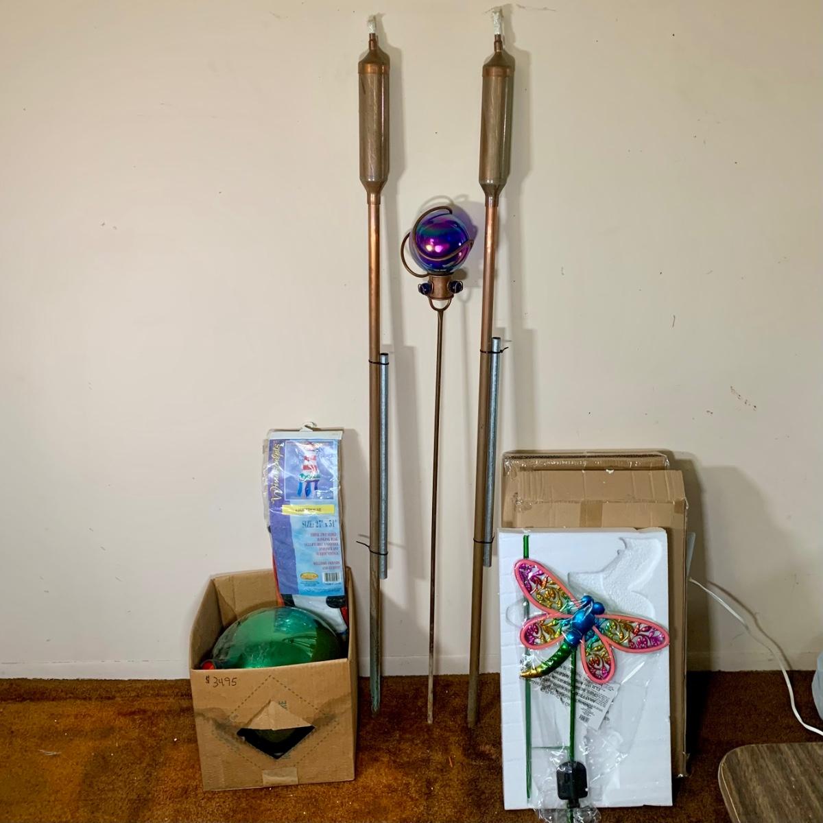 LOT 67: Yard Decor: Brass Torches w/ Citronella Torch Fuel, NIP Solar Neon Dragonfly & Butterfly Stakes, Windsculpts Lighthouse Flag, & More