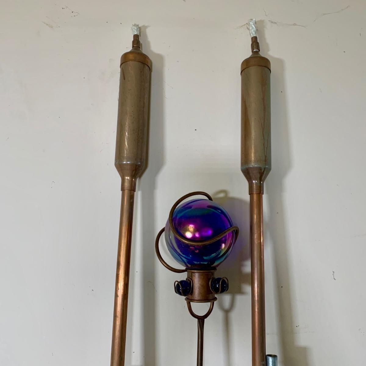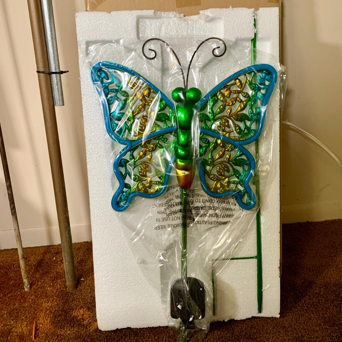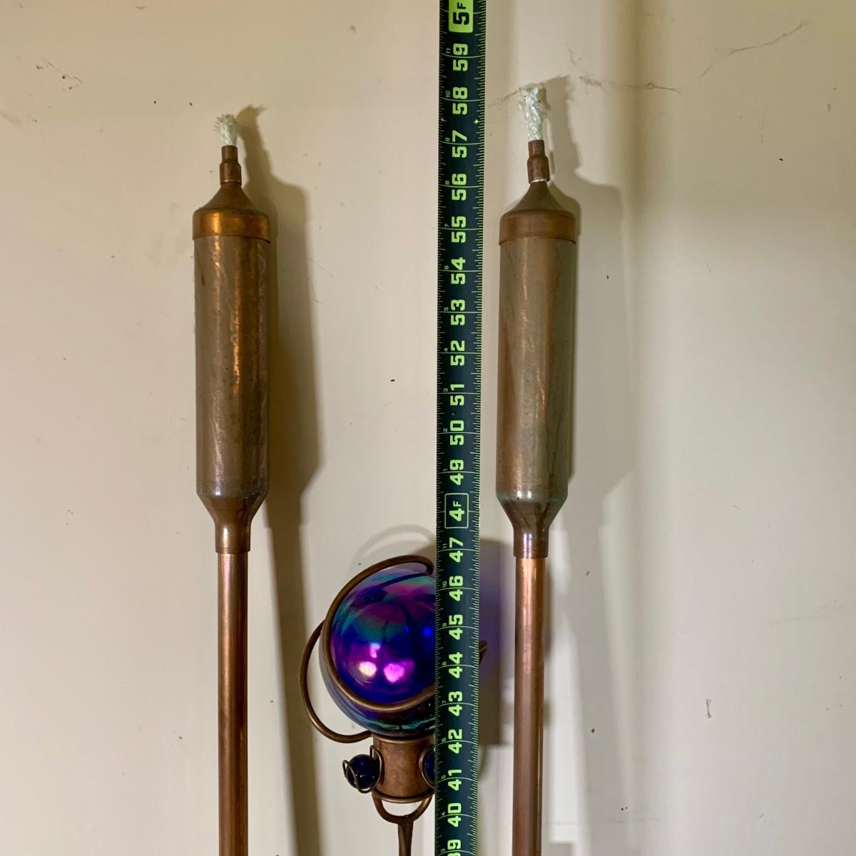 LOT 67: Yard Decor: Brass Torches w/ Citronella Torch Fuel, NIP Solar Neon Dragonfly & Butterfly Stakes, Windsculpts Lighthouse Flag, & More
