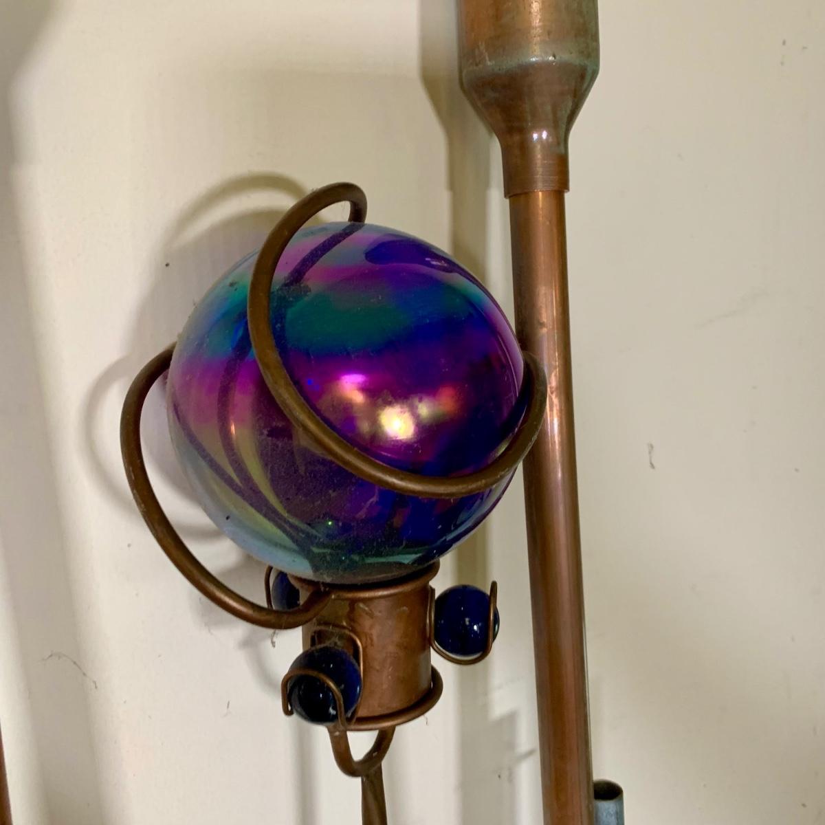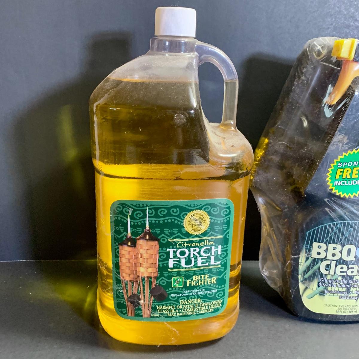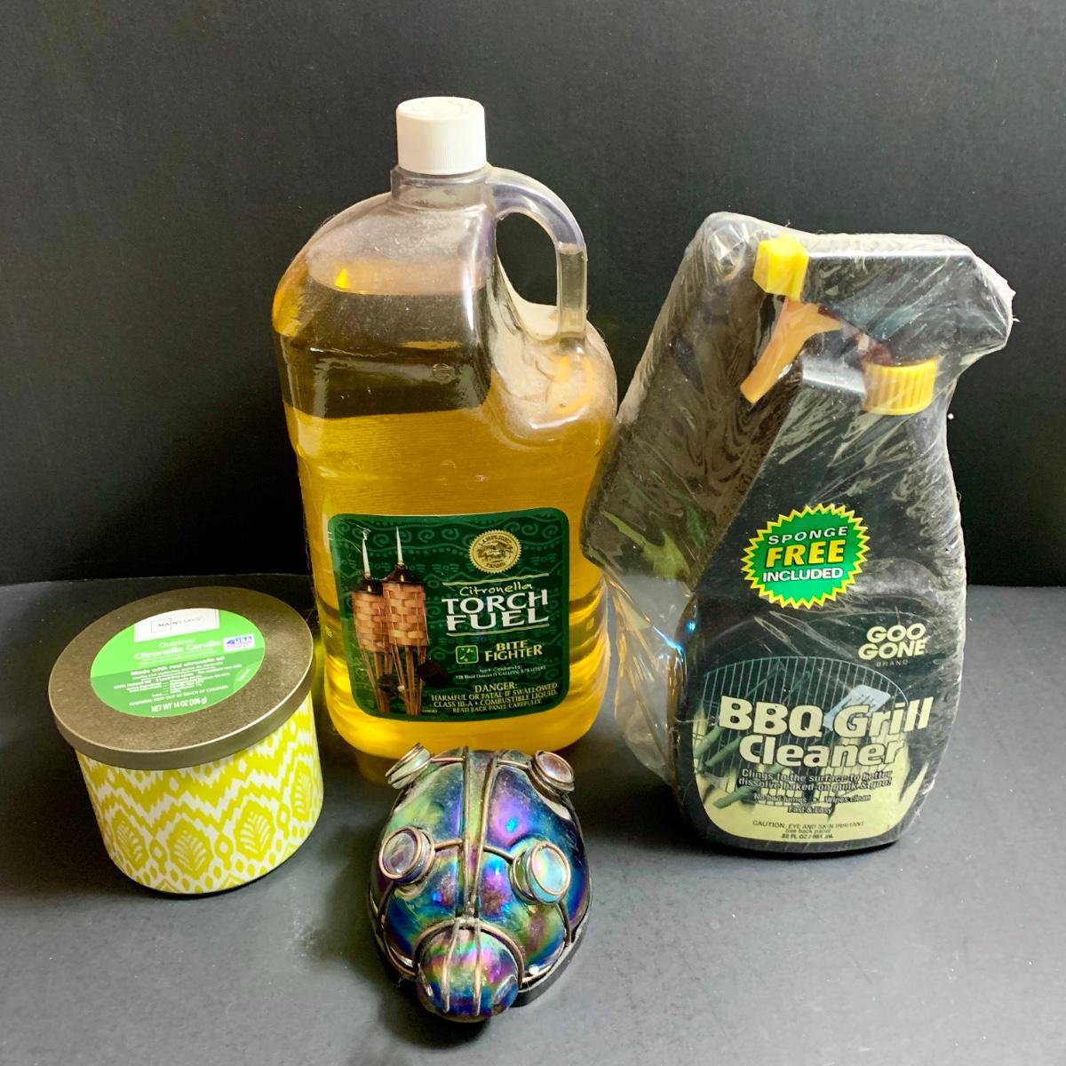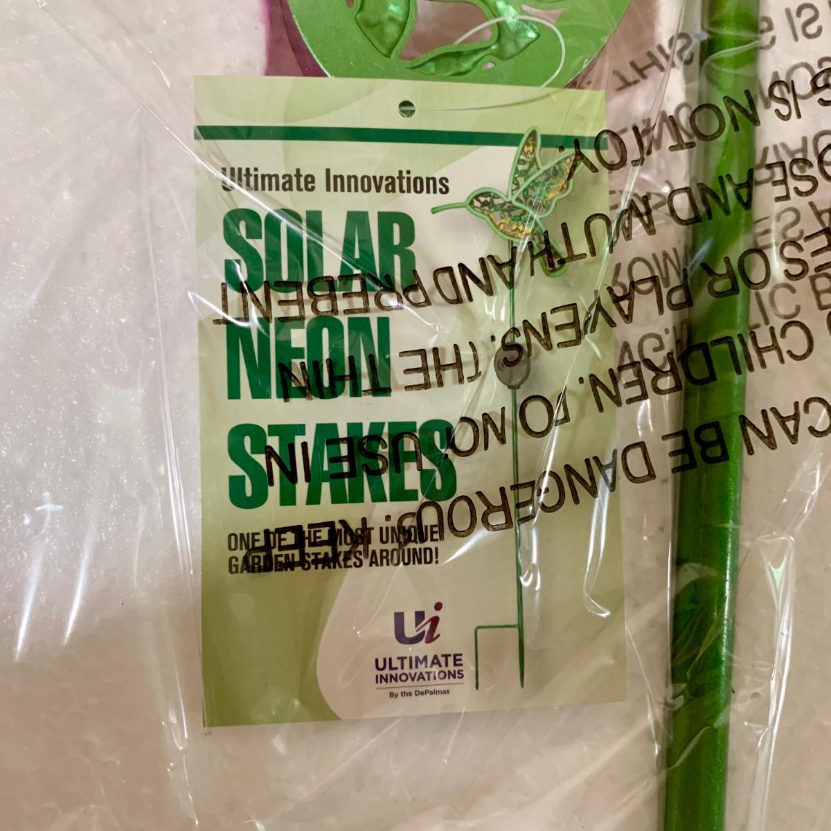 LOT 67: Yard Decor: Brass Torches w/ Citronella Torch Fuel, NIP Solar Neon Dragonfly & Butterfly Stakes, Windsculpts Lighthouse Flag, & More