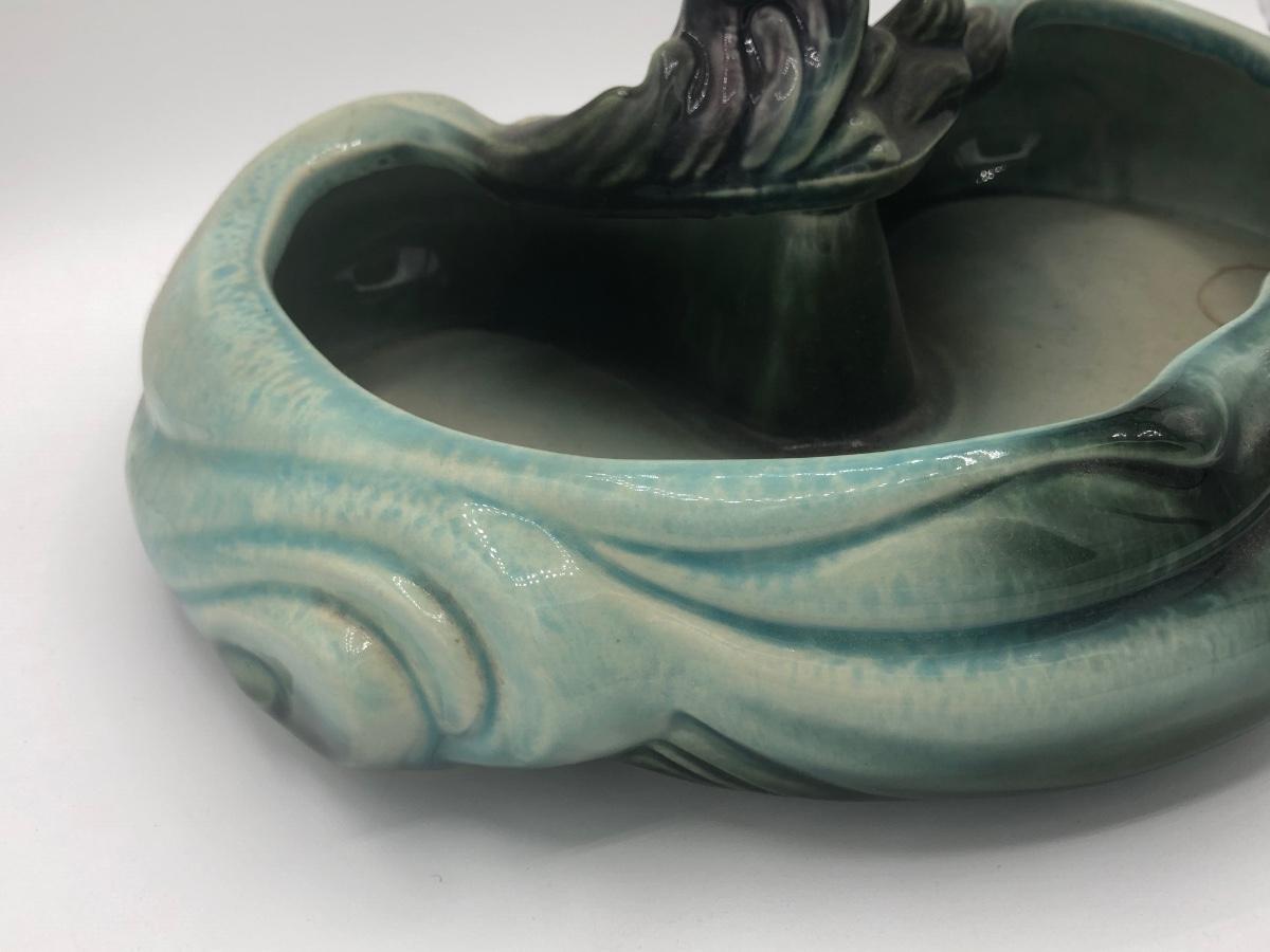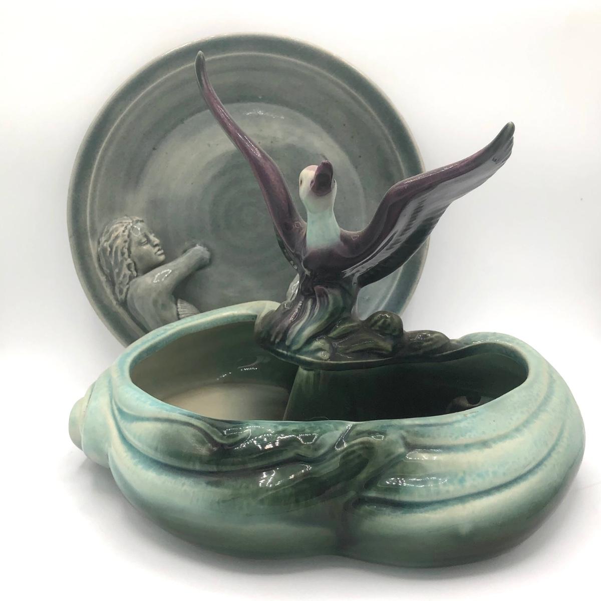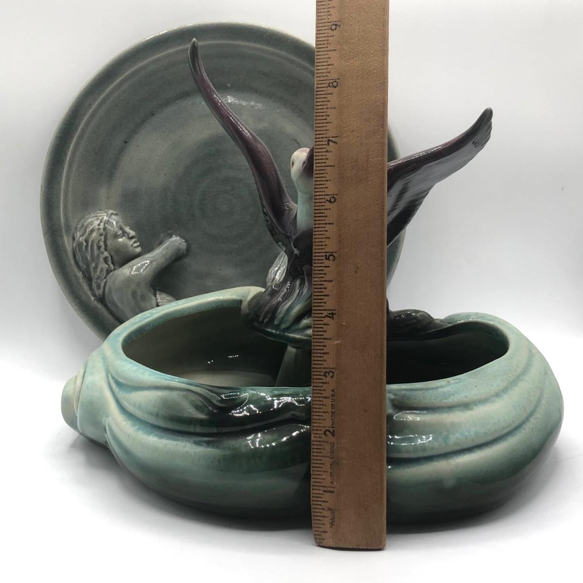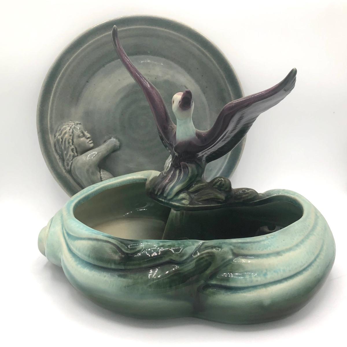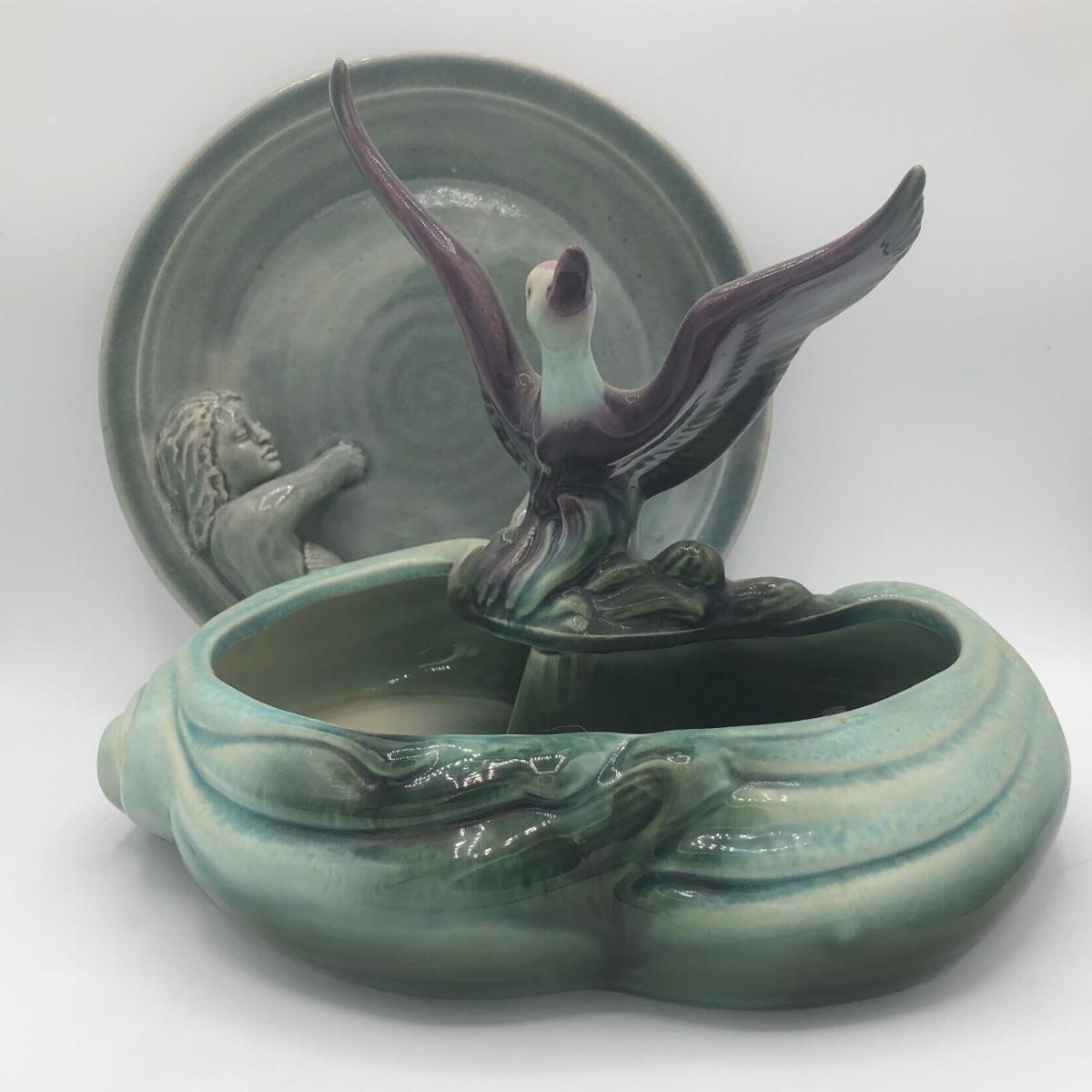 LOT 81: Artist Signed Blue Gray Art Pottery Mermaid Plate & Vintage Hull USA Pottery Flying Bird Planter (104)