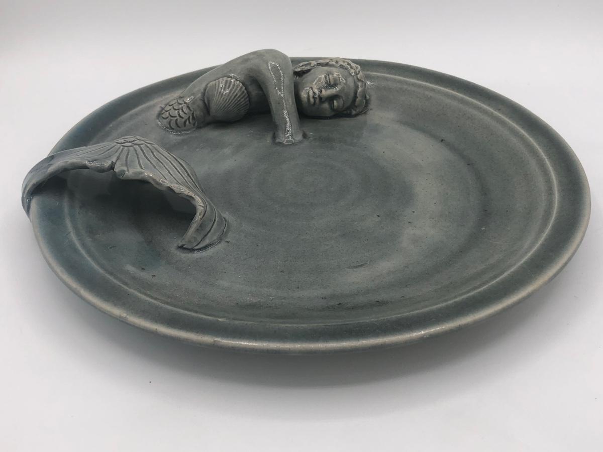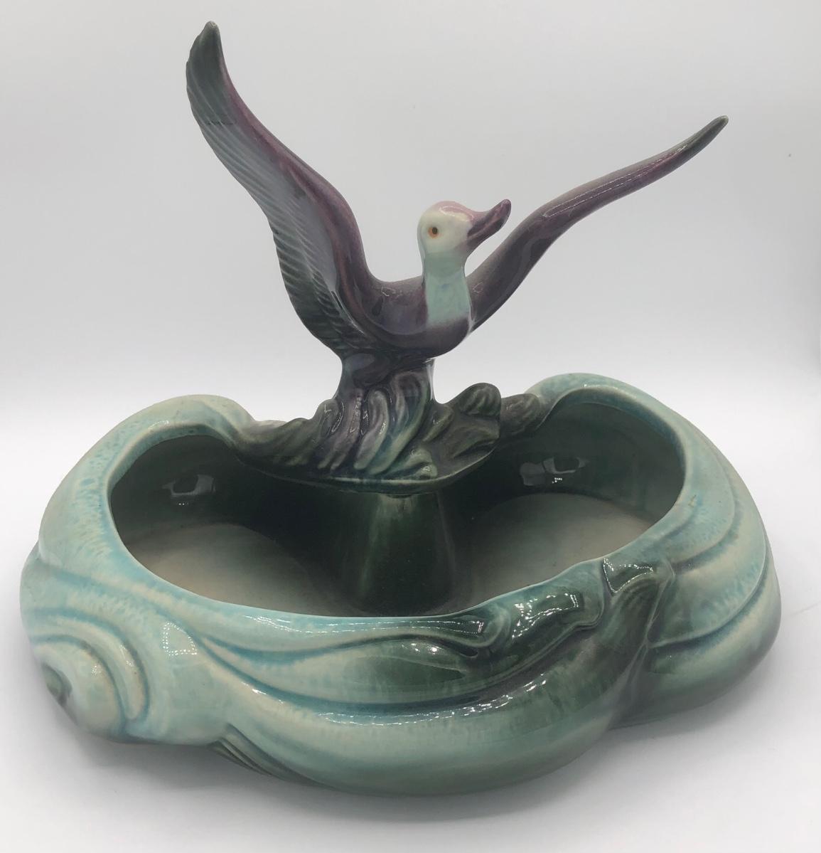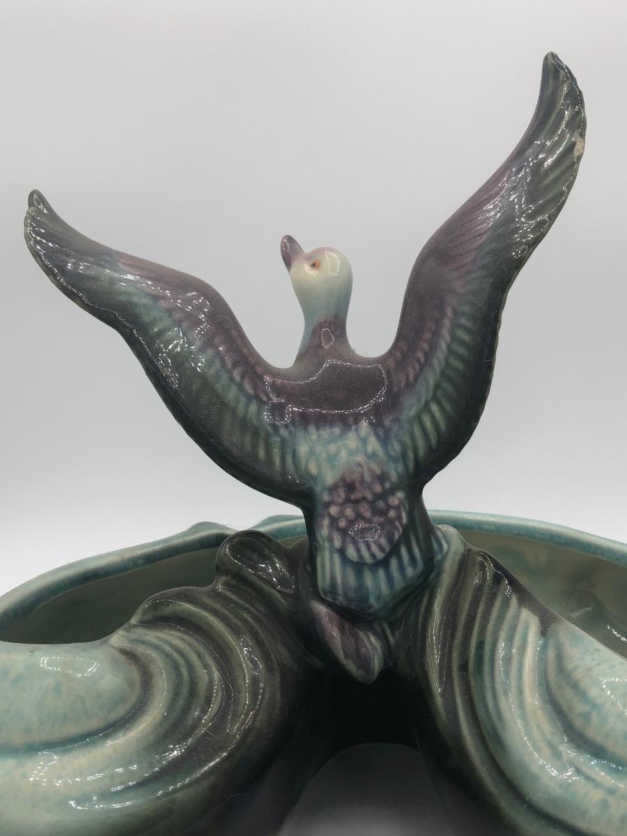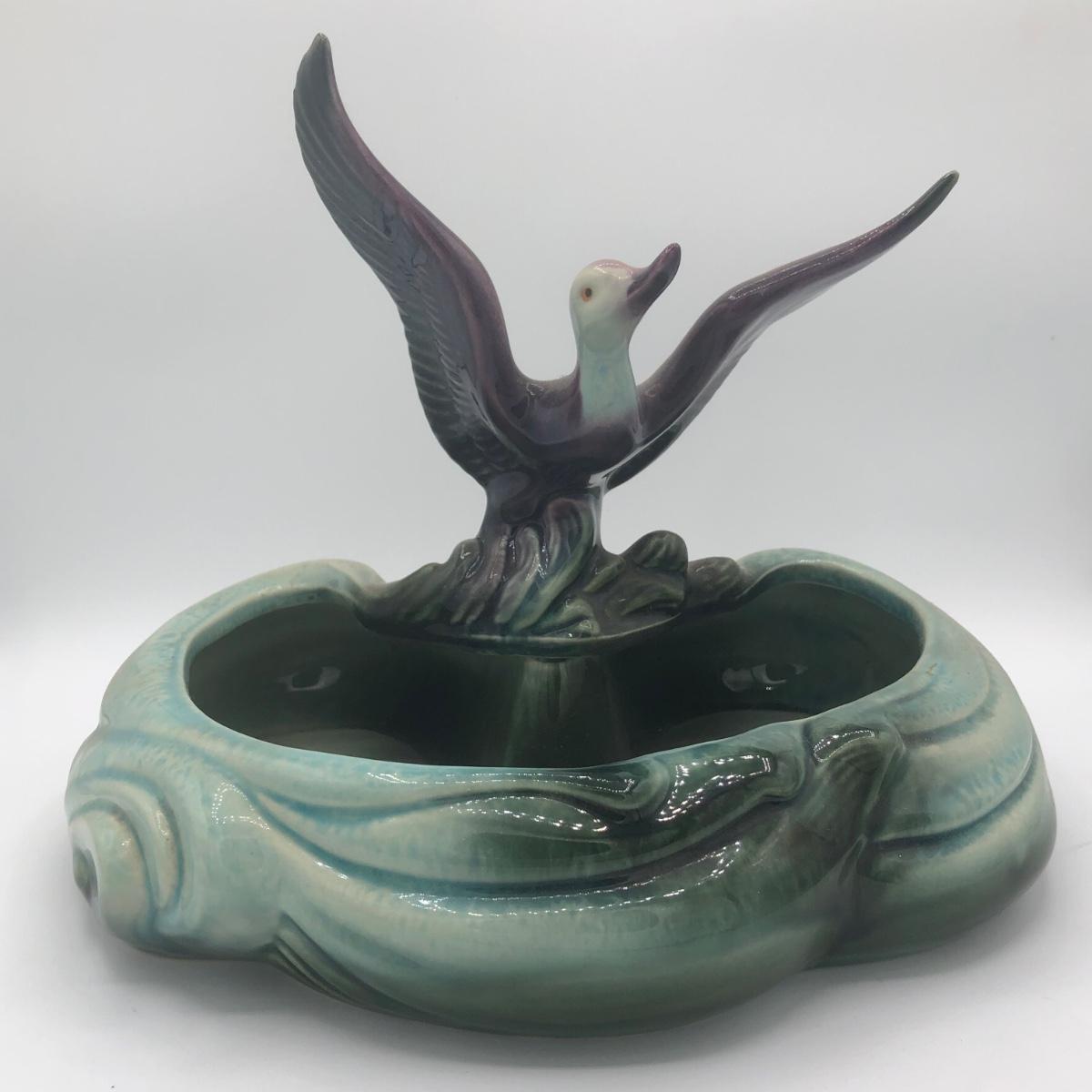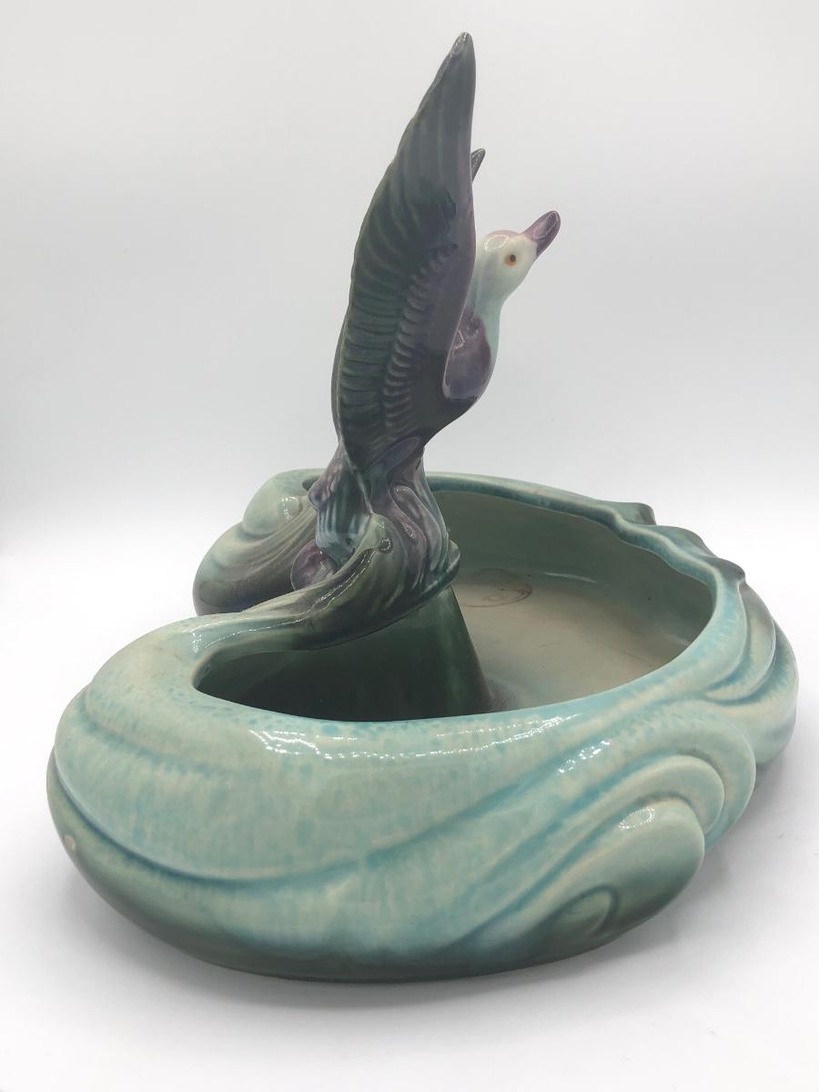 LOT 81: Artist Signed Blue Gray Art Pottery Mermaid Plate & Vintage Hull USA Pottery Flying Bird Planter (104)