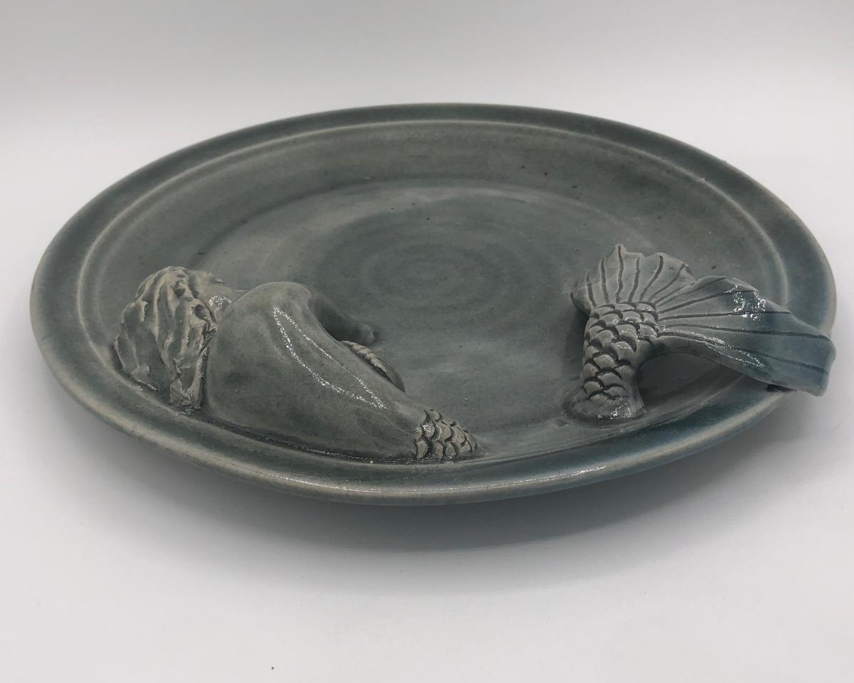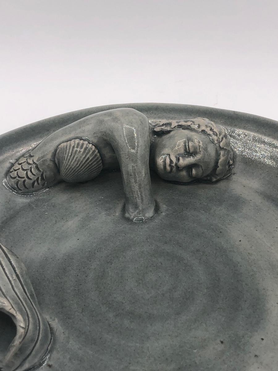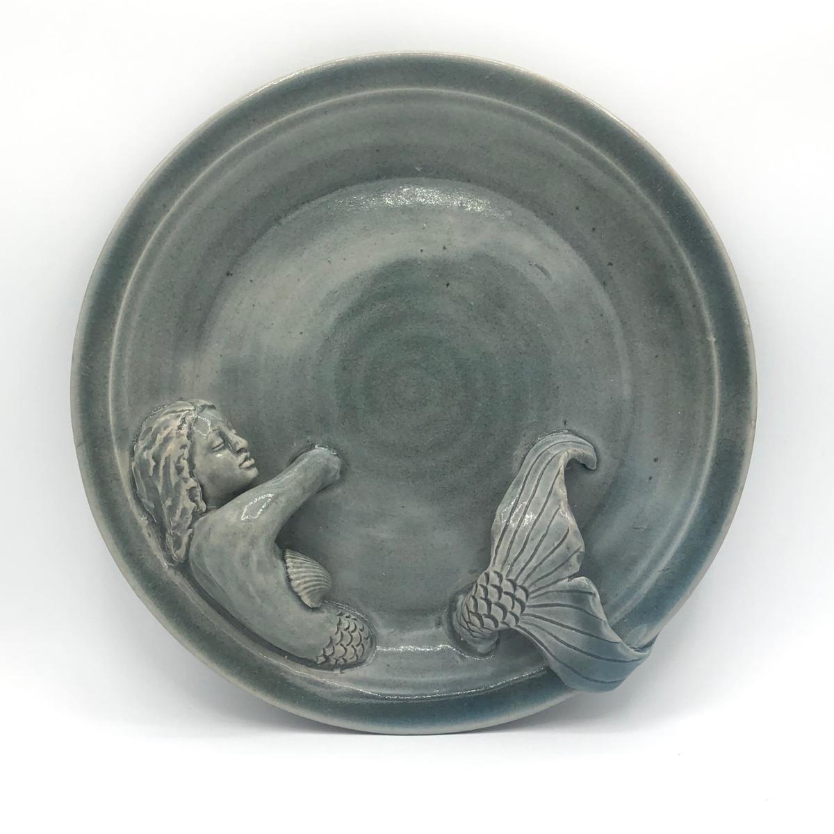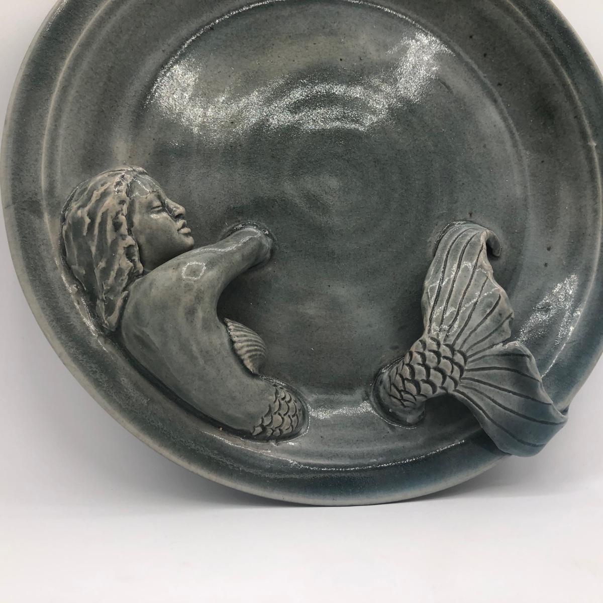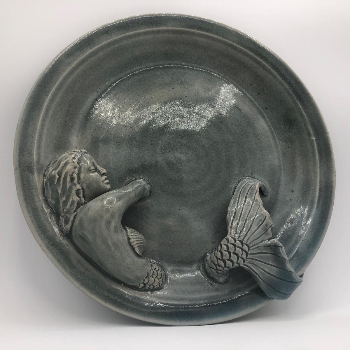 LOT 81: Artist Signed Blue Gray Art Pottery Mermaid Plate & Vintage Hull USA Pottery Flying Bird Planter (104)