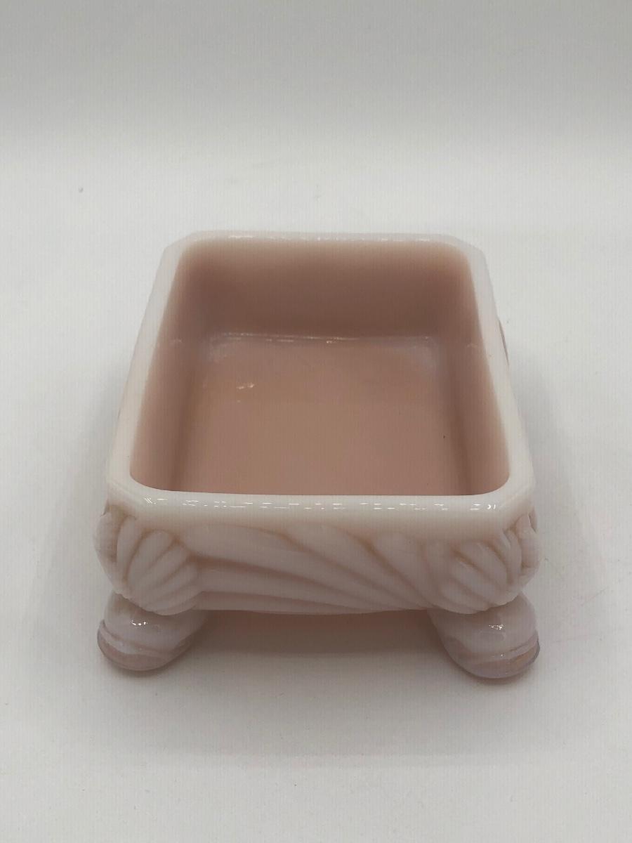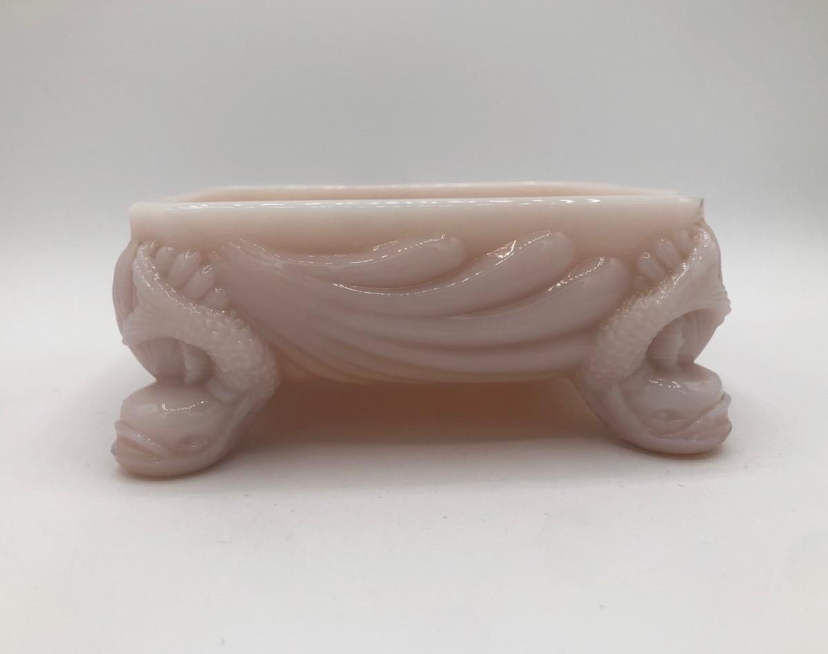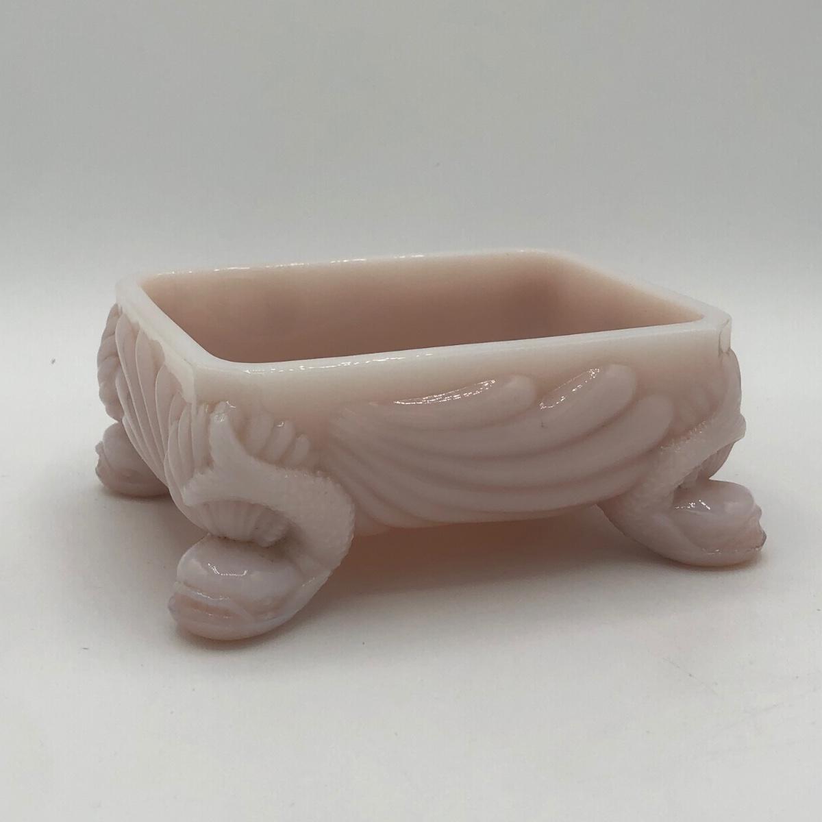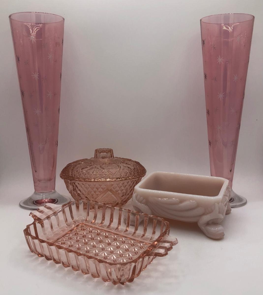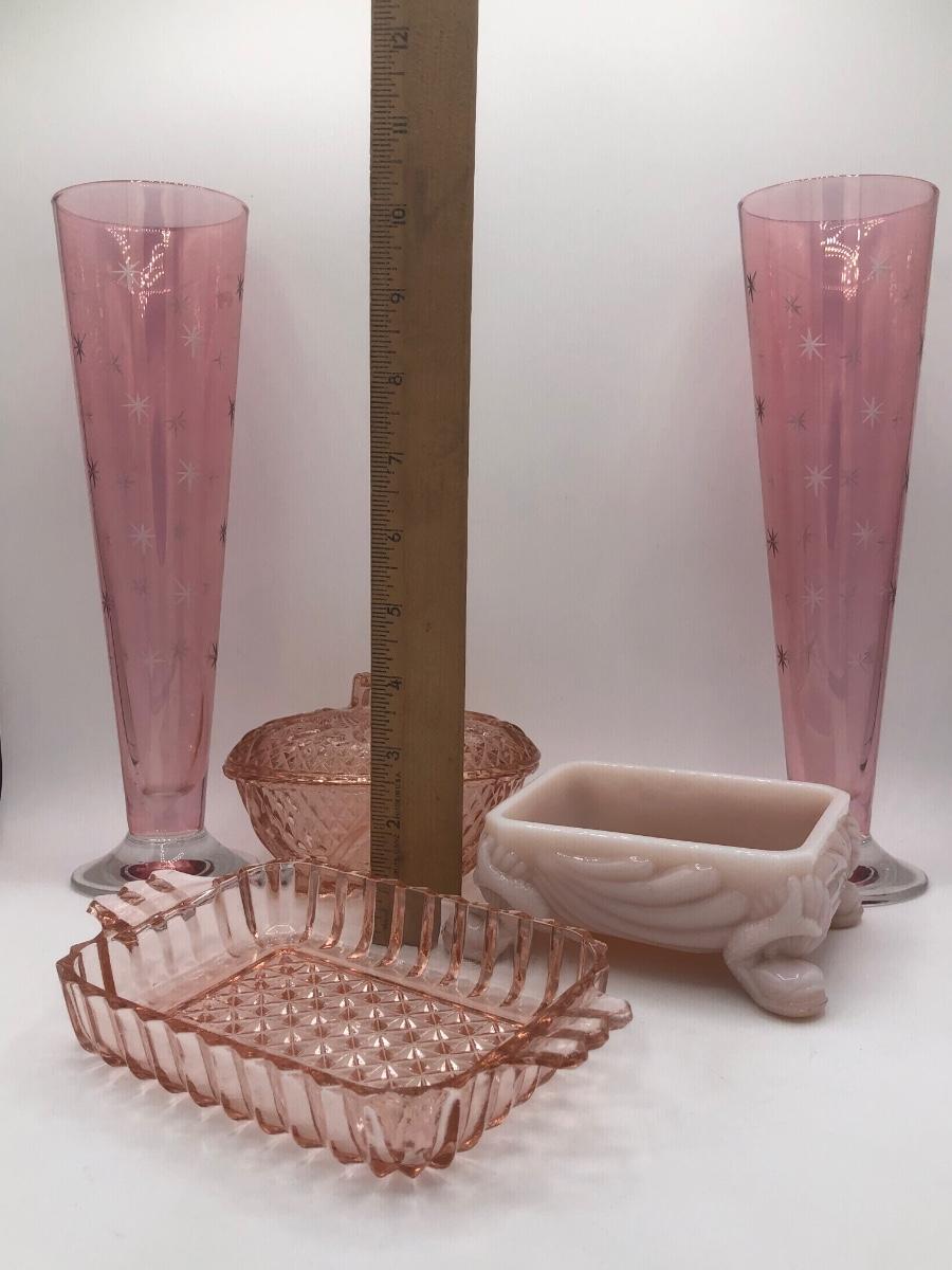 LOT 83: Vintage Pink Collection: Cambridge Crown Tuscan Shell Dolphin Foot Milk Glass Soap Dish, 2 Depression Glass Candy Dishes & Large Etched Glass Trumpet Vases