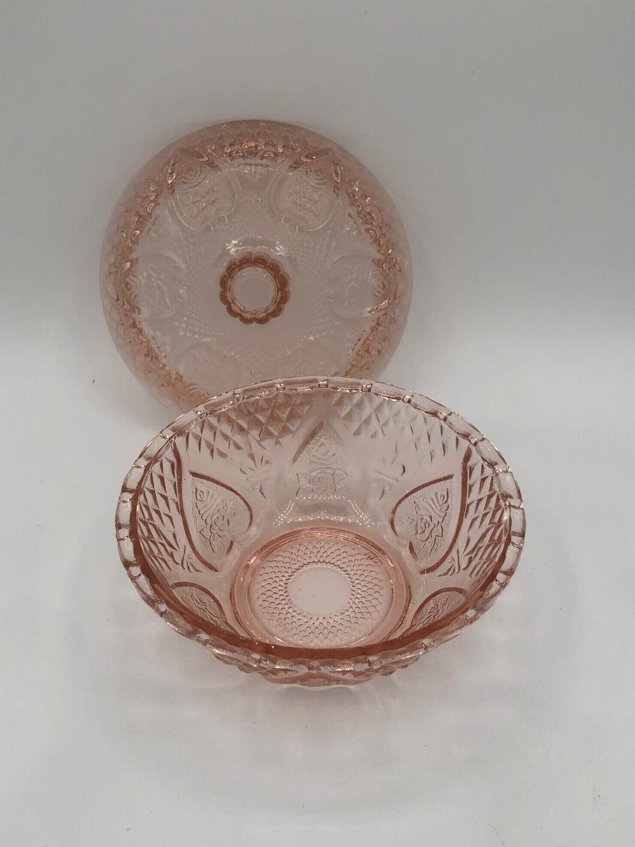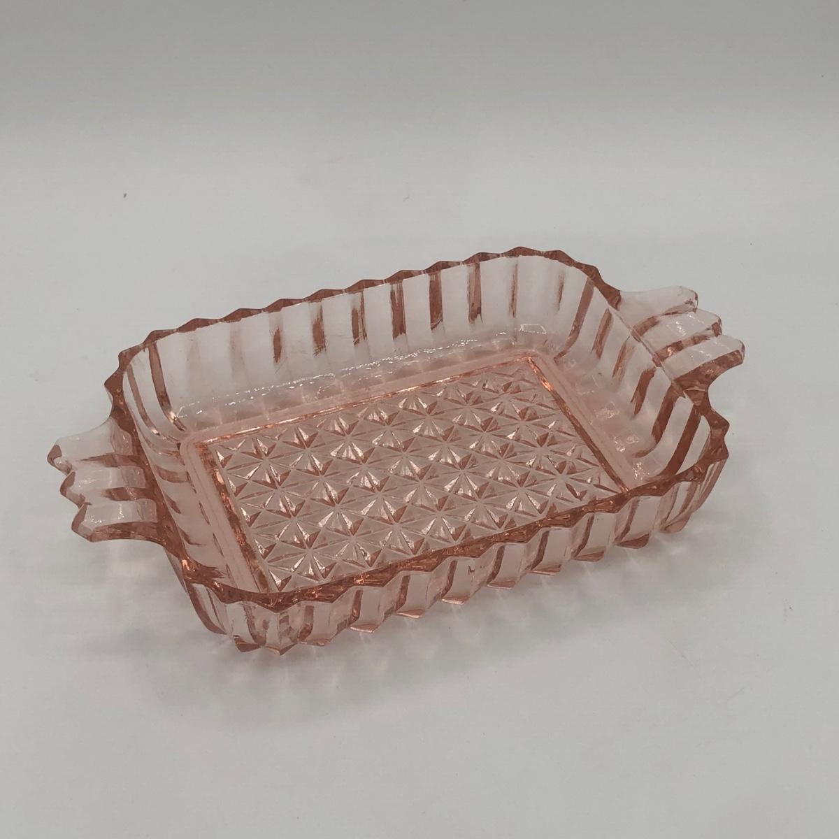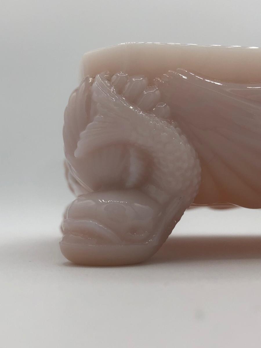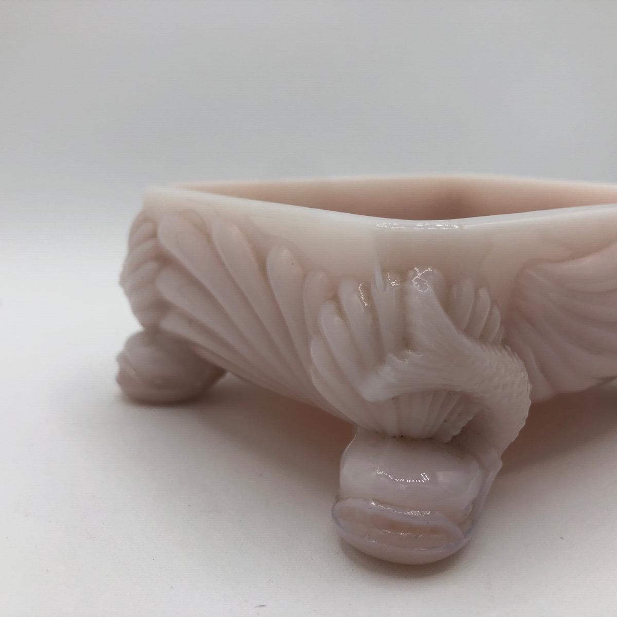 LOT 83: Vintage Pink Collection: Cambridge Crown Tuscan Shell Dolphin Foot Milk Glass Soap Dish, 2 Depression Glass Candy Dishes & Large Etched Glass Trumpet Vases