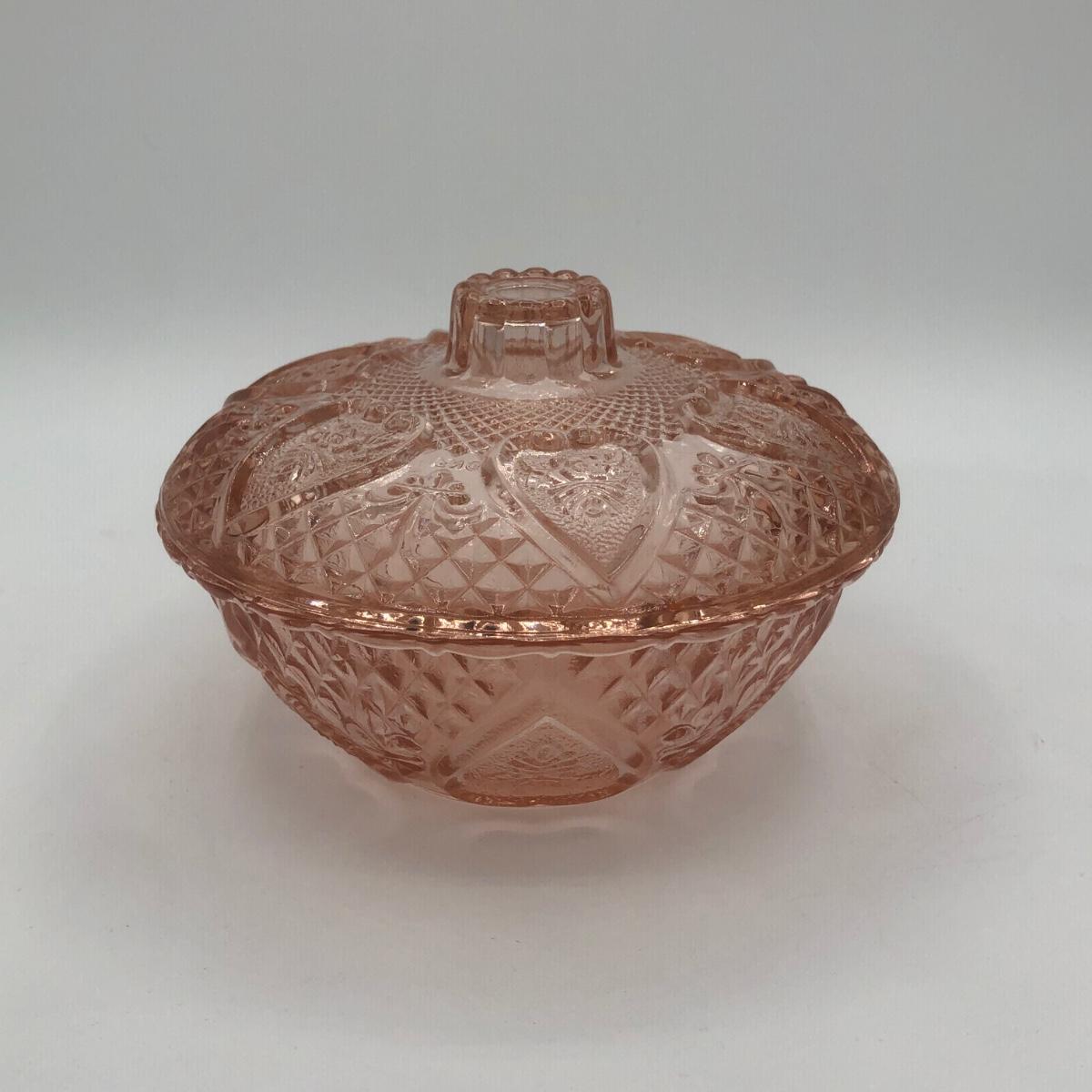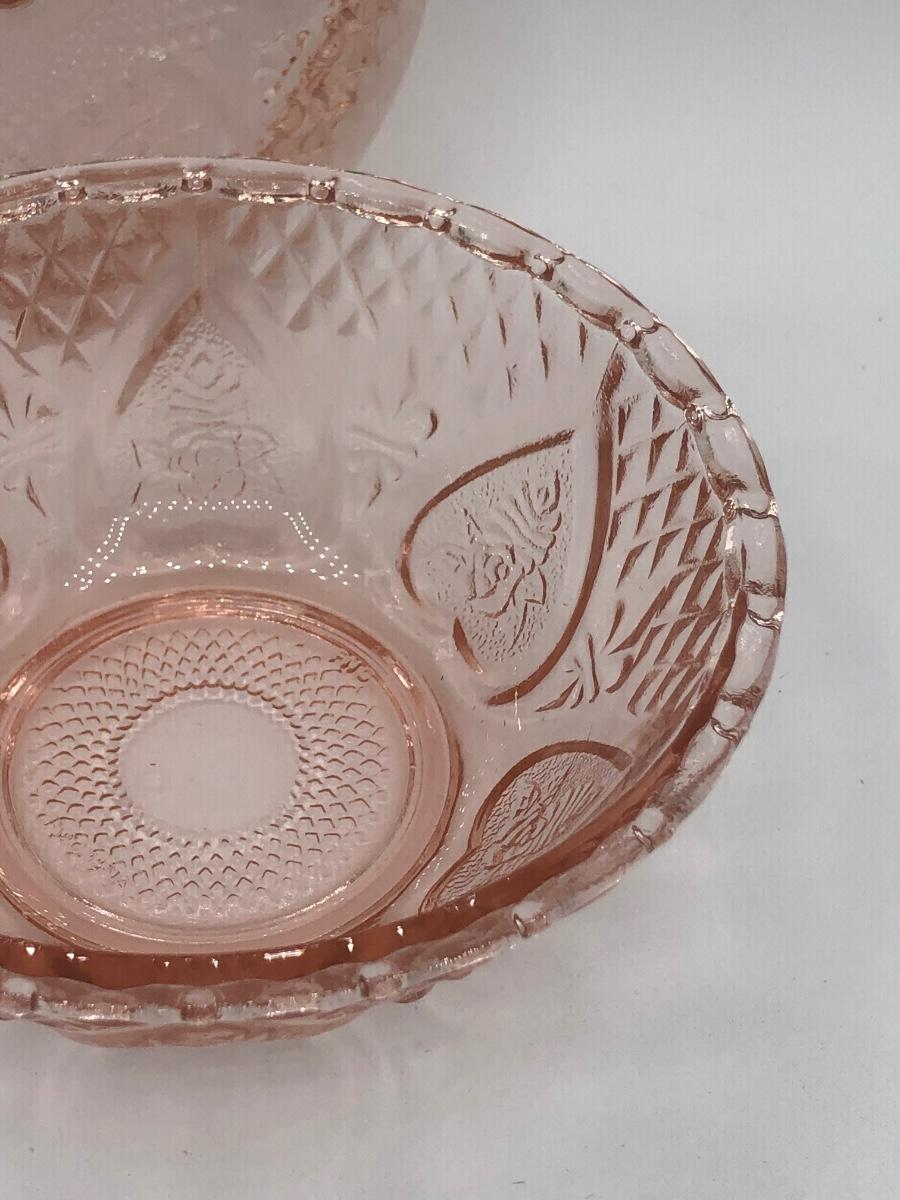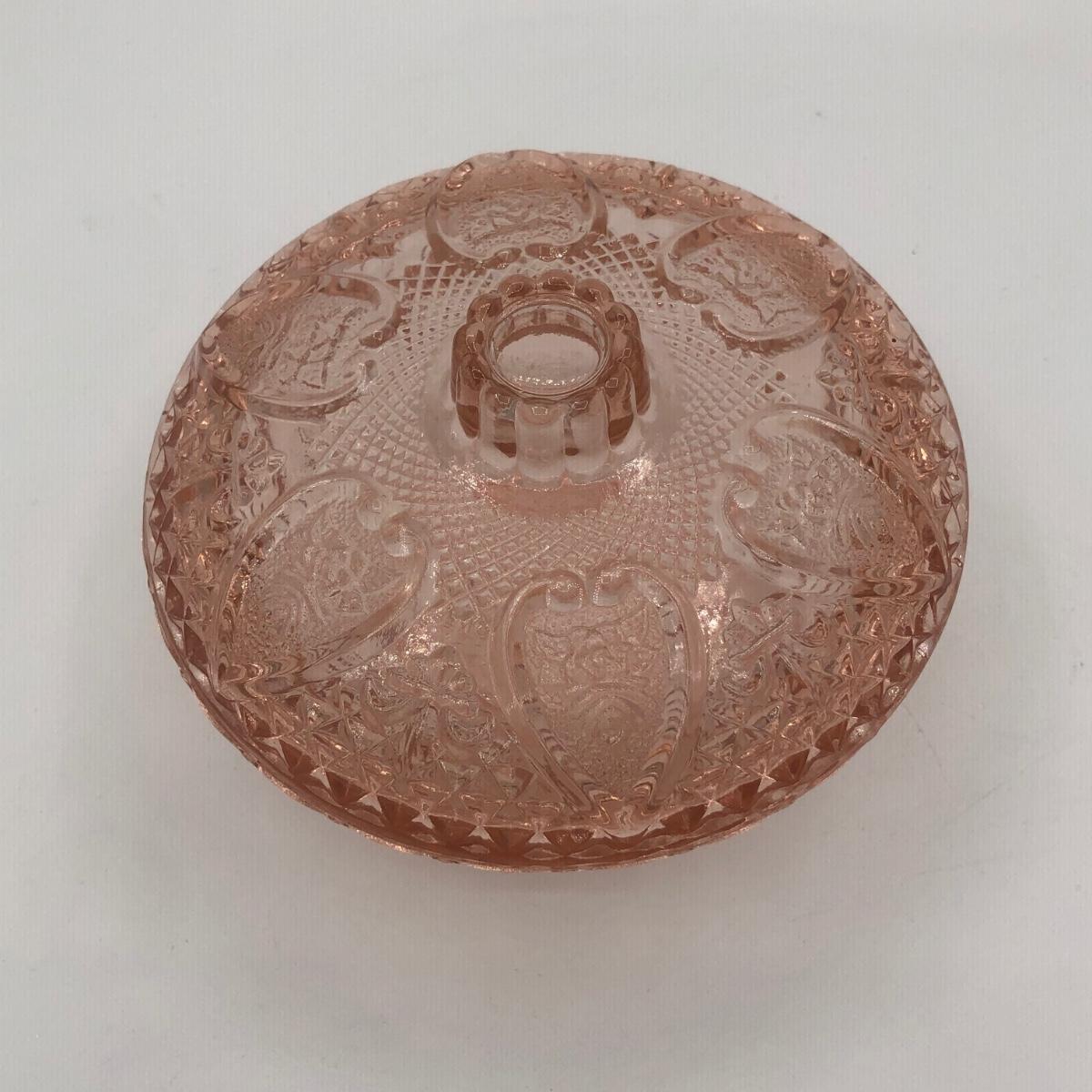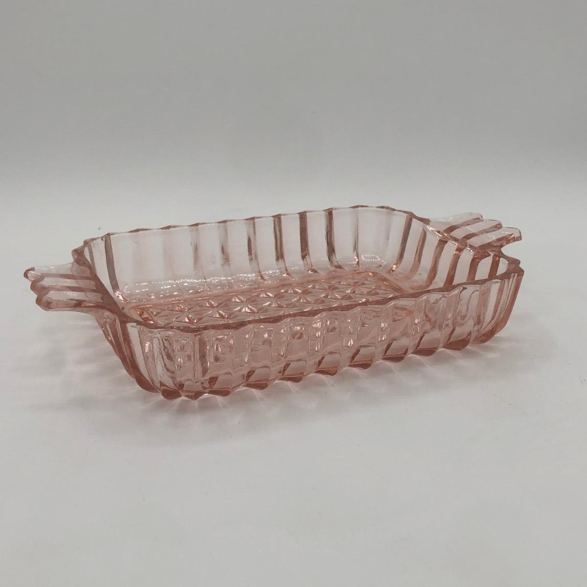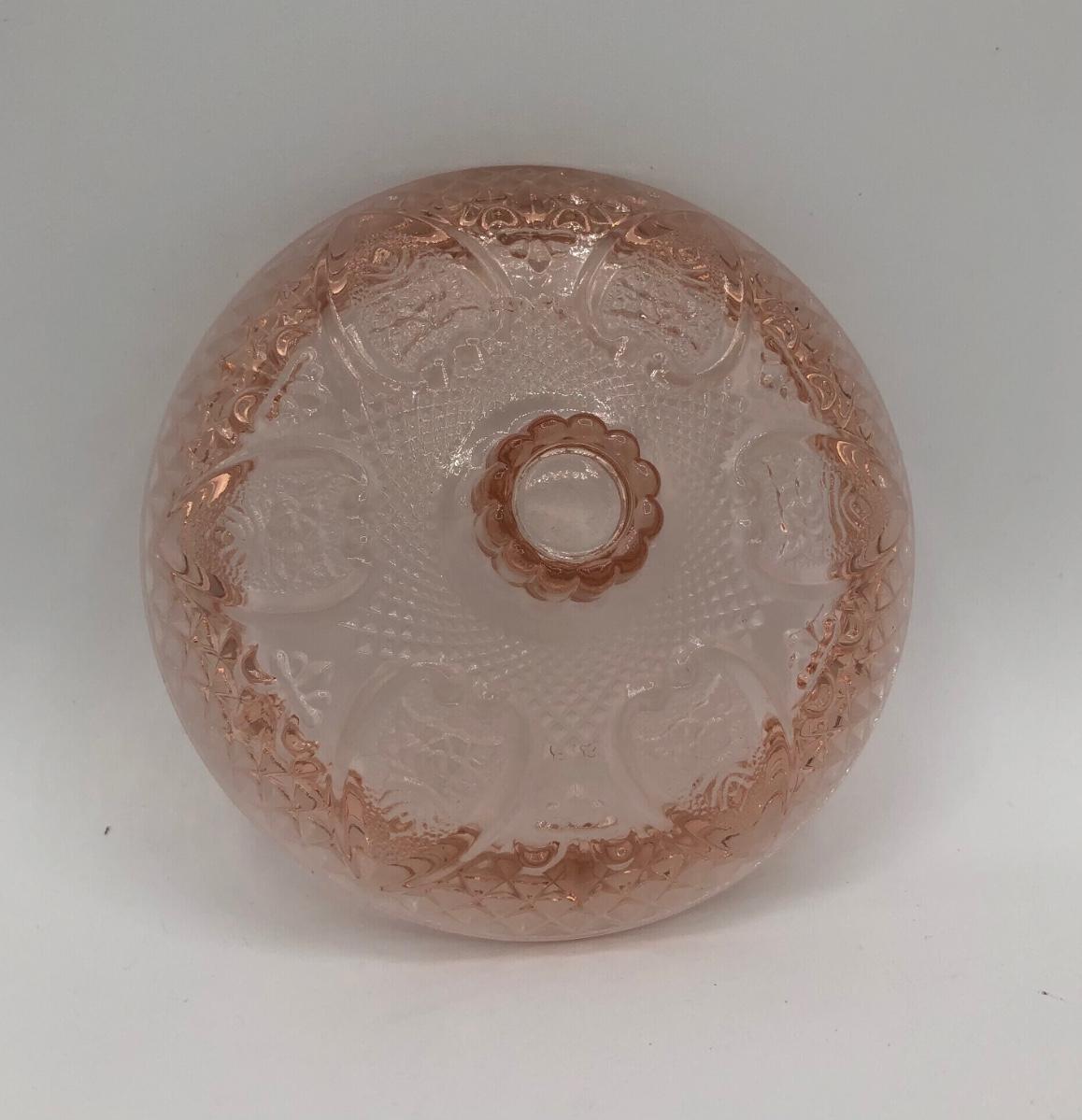 LOT 83: Vintage Pink Collection: Cambridge Crown Tuscan Shell Dolphin Foot Milk Glass Soap Dish, 2 Depression Glass Candy Dishes & Large Etched Glass Trumpet Vases