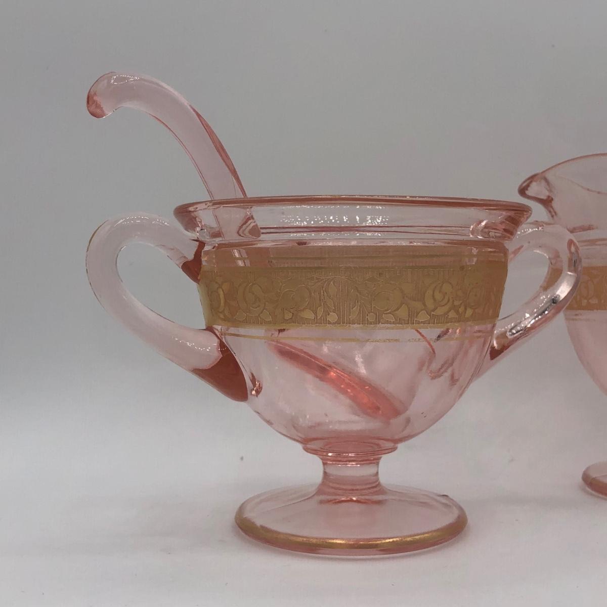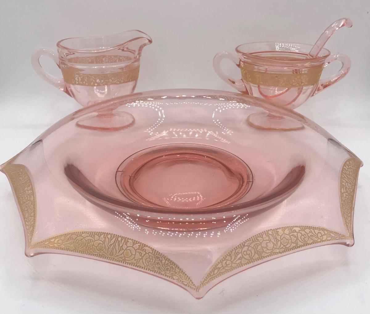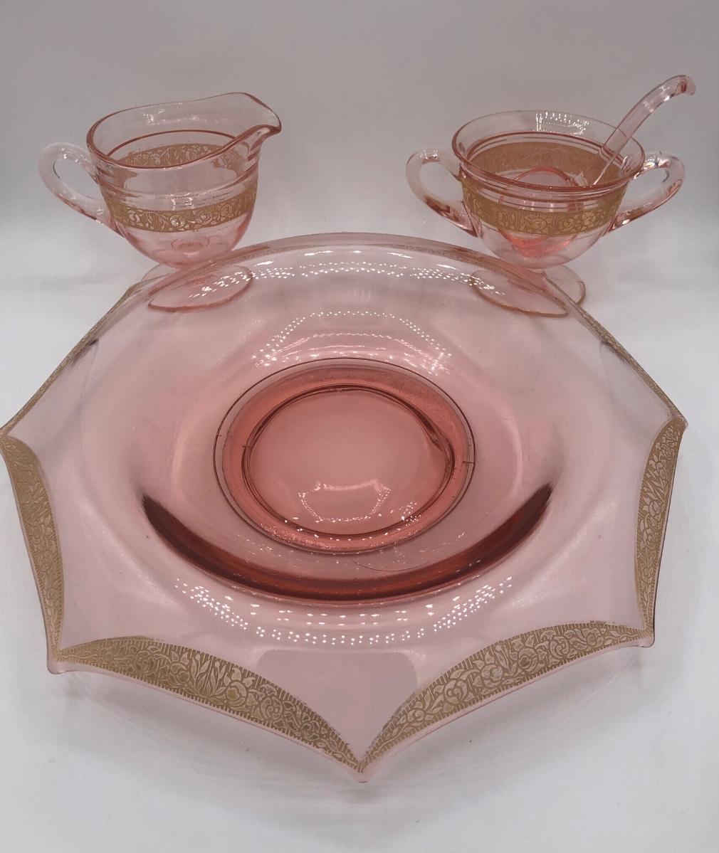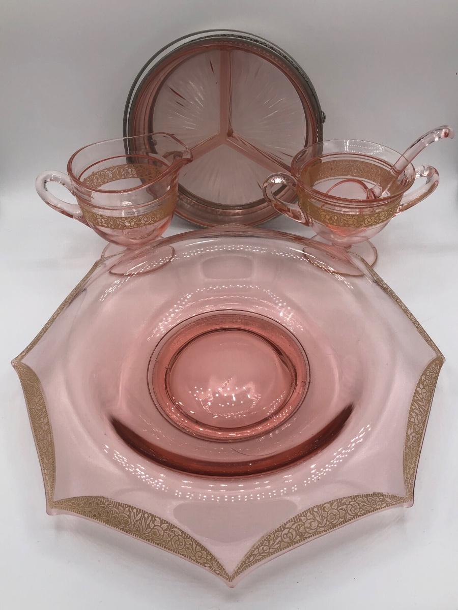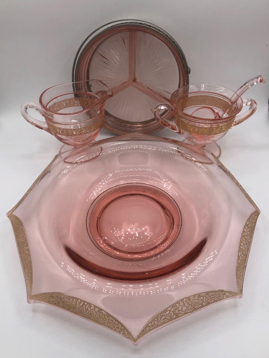 LOT 84: Elegant Vintage Pink Depression Glass Pedestal Sugar Bowl & Creamer Set w/ Matching Gold Trim Rolled Edge Umbrella Dish & Pink Depression Glass Tidbit Tray w/ Metal Handle