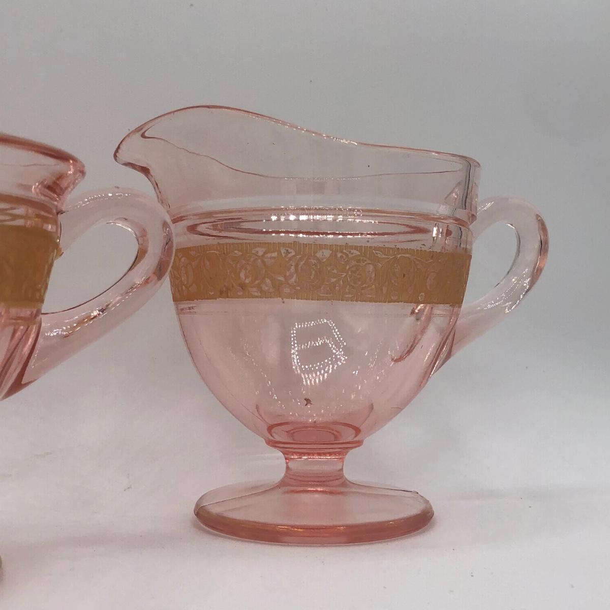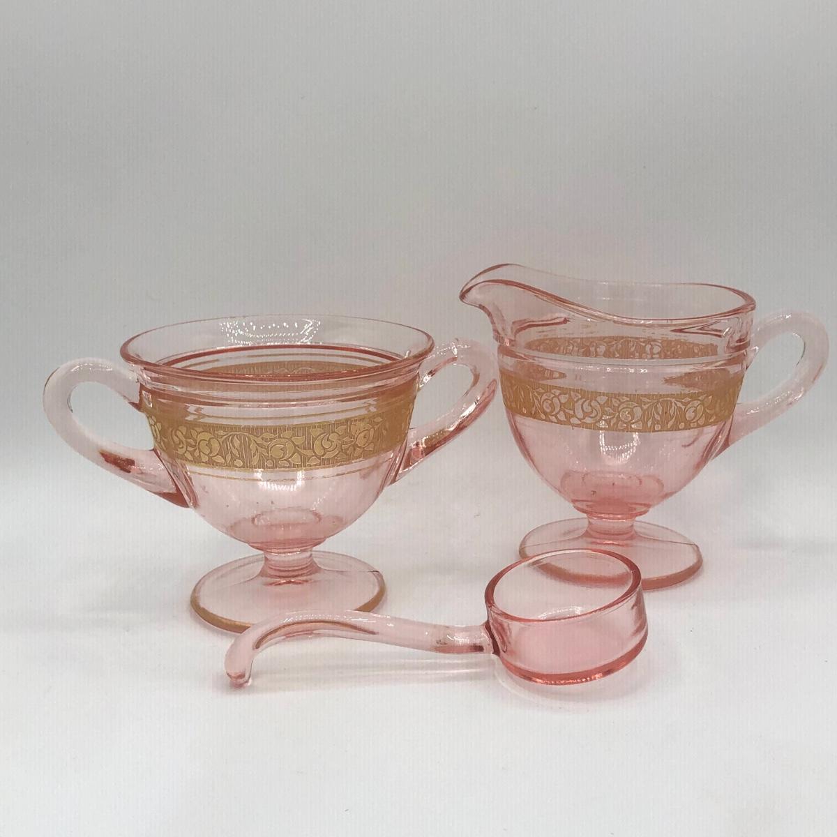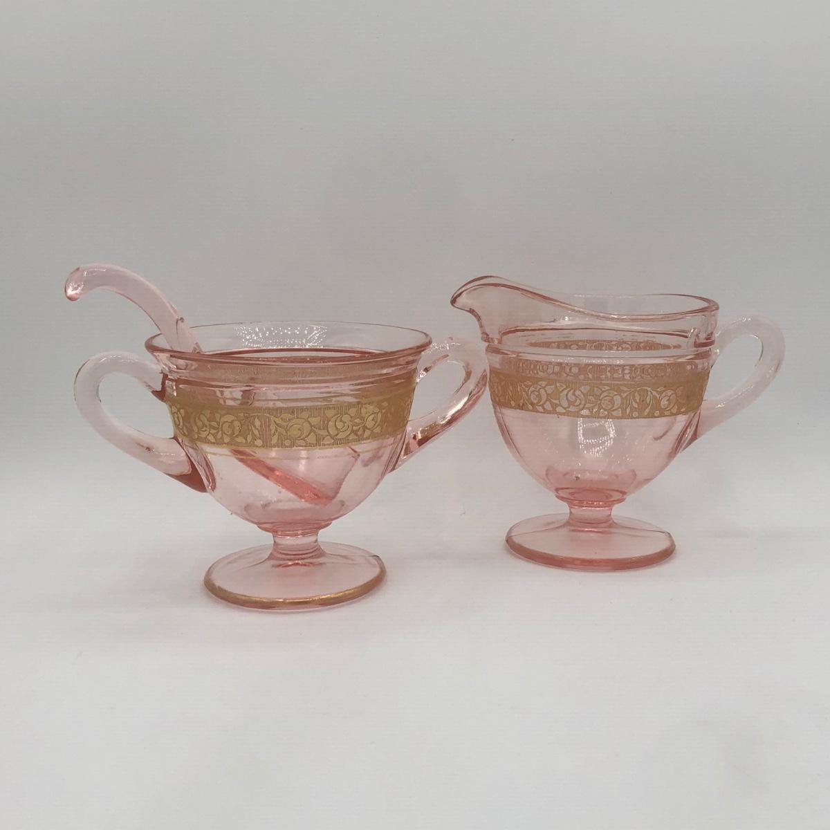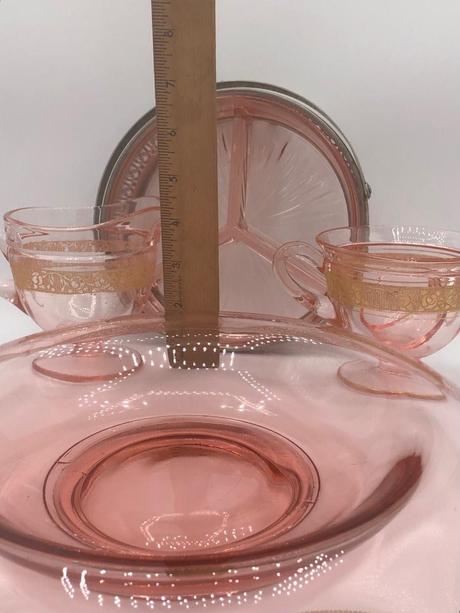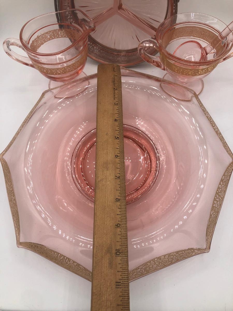 LOT 84: Elegant Vintage Pink Depression Glass Pedestal Sugar Bowl & Creamer Set w/ Matching Gold Trim Rolled Edge Umbrella Dish & Pink Depression Glass Tidbit Tray w/ Metal Handle