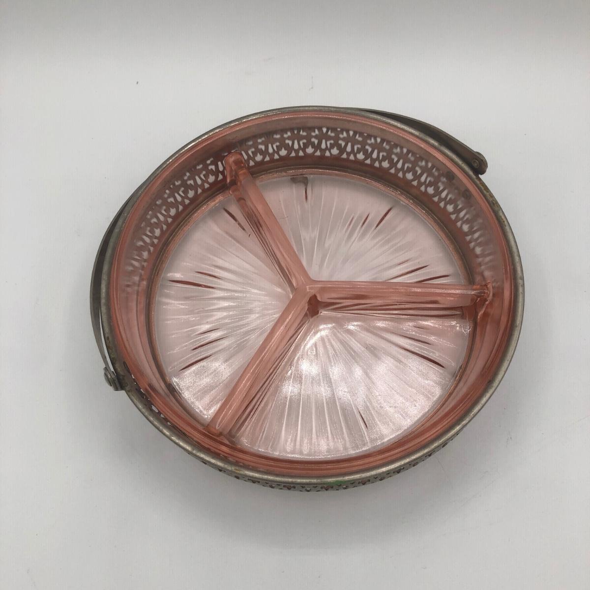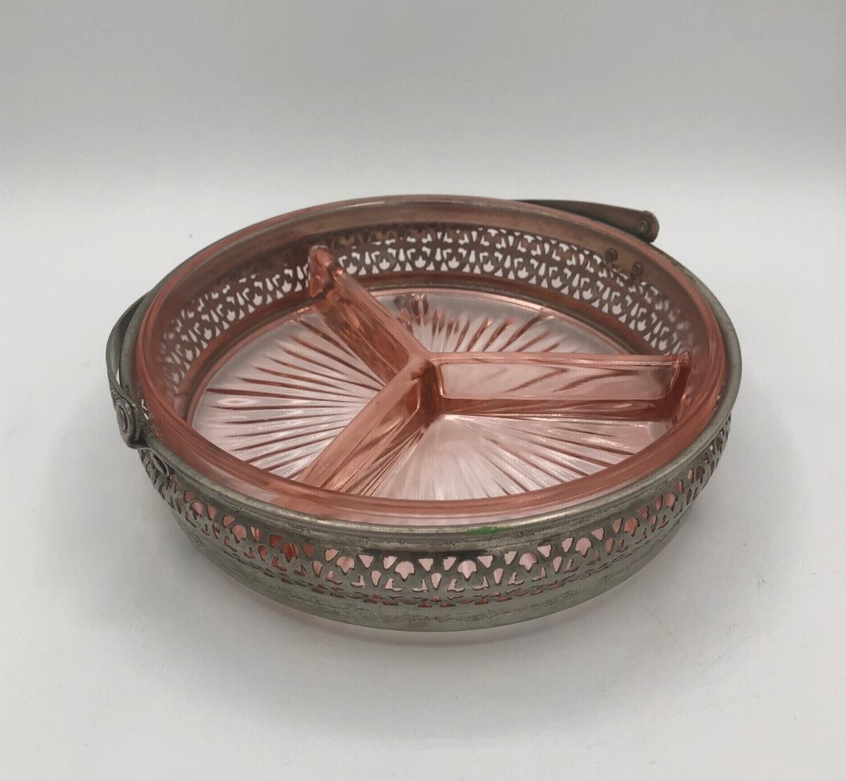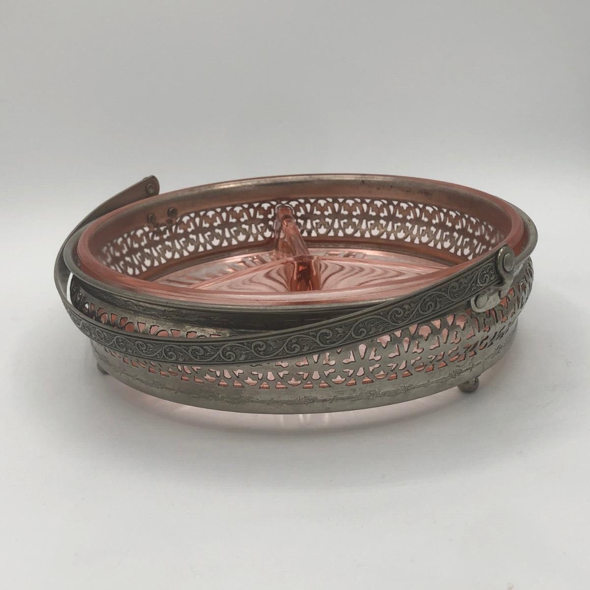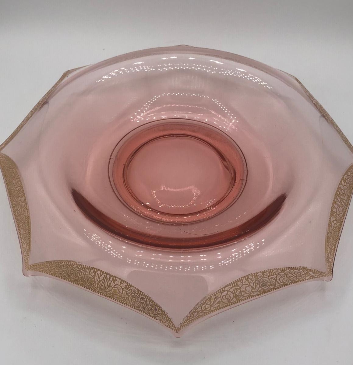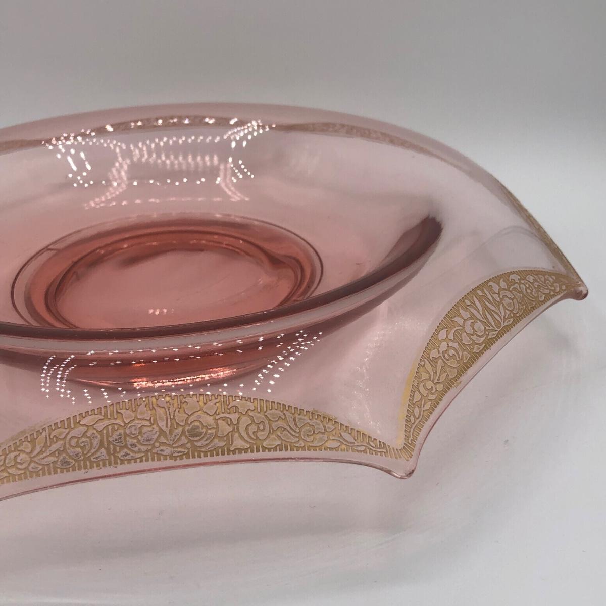 LOT 84: Elegant Vintage Pink Depression Glass Pedestal Sugar Bowl & Creamer Set w/ Matching Gold Trim Rolled Edge Umbrella Dish & Pink Depression Glass Tidbit Tray w/ Metal Handle