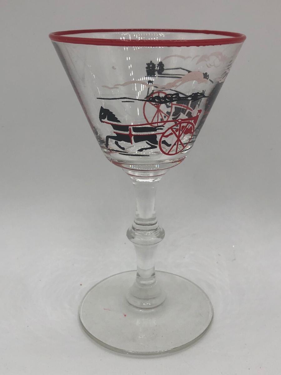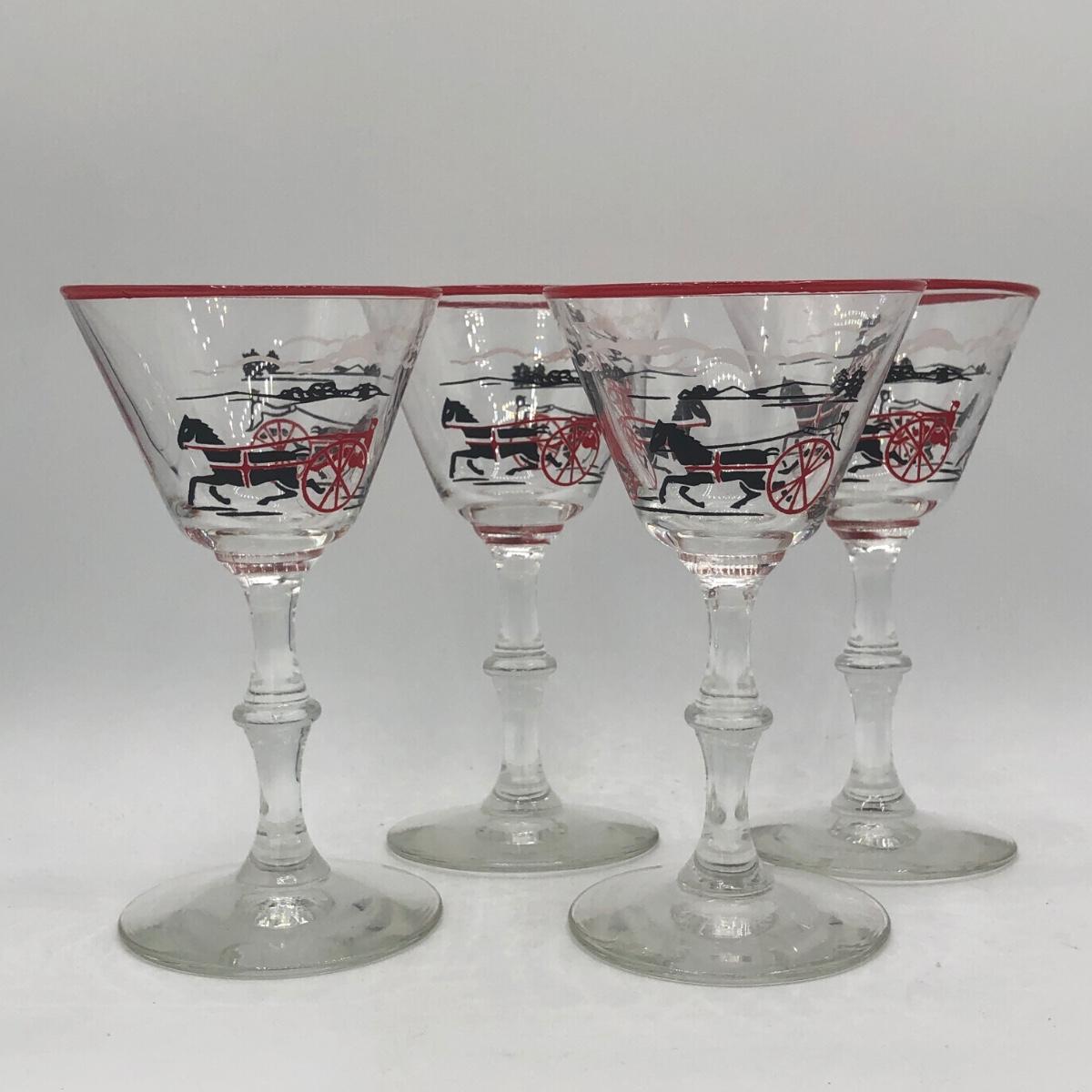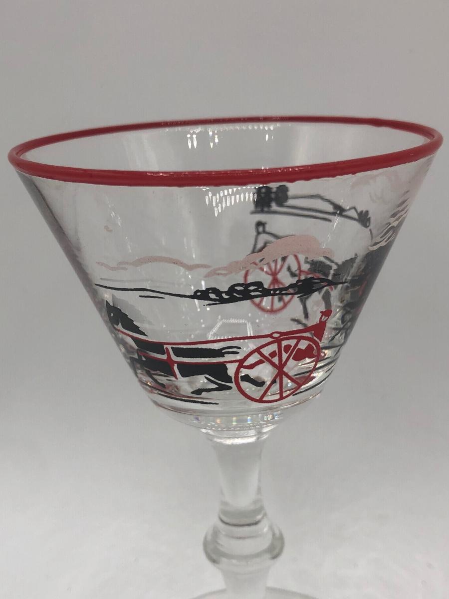 LOT 97: Vintage 1940s Libbey Horse Drawn Cab Red Rim Cocktail Glasses (4)