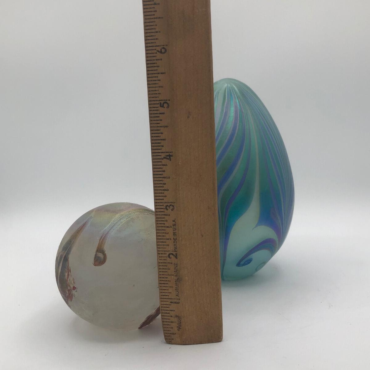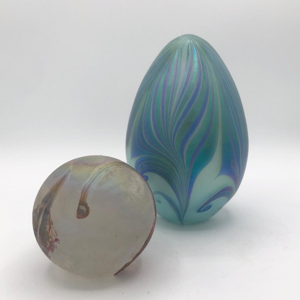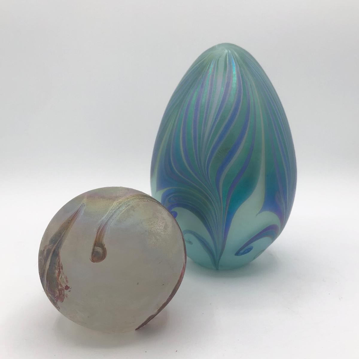 LOT 99: Signed Blue Vandermark Art Glass Egg & Unmarked Glass Sphere Paperweight
