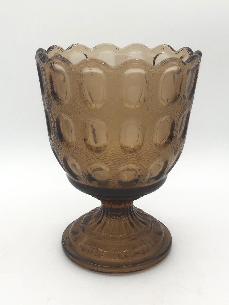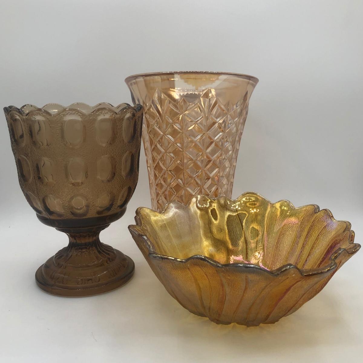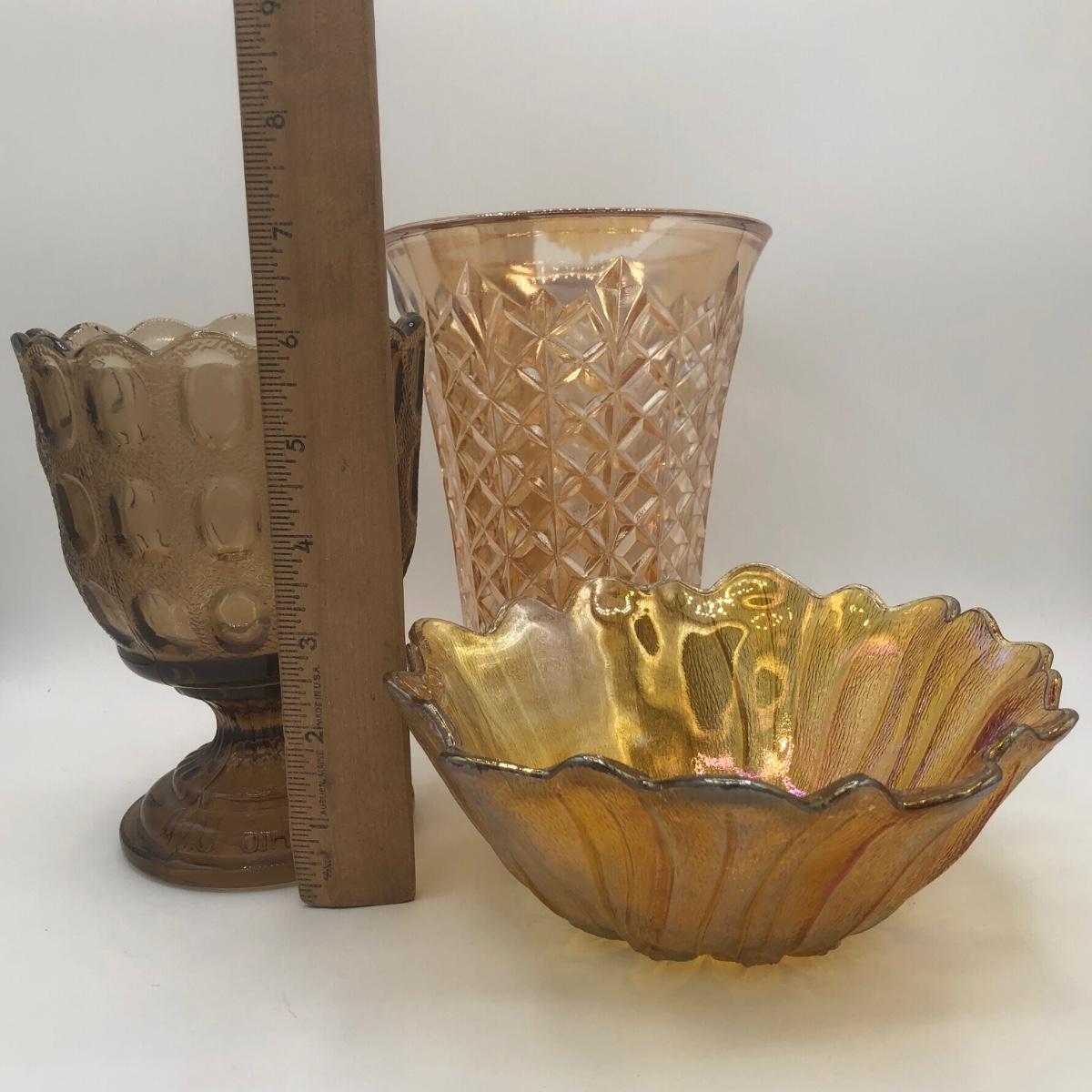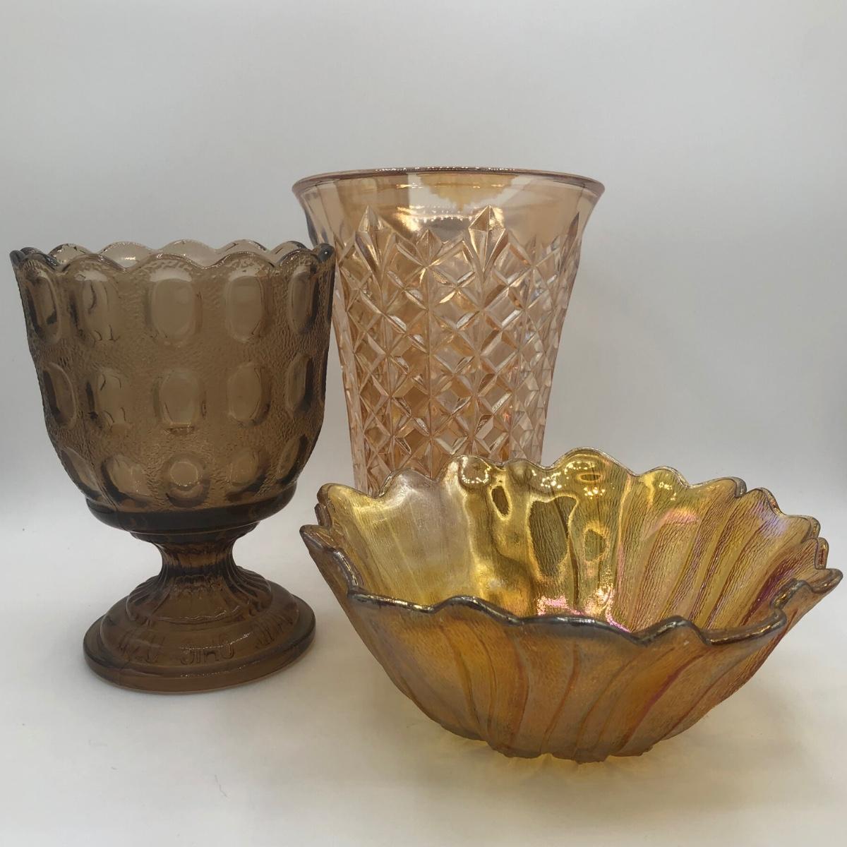 LOT 104: Vintage E.O. Brody Thumbprint Amber Glass Pedestal Vase, Iridescent Marigold Carnival Glass Flower Bowl & Pressed Glass Amber Vase