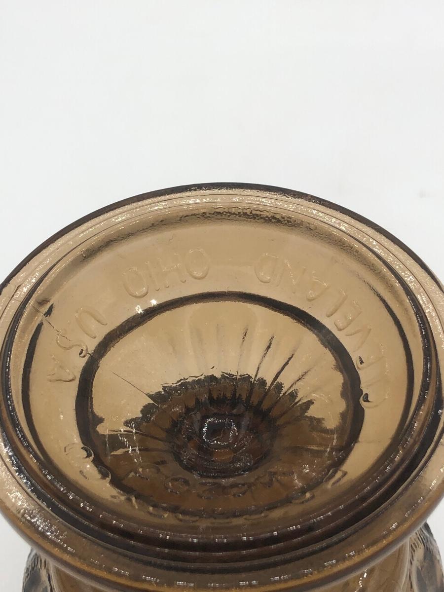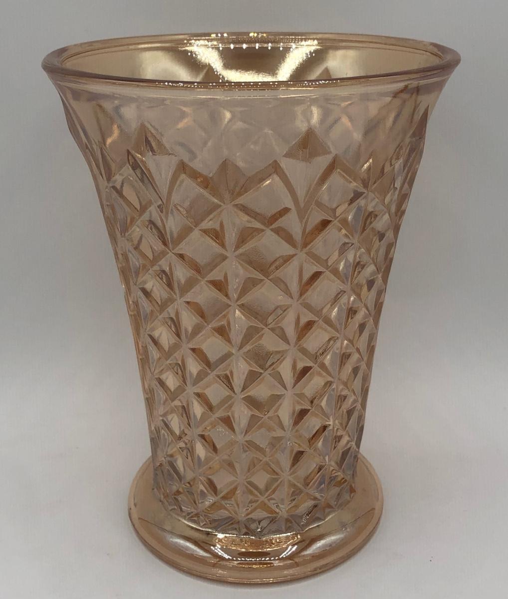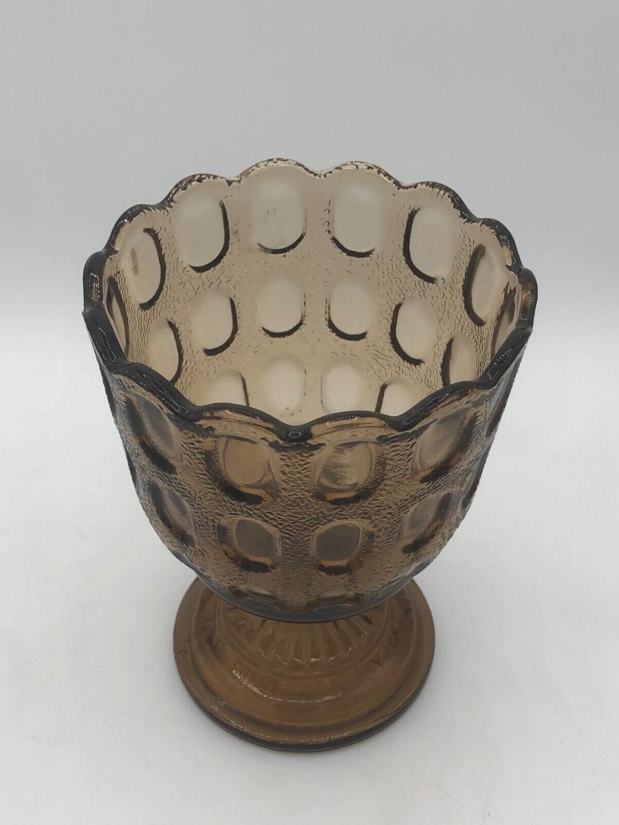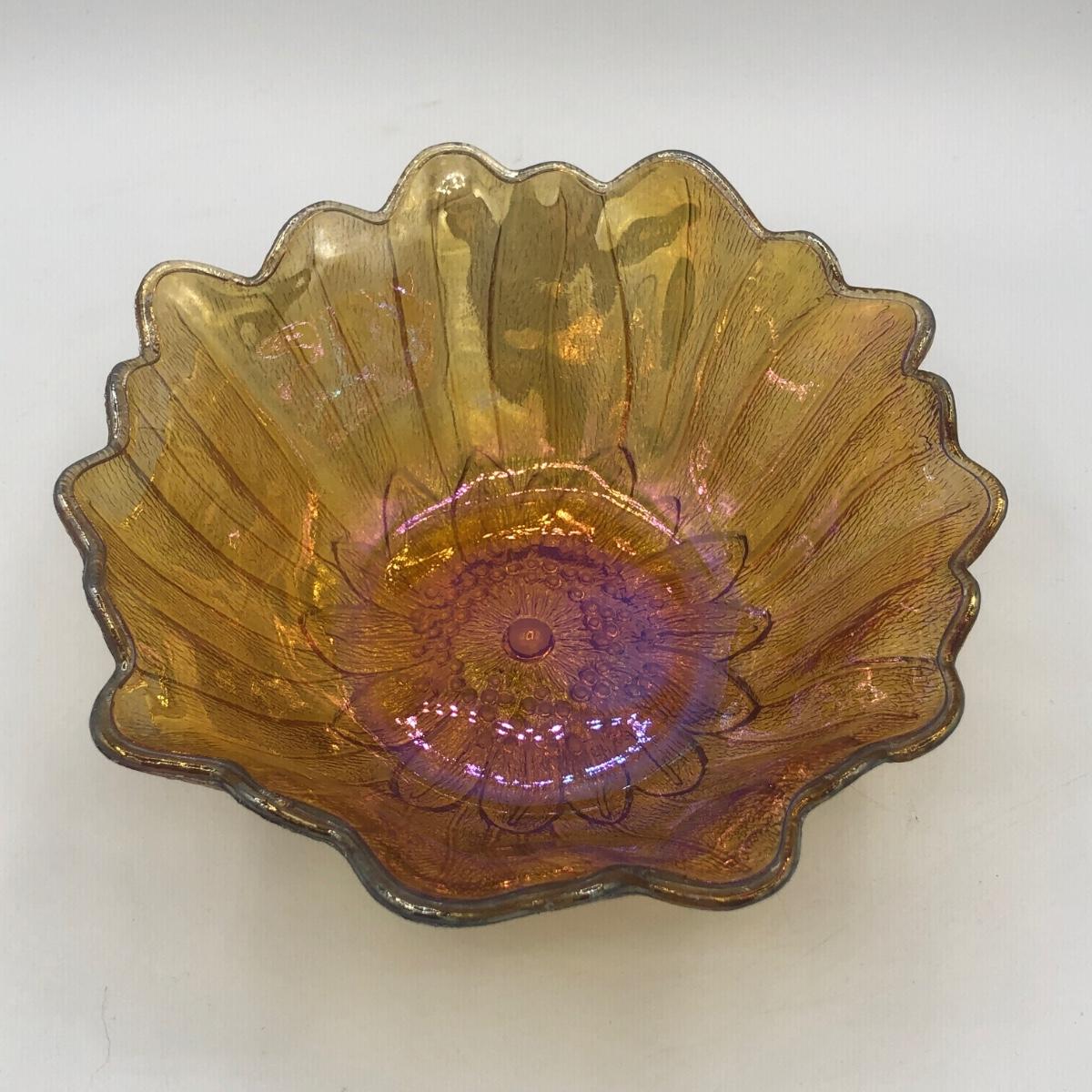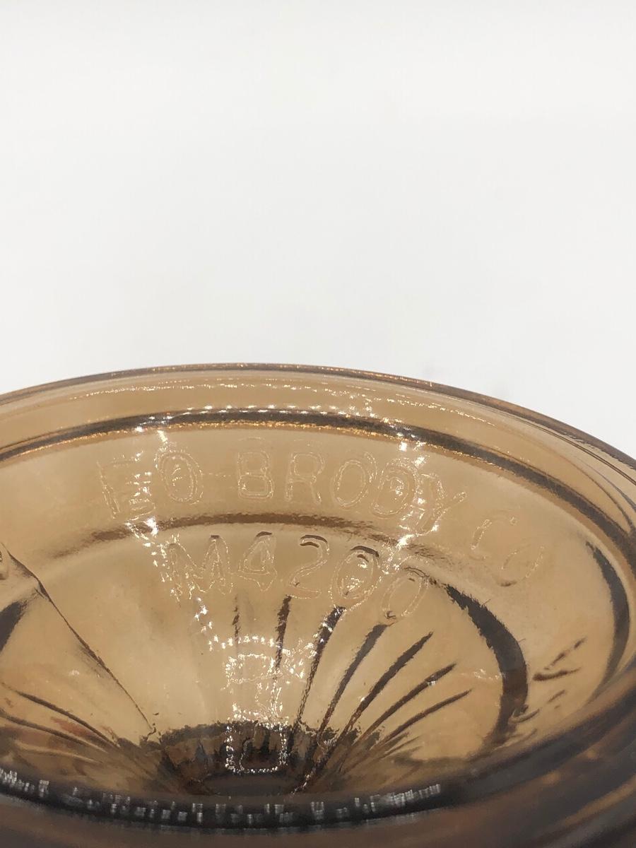 LOT 104: Vintage E.O. Brody Thumbprint Amber Glass Pedestal Vase, Iridescent Marigold Carnival Glass Flower Bowl & Pressed Glass Amber Vase