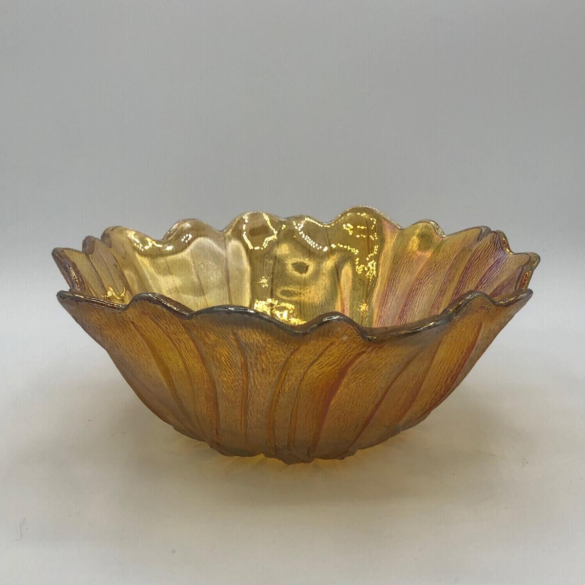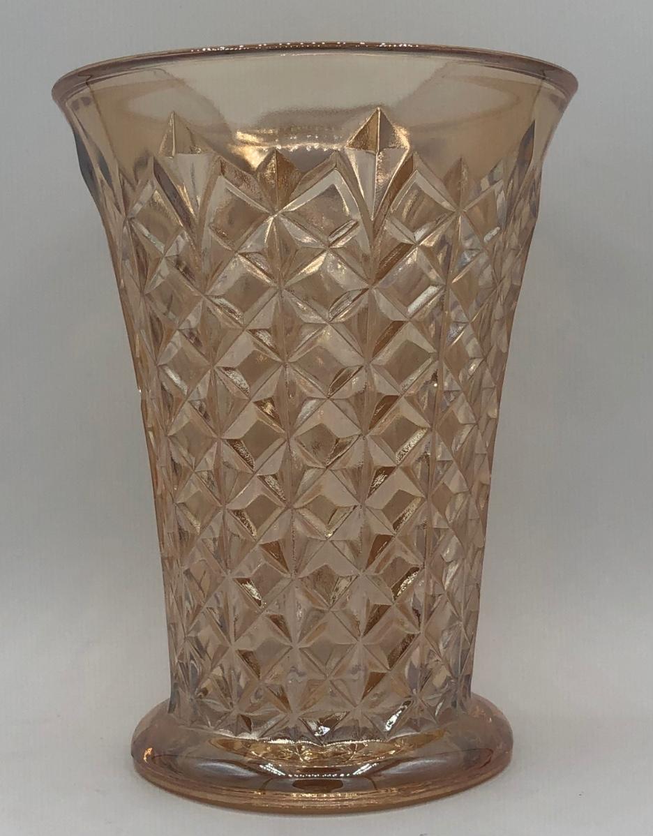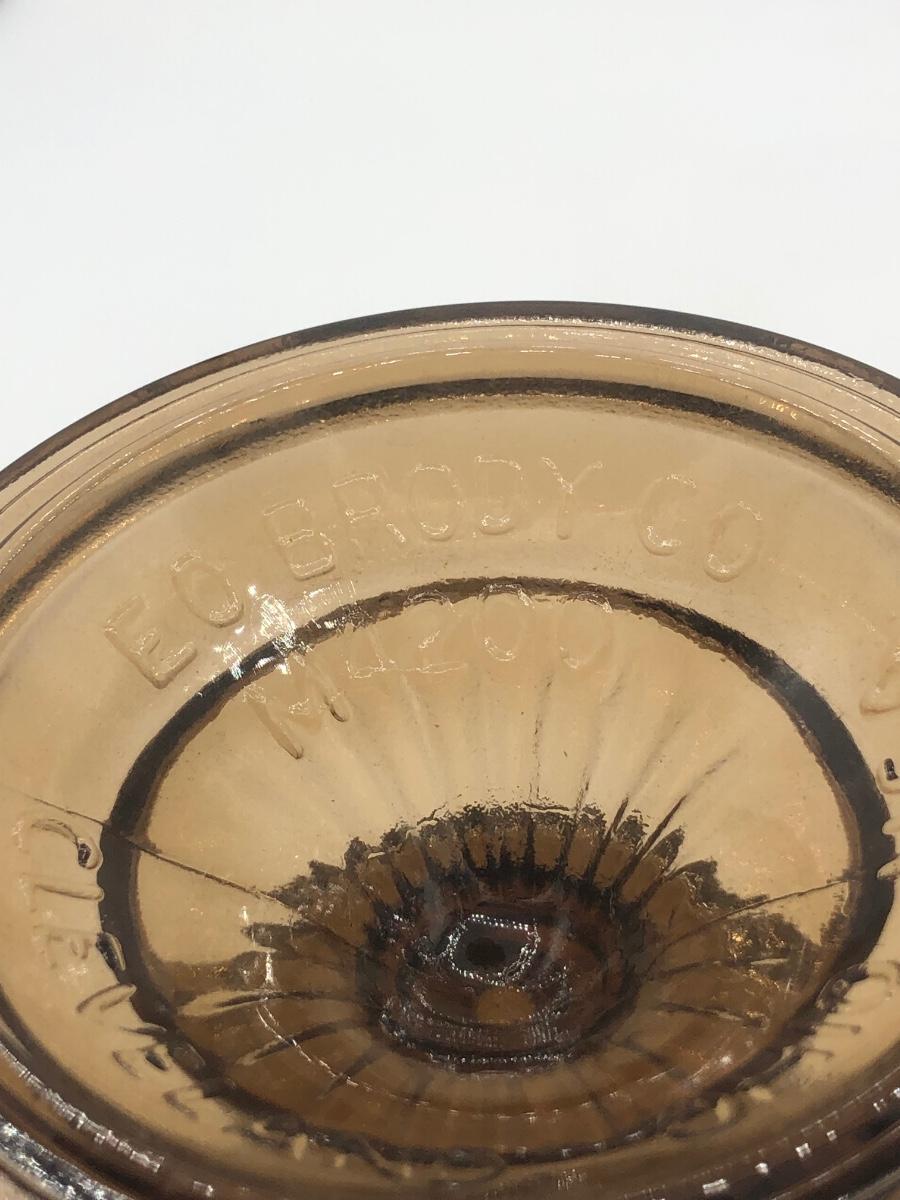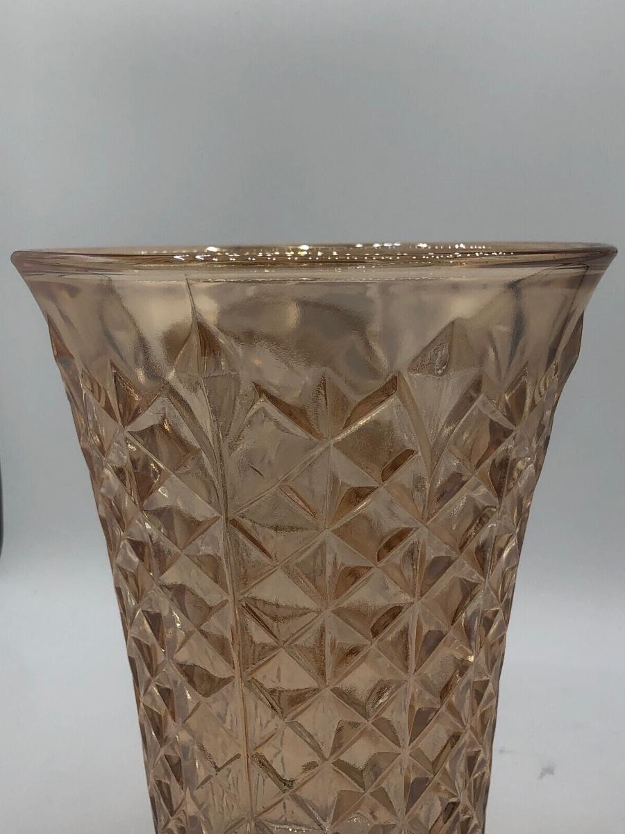 LOT 104: Vintage E.O. Brody Thumbprint Amber Glass Pedestal Vase, Iridescent Marigold Carnival Glass Flower Bowl & Pressed Glass Amber Vase