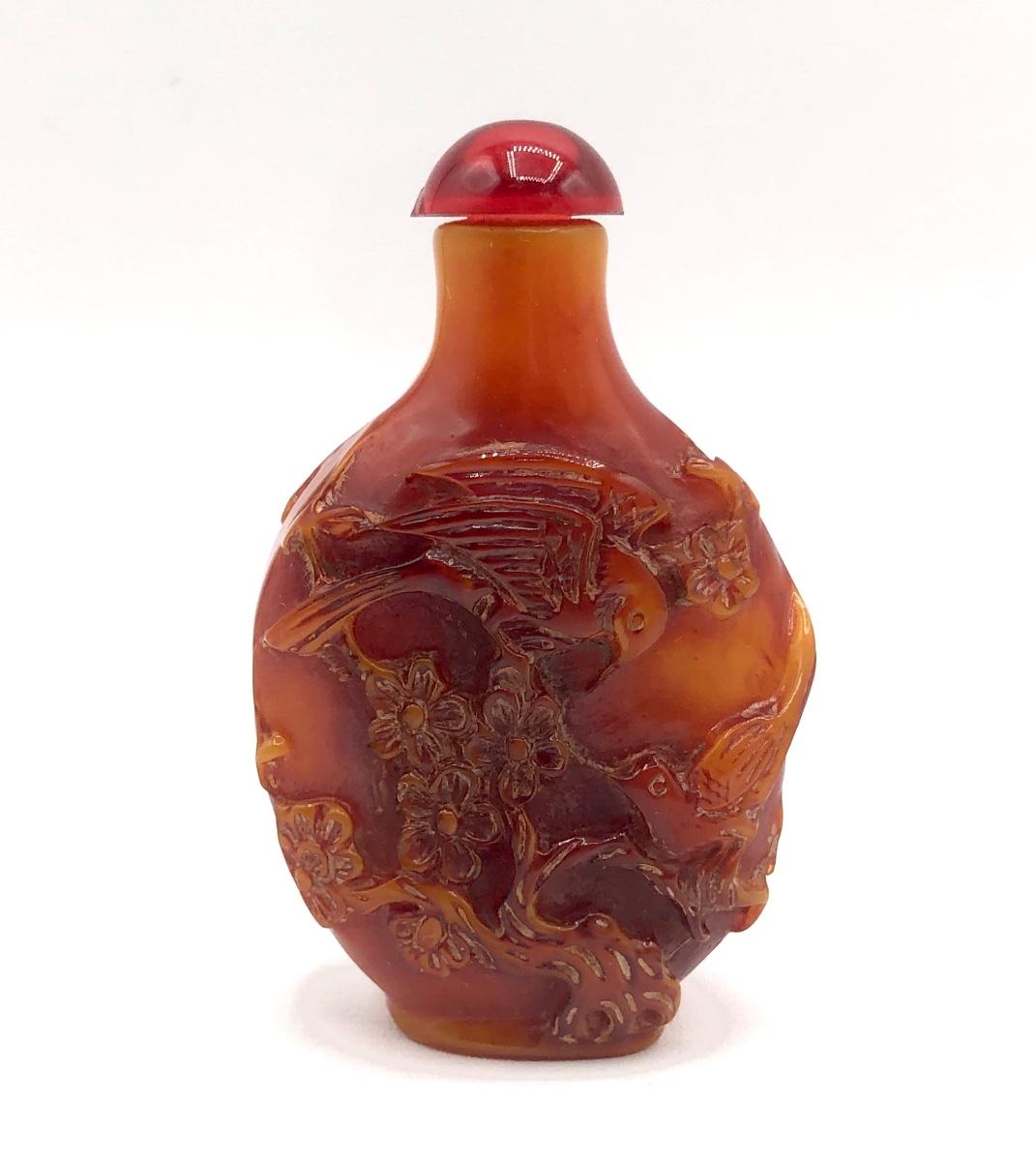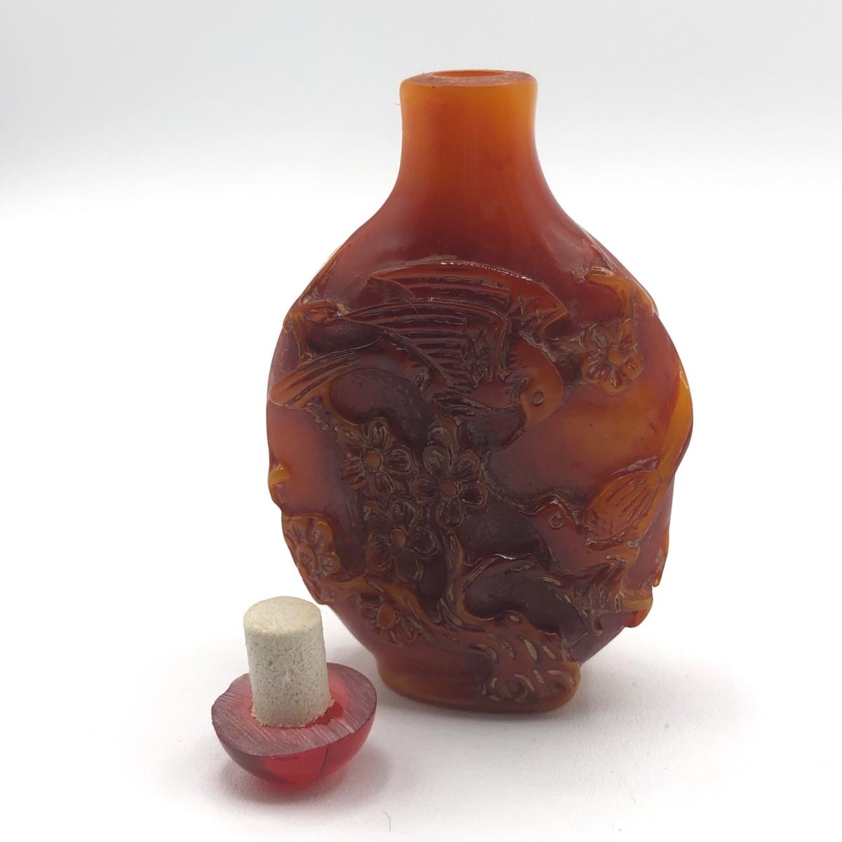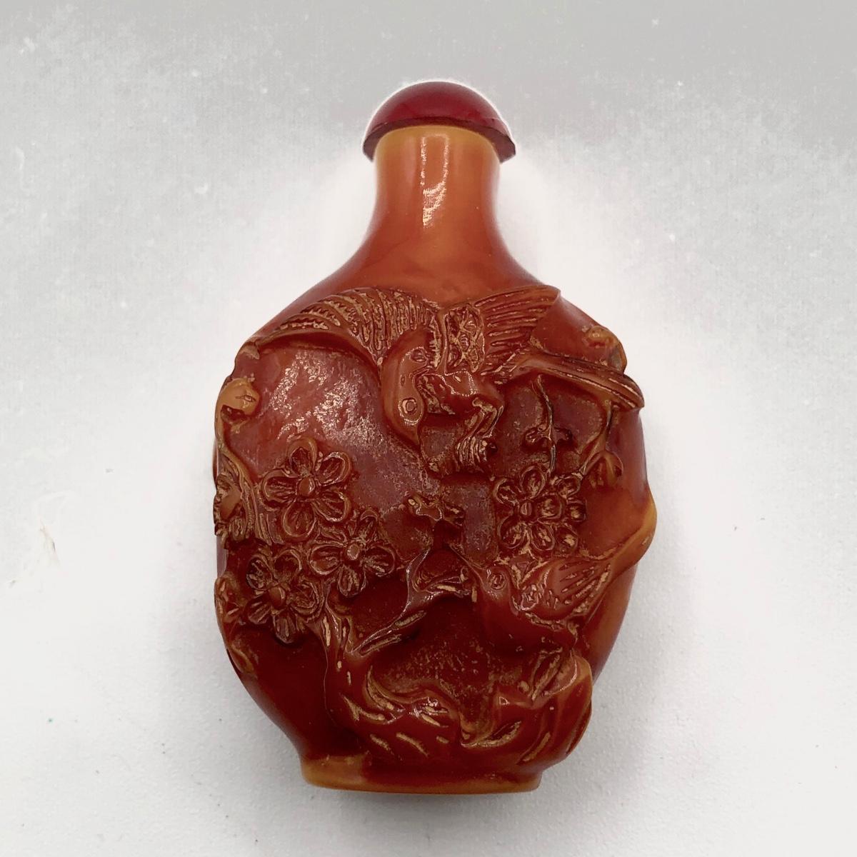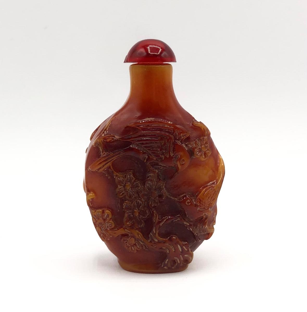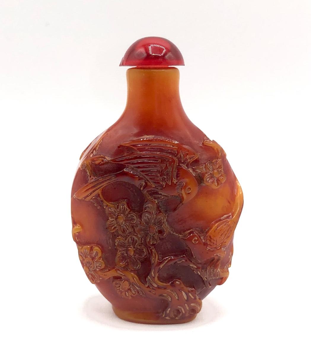 LOT 113: Vintage Carved Amber Color Snuff Bottle