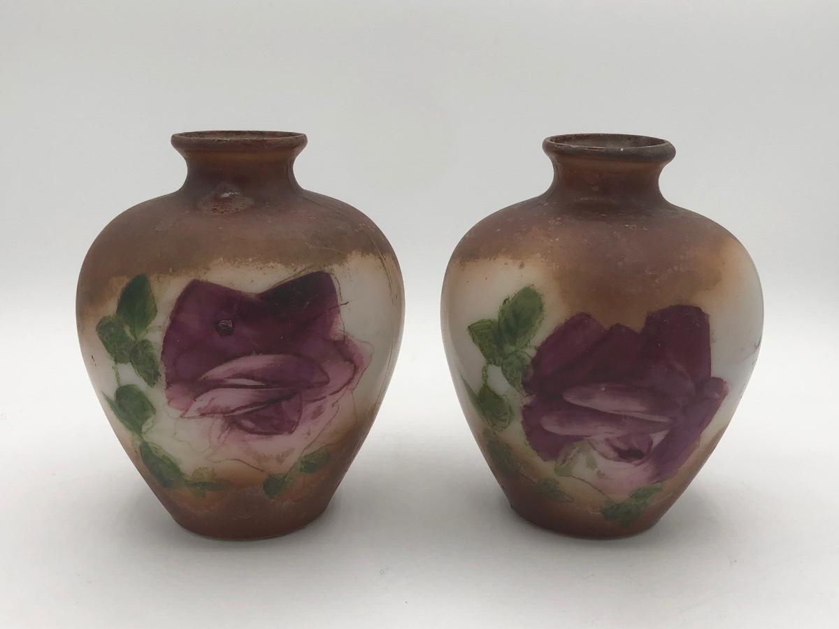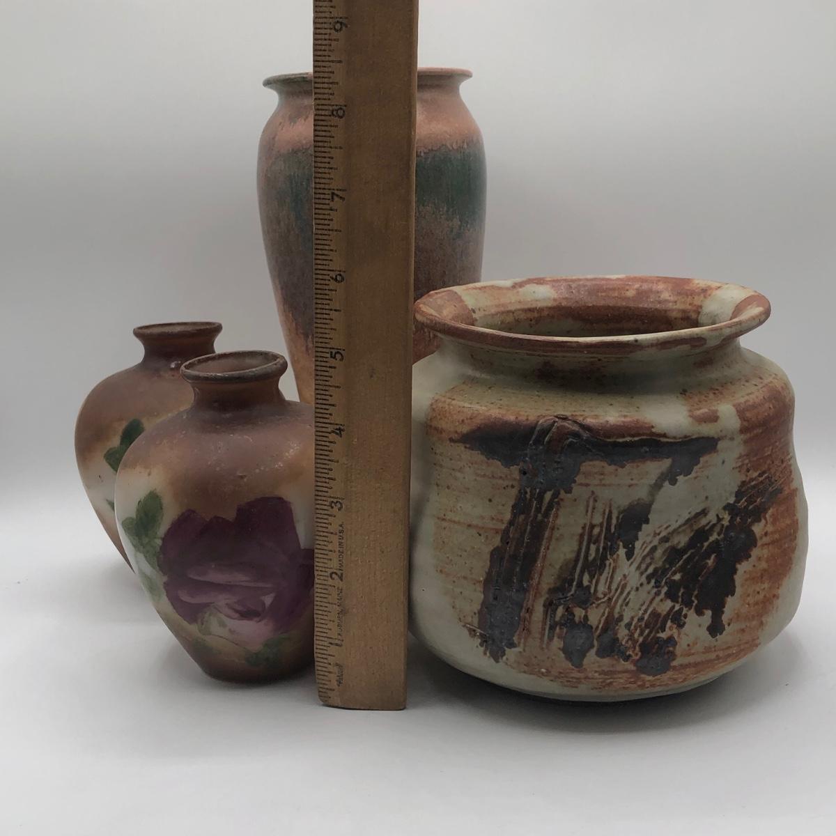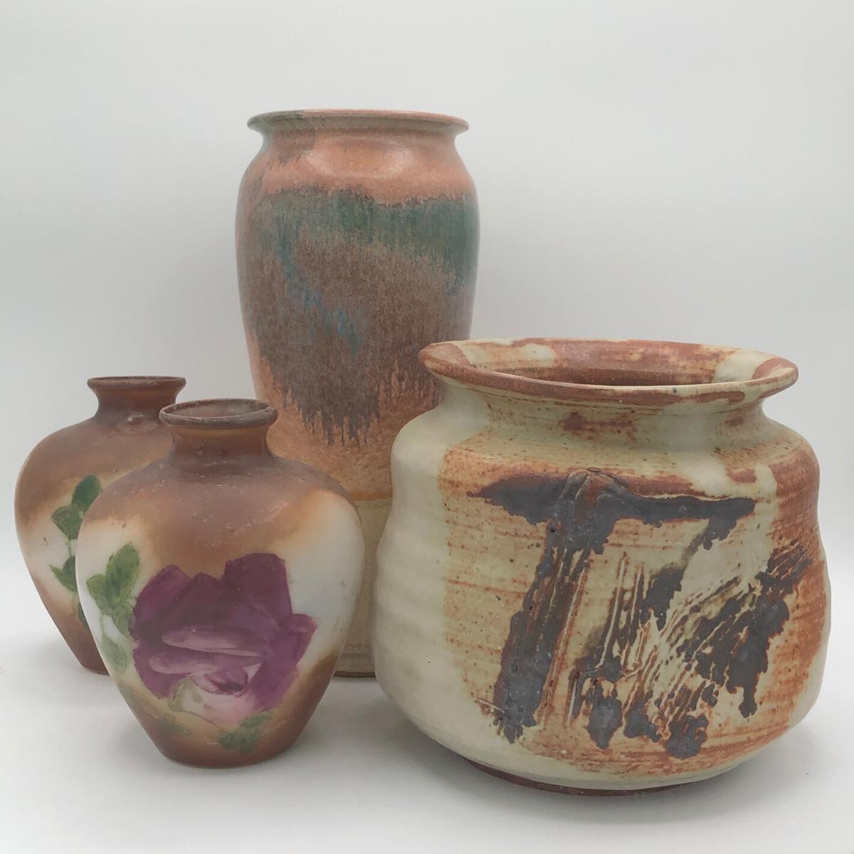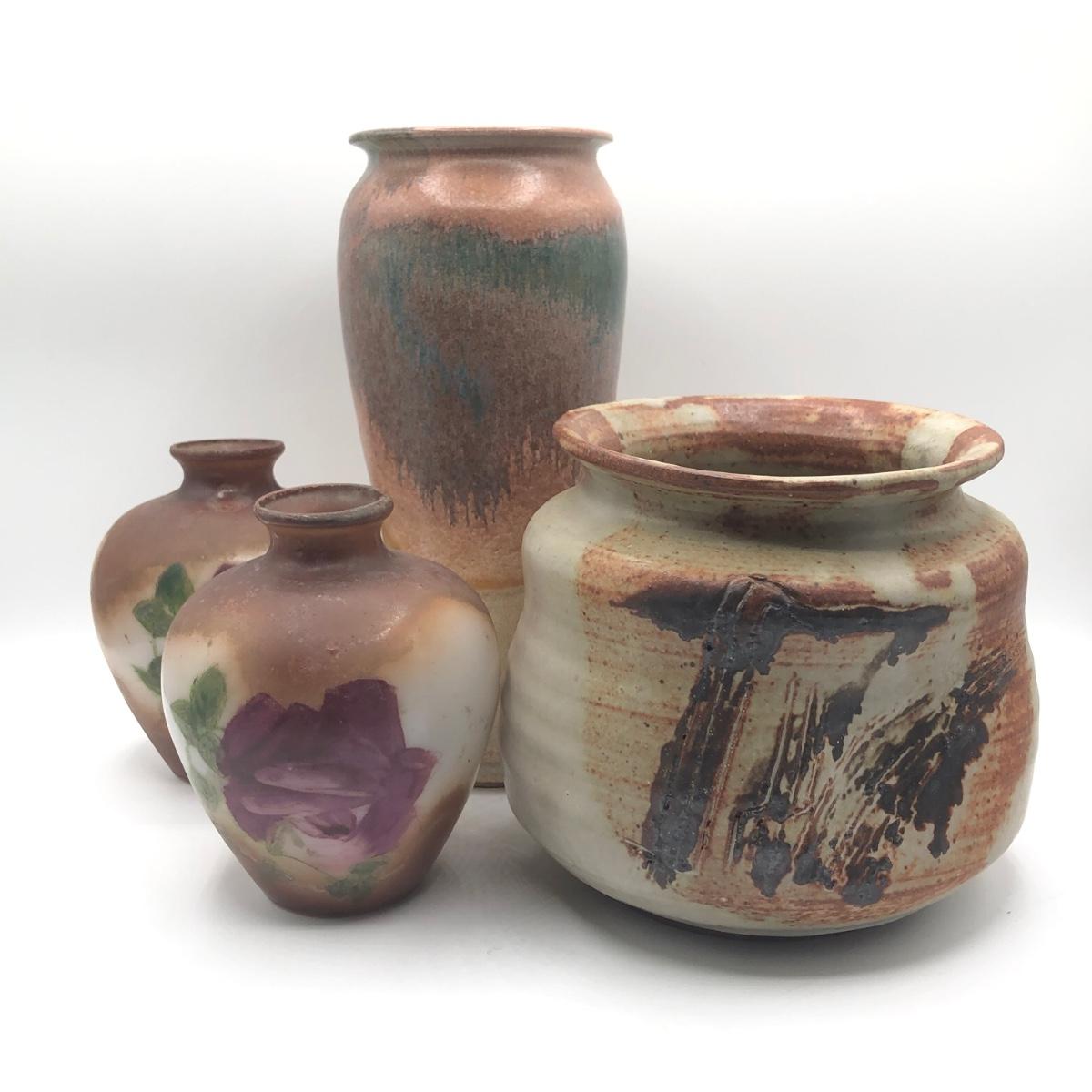 LOT 119: Two Artist Signed Pottery Vases & Two Painted Glass Vases