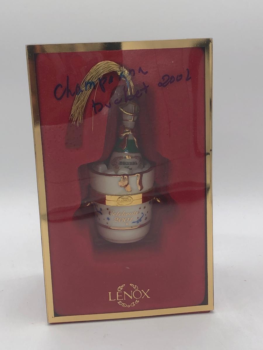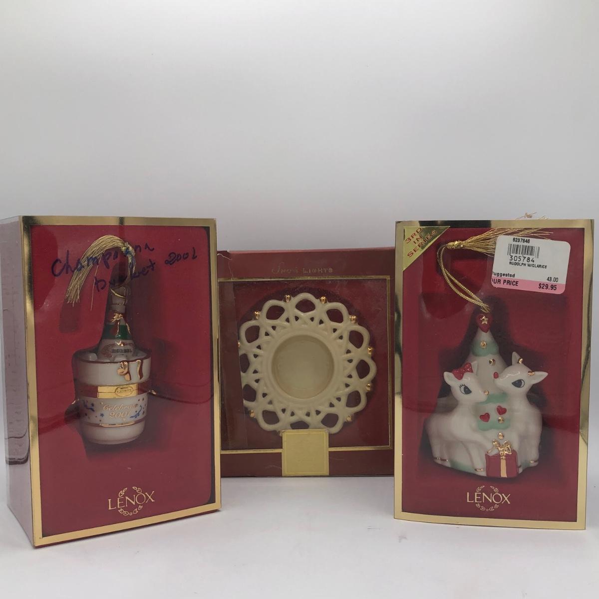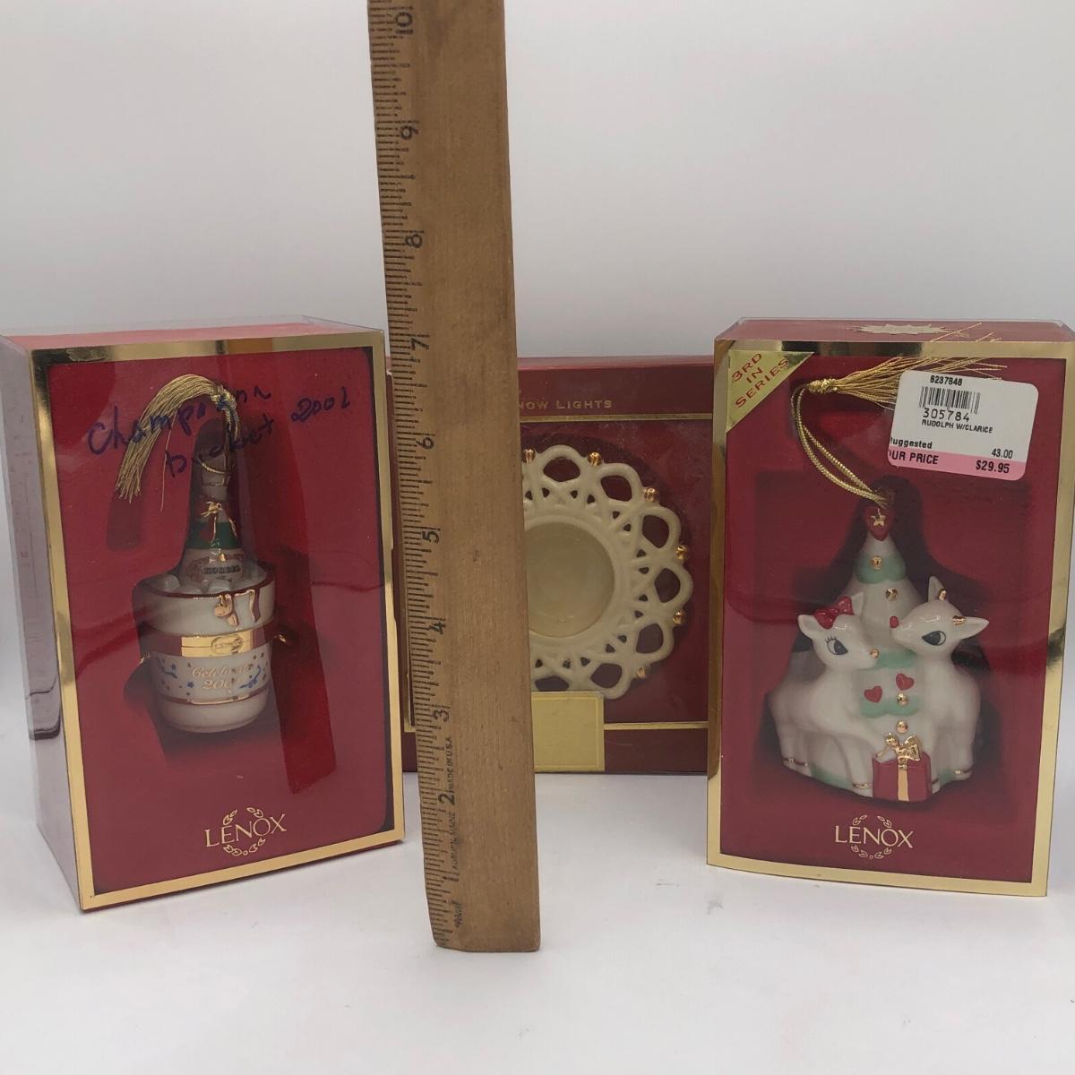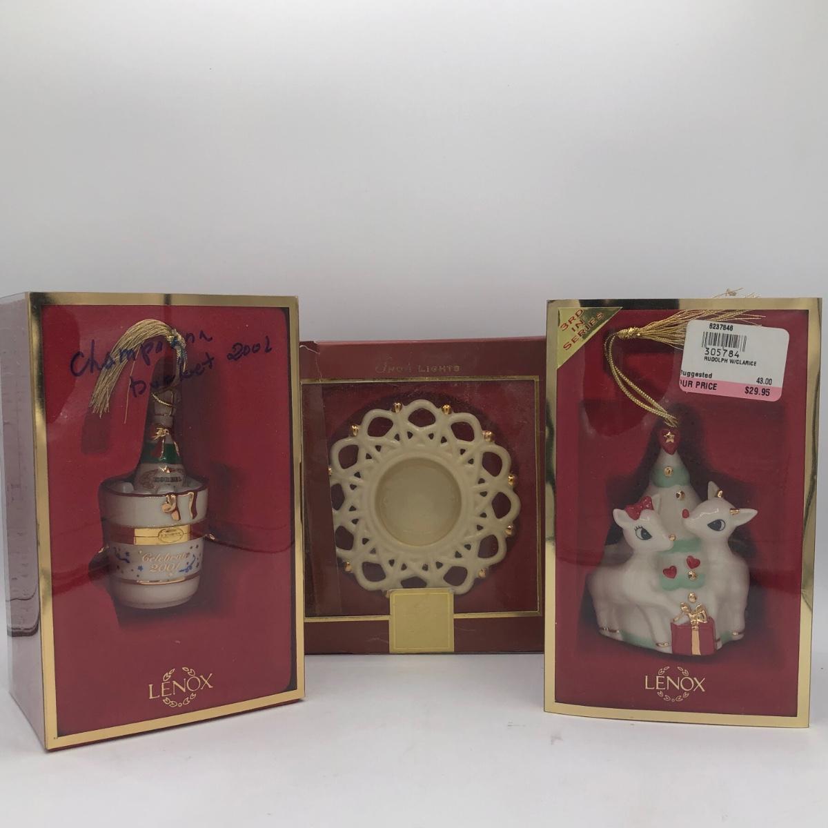 LOT 147: Lenox Christmas Collection: Snow Lights Shimmer Votive, Rudolph w/ Clarice Ornament & 2001 Champagne Bucket Ornament