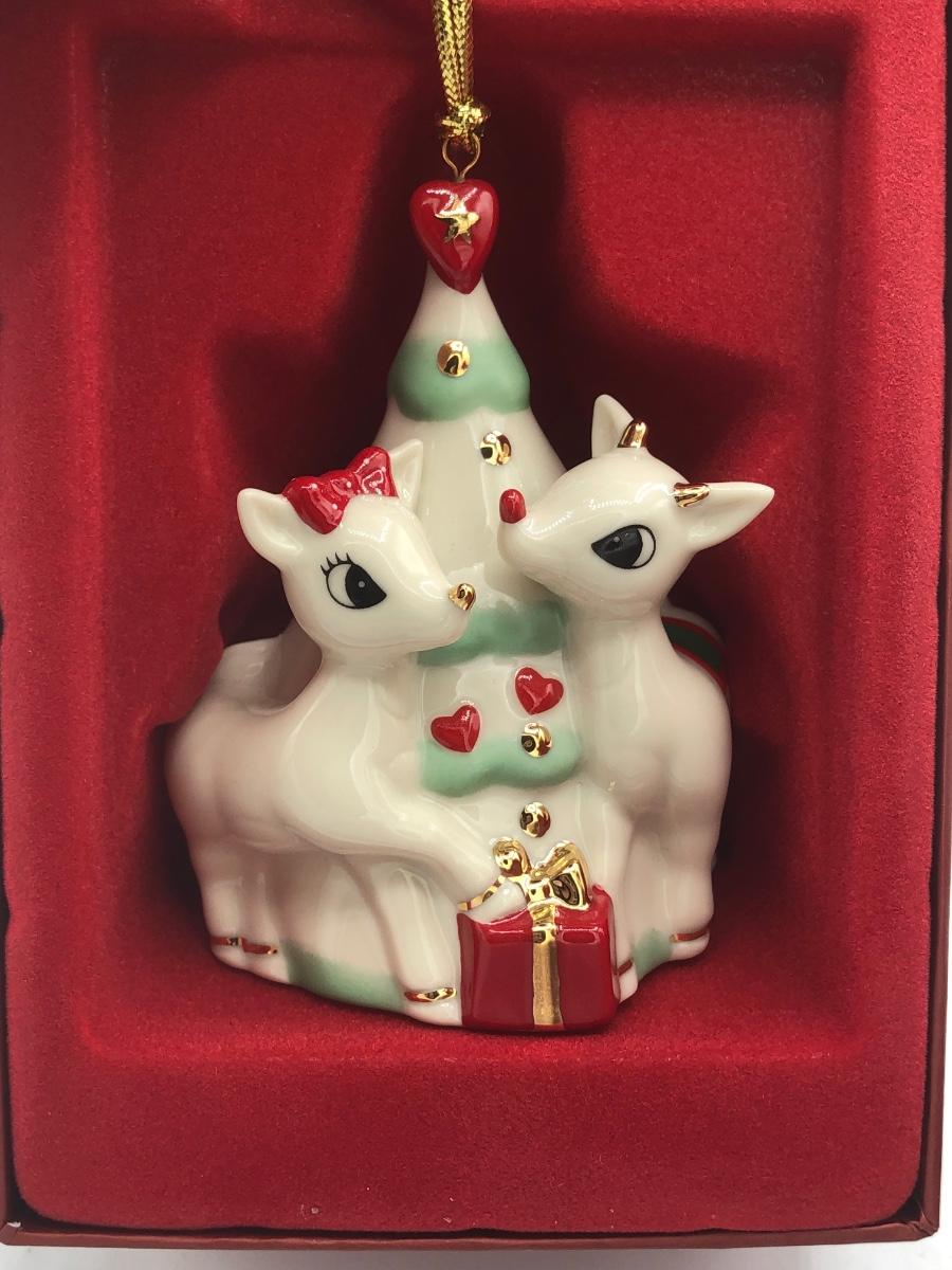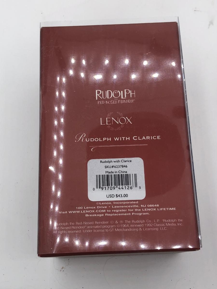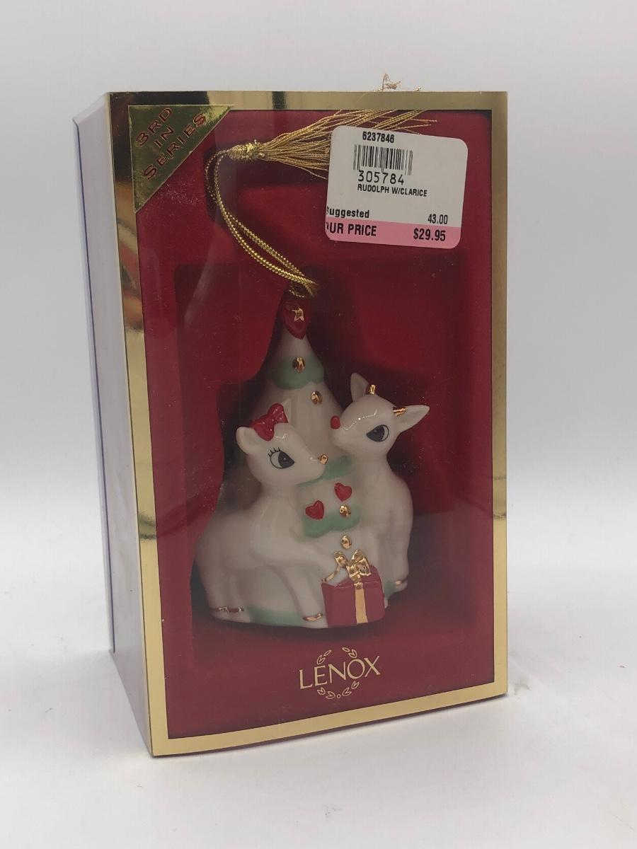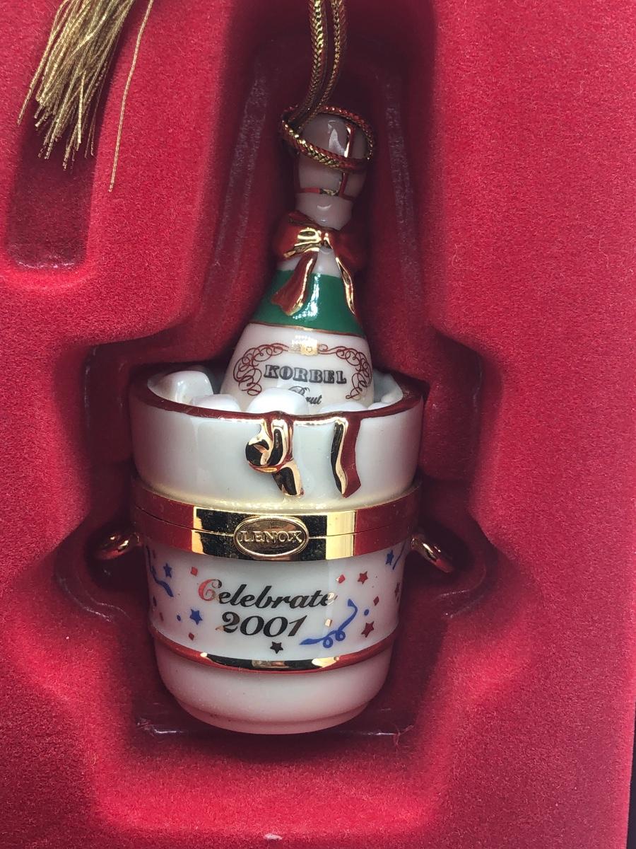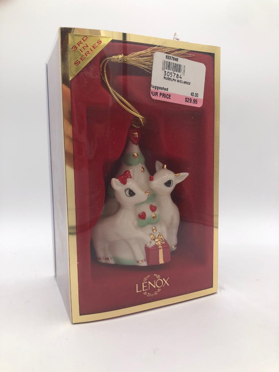 LOT 147: Lenox Christmas Collection: Snow Lights Shimmer Votive, Rudolph w/ Clarice Ornament & 2001 Champagne Bucket Ornament