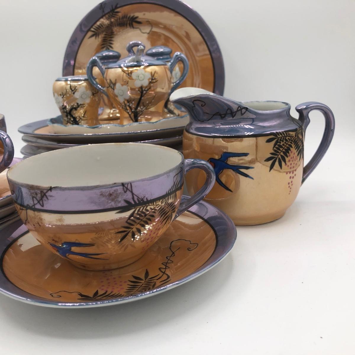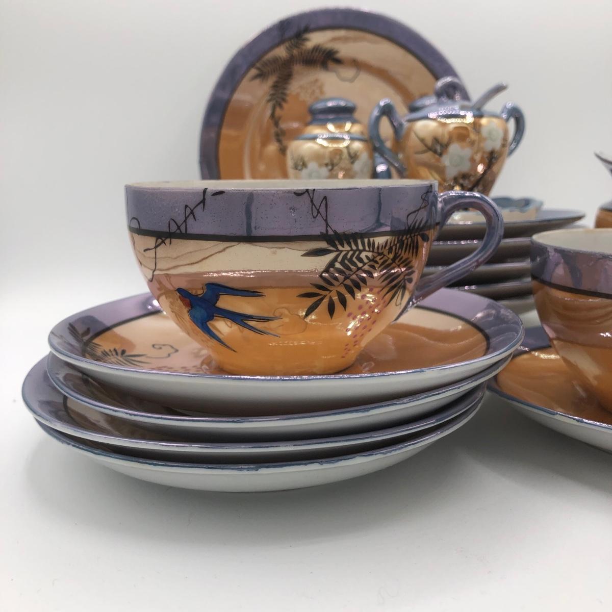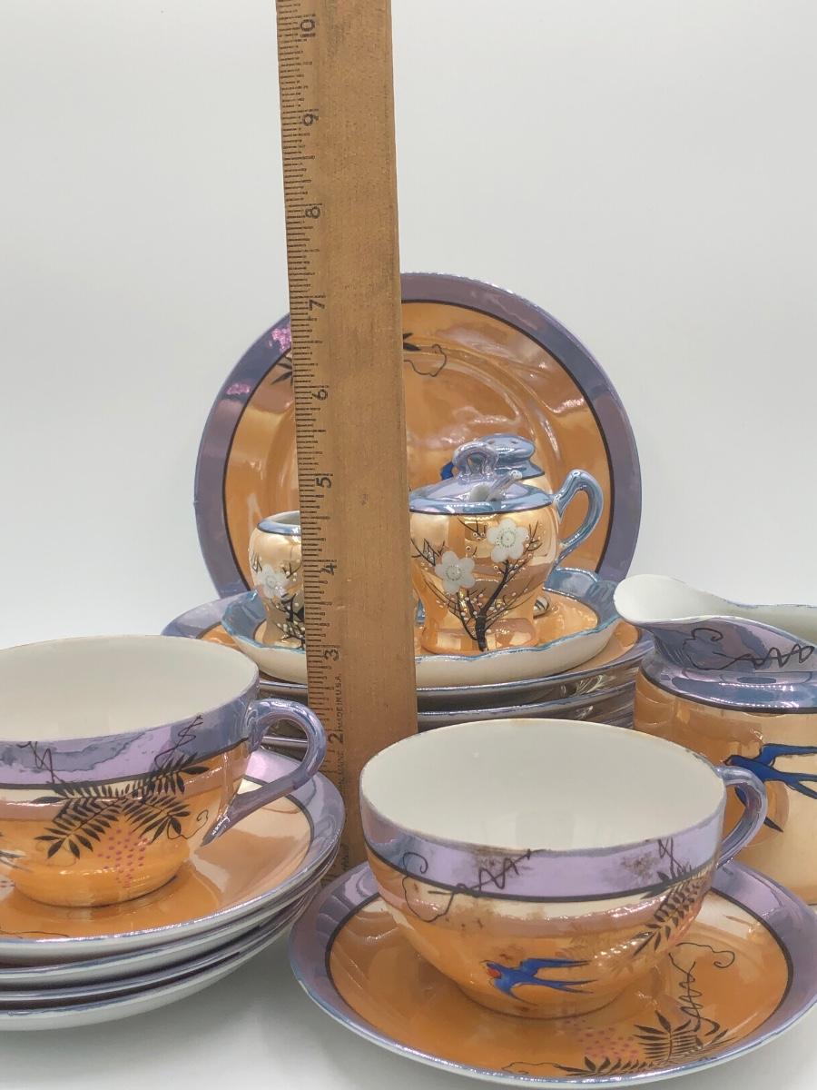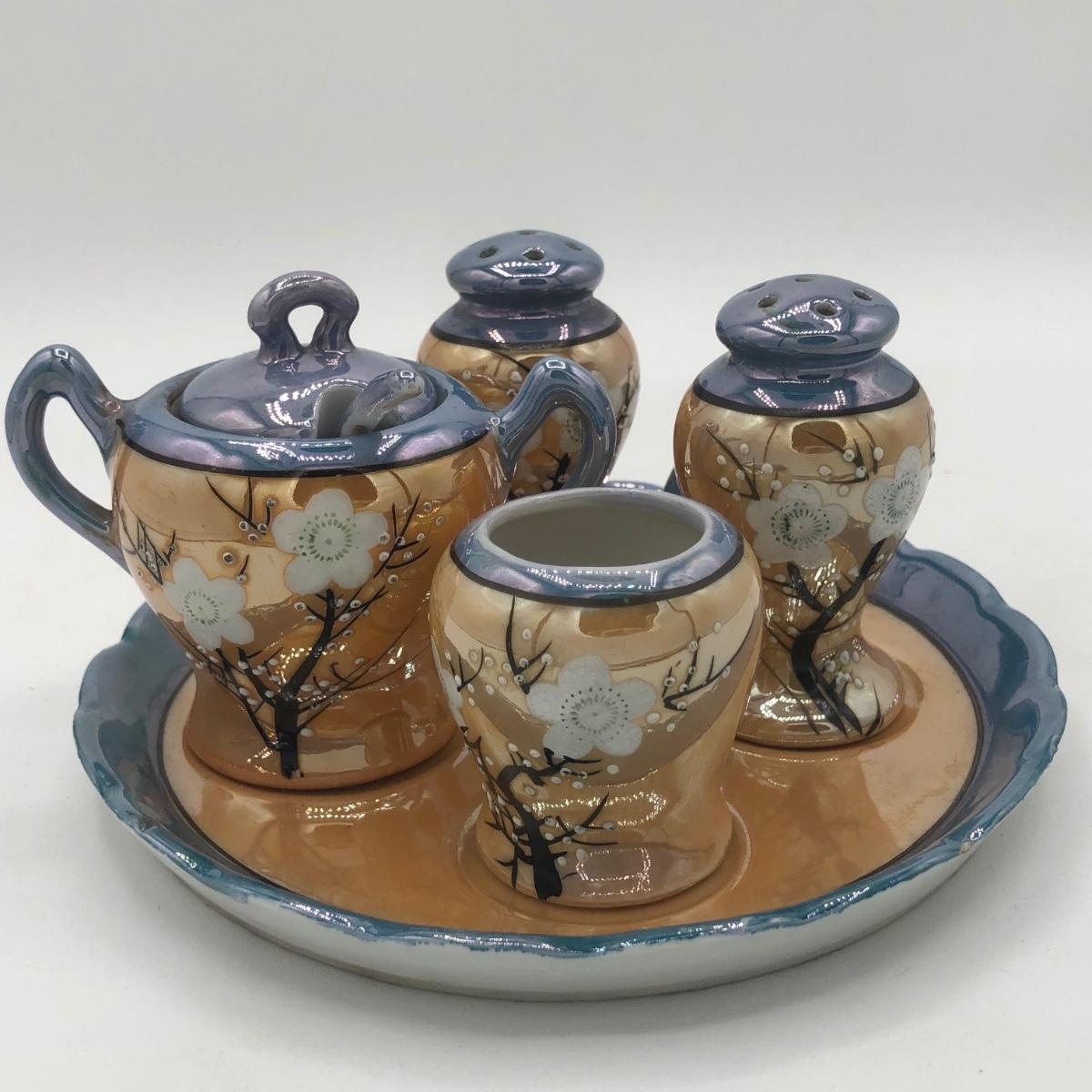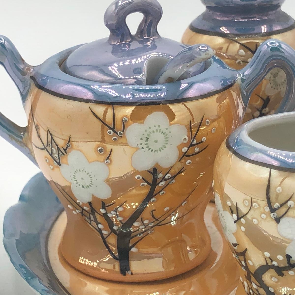 LOT 150: Gorgeous Orange & Blue Japanese Lustreware Tea Set w/ Condiment Tray