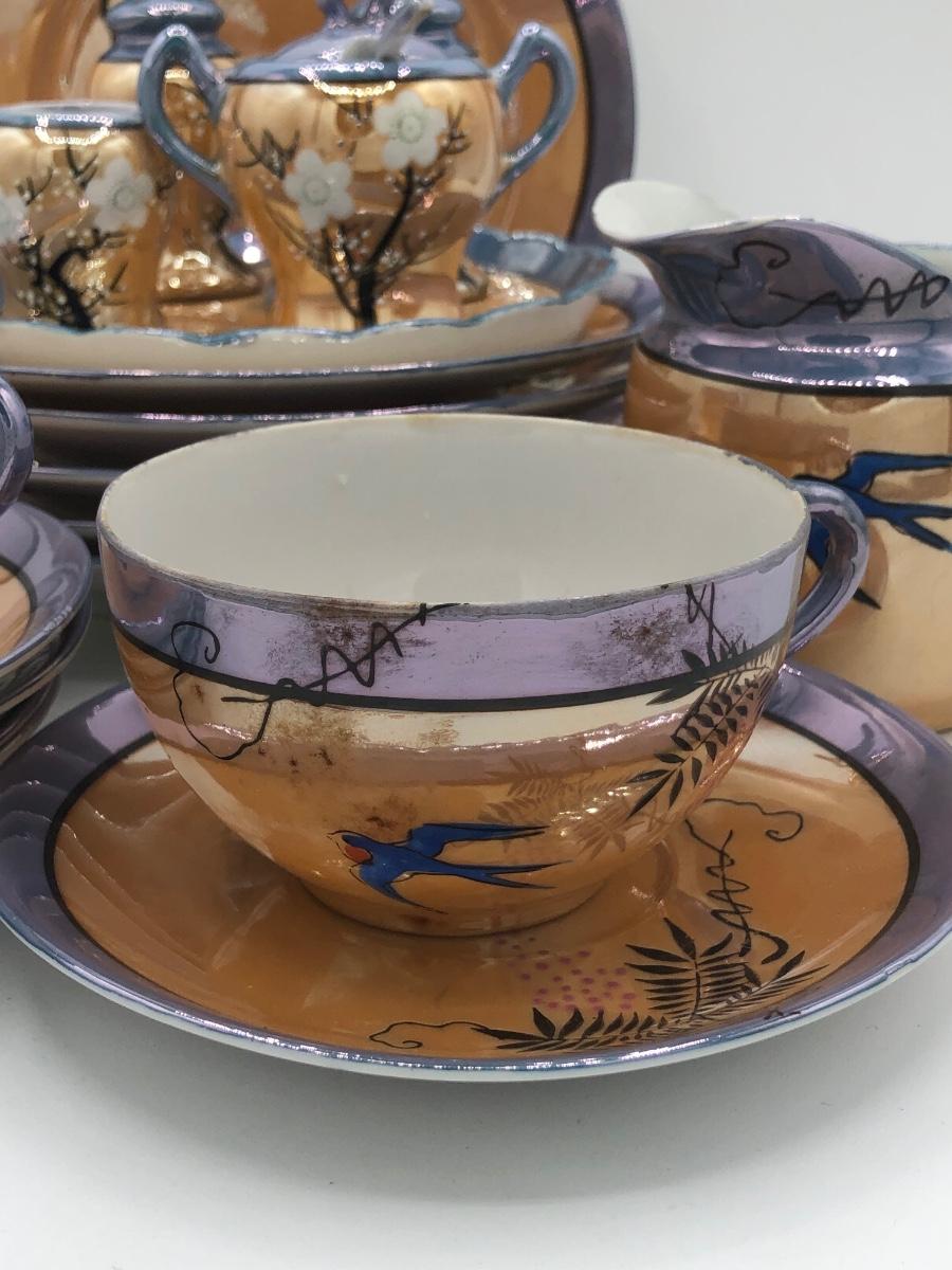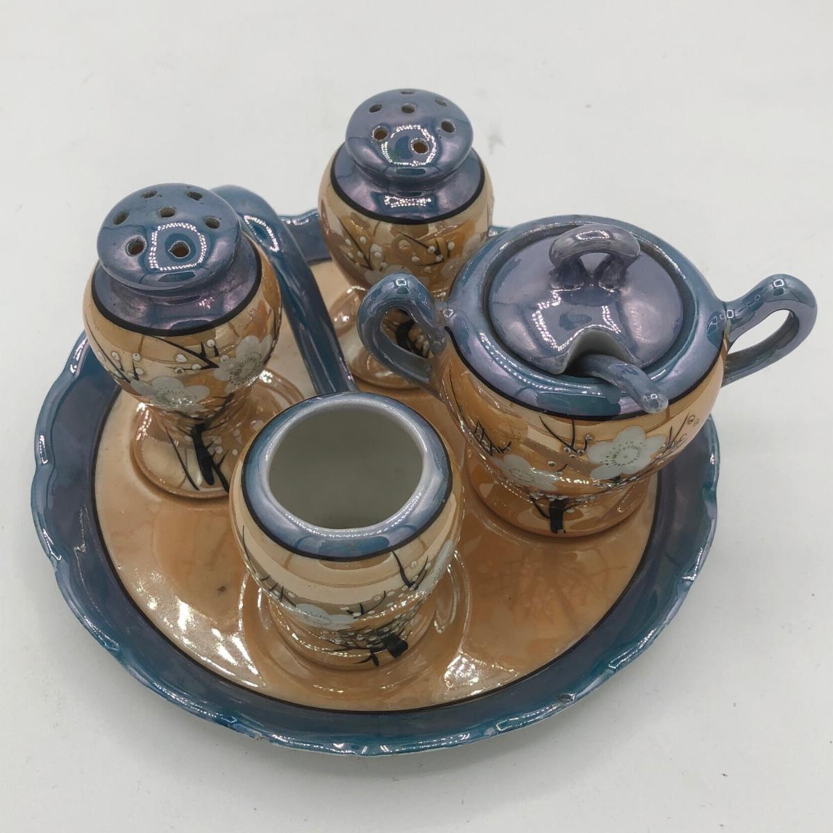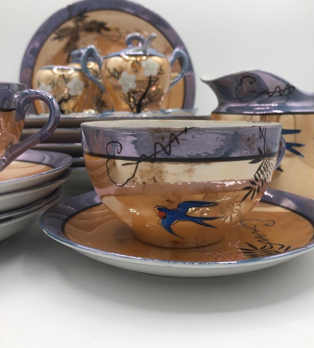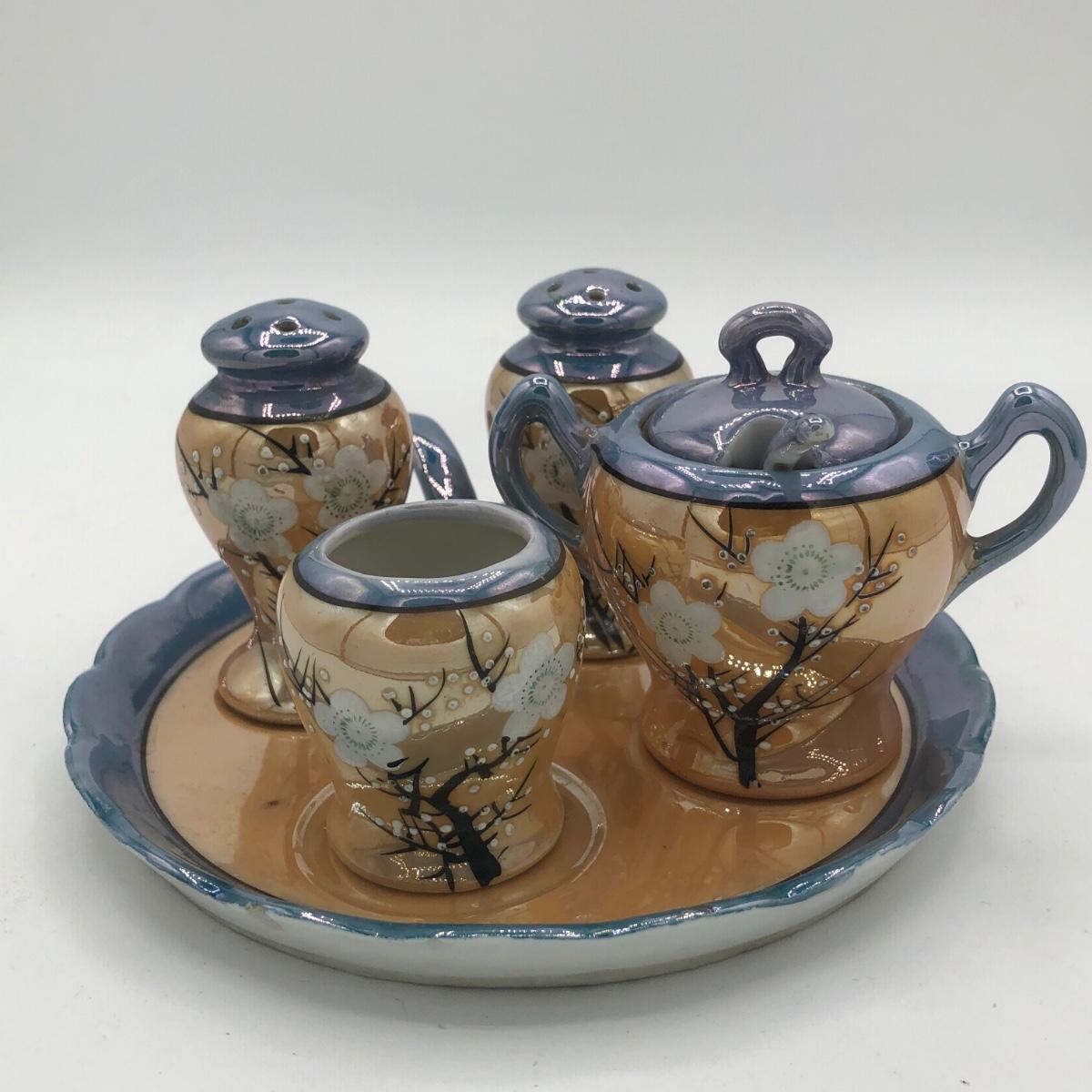 LOT 150: Gorgeous Orange & Blue Japanese Lustreware Tea Set w/ Condiment Tray