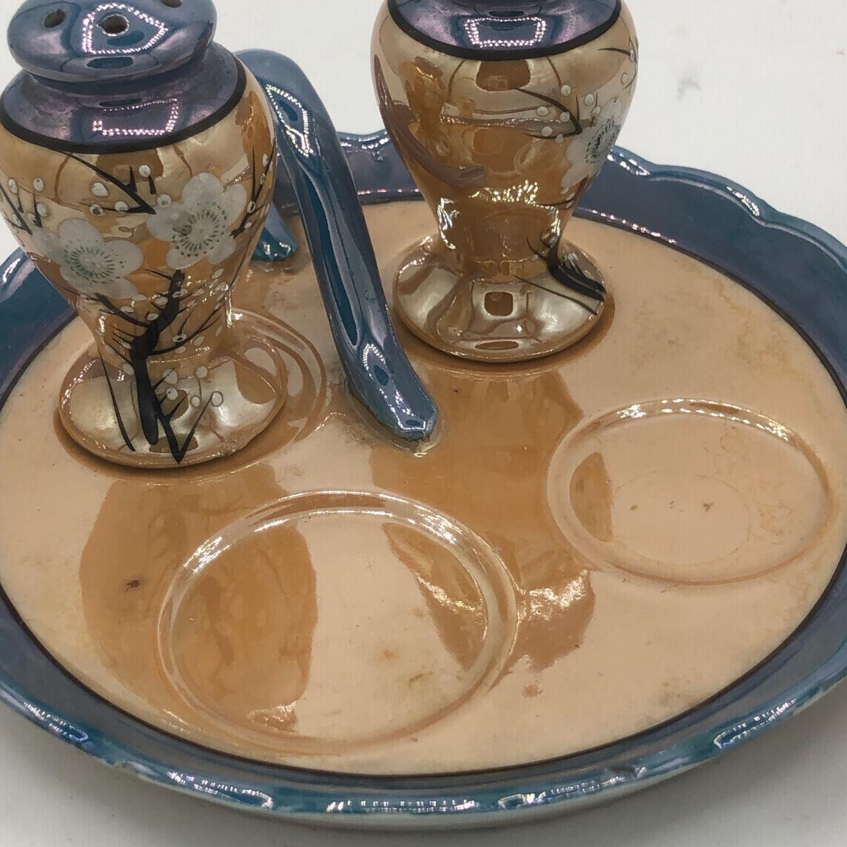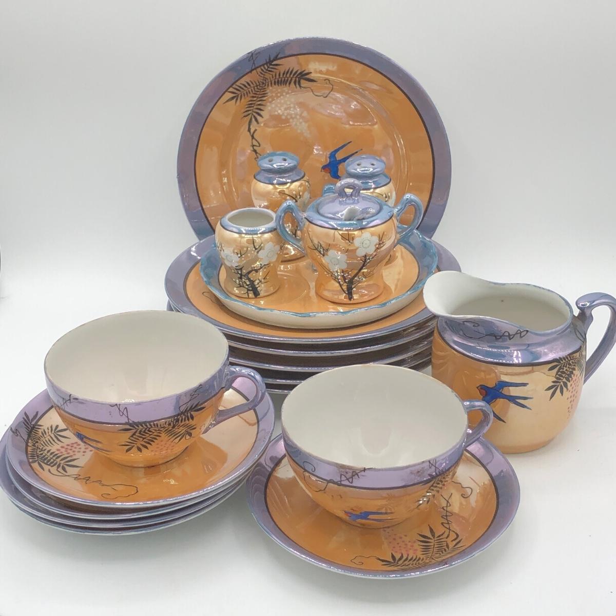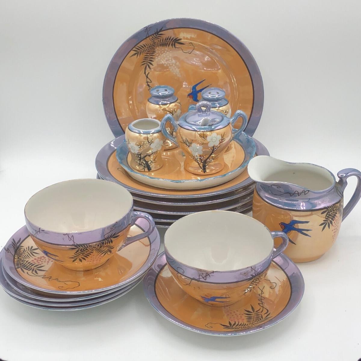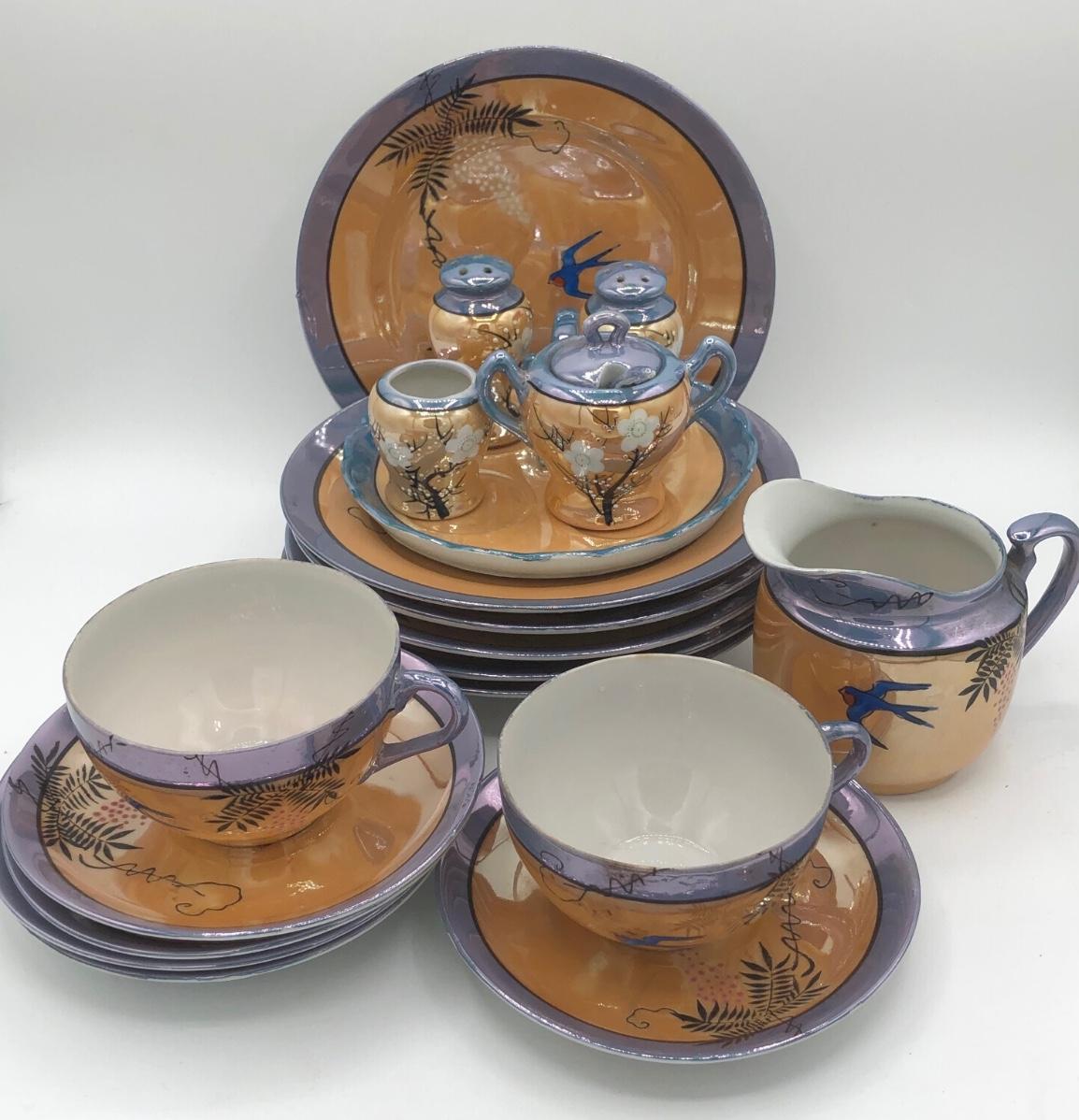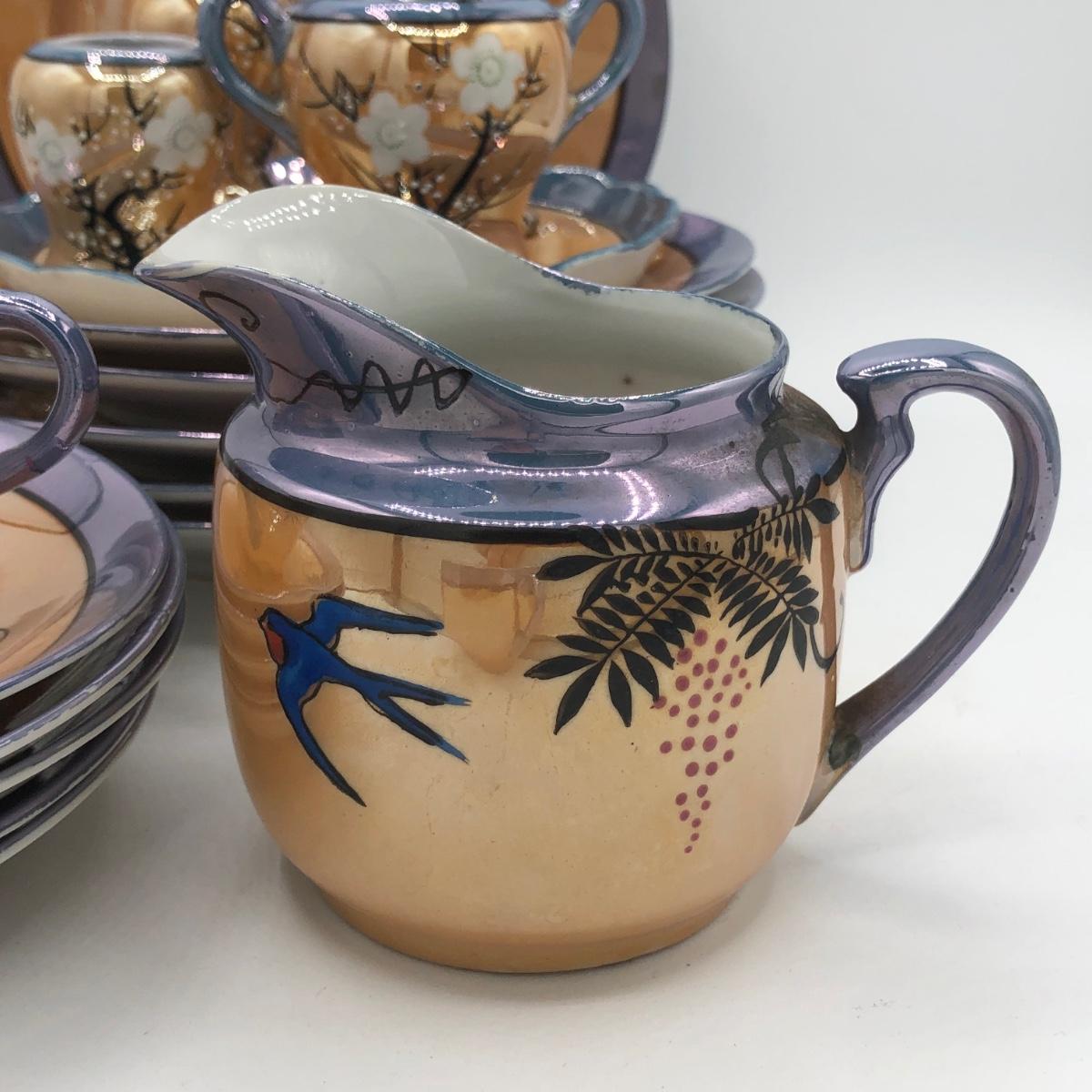 LOT 150: Gorgeous Orange & Blue Japanese Lustreware Tea Set w/ Condiment Tray