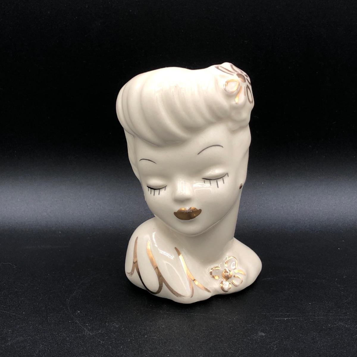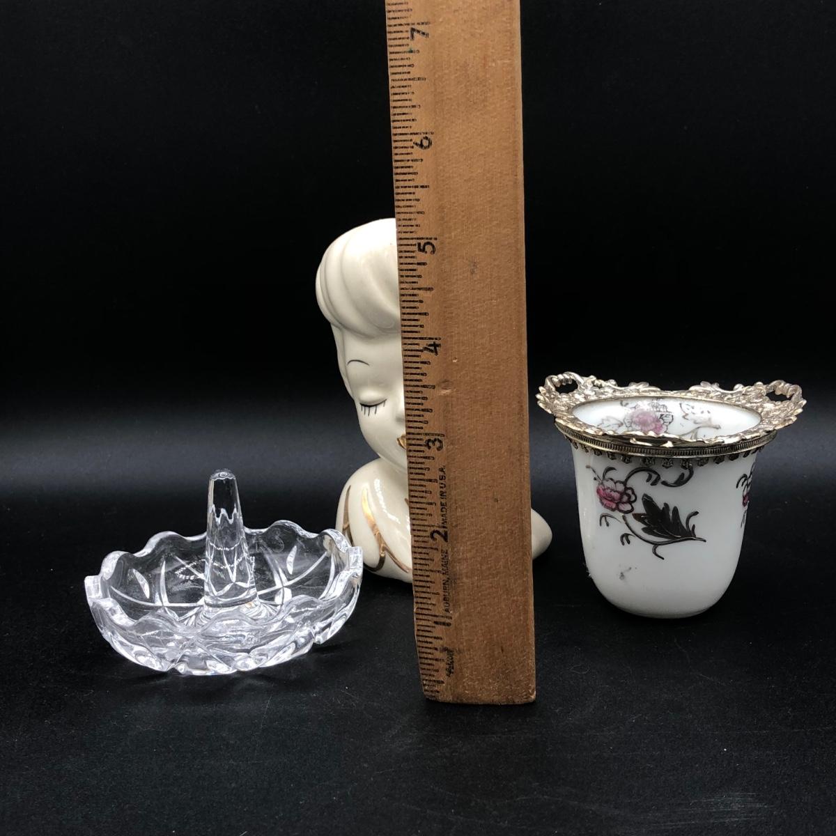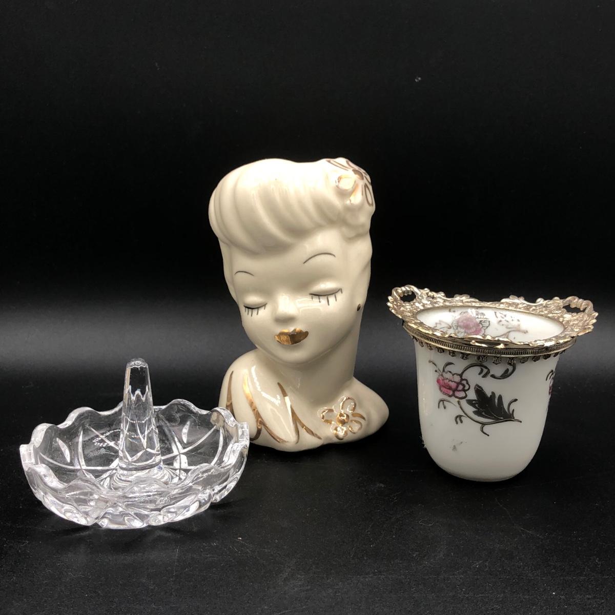 LOT 156: Vanity Collection: Vintage Betty Grable / Glamour Girl Head Vase, Crystal Ring Holder & Floral China Cup w/ Metal Rim