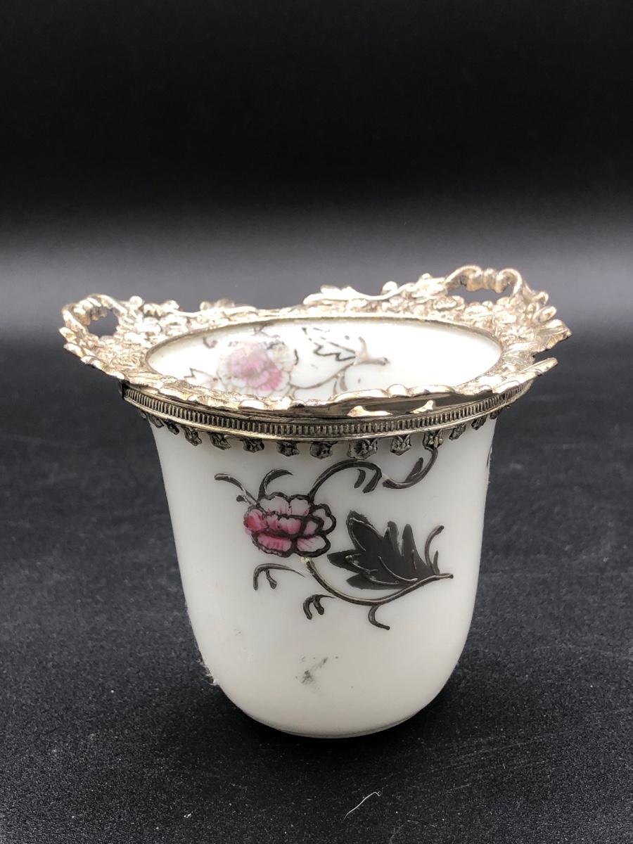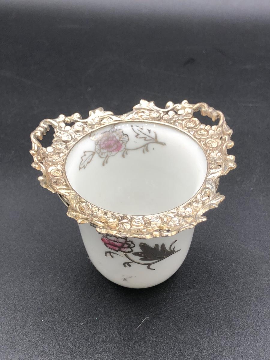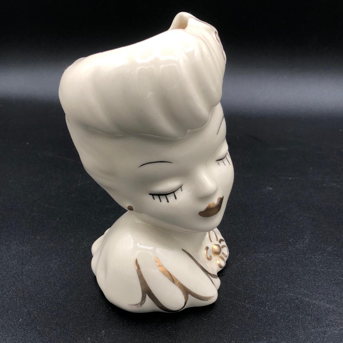 LOT 156: Vanity Collection: Vintage Betty Grable / Glamour Girl Head Vase, Crystal Ring Holder & Floral China Cup w/ Metal Rim
