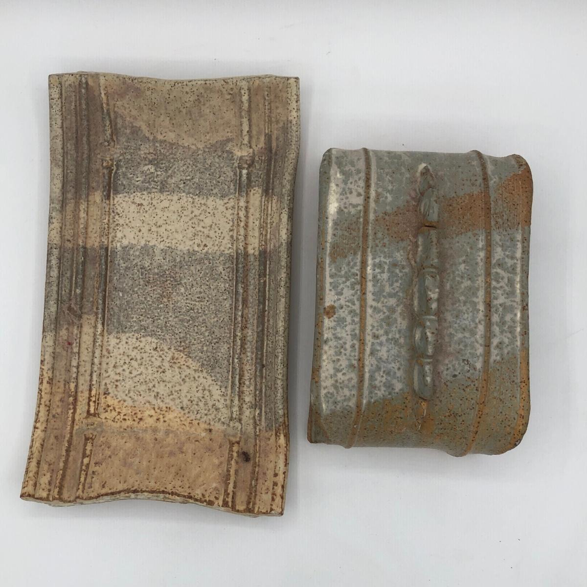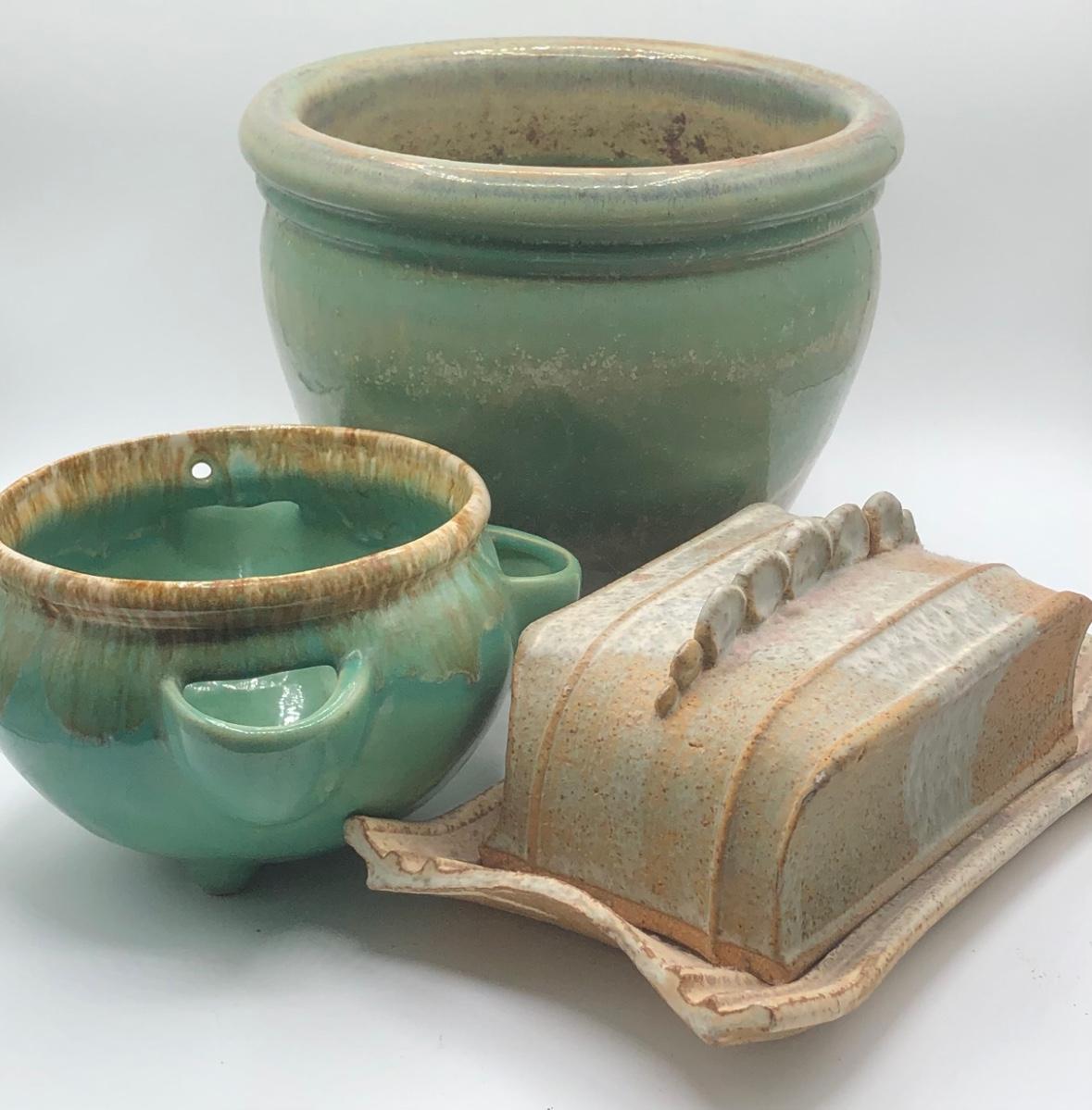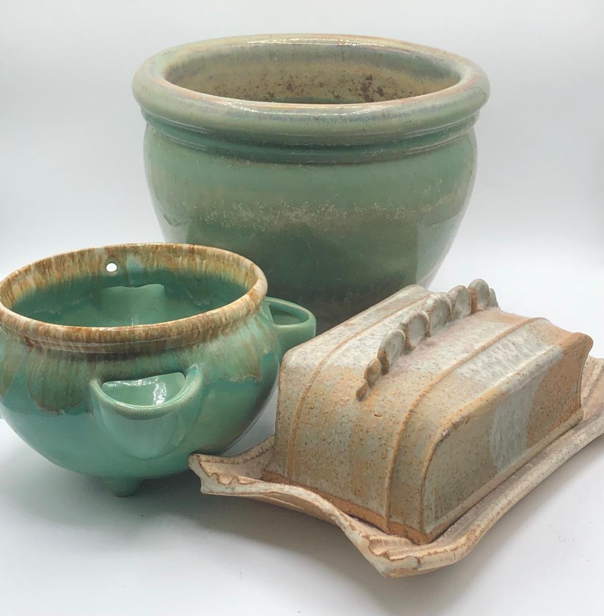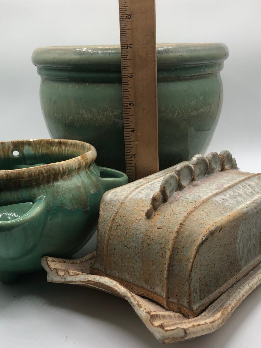 LOT 160: Sculpted Stoneware Pottery Lidded Dish w/ Two Teal Planters