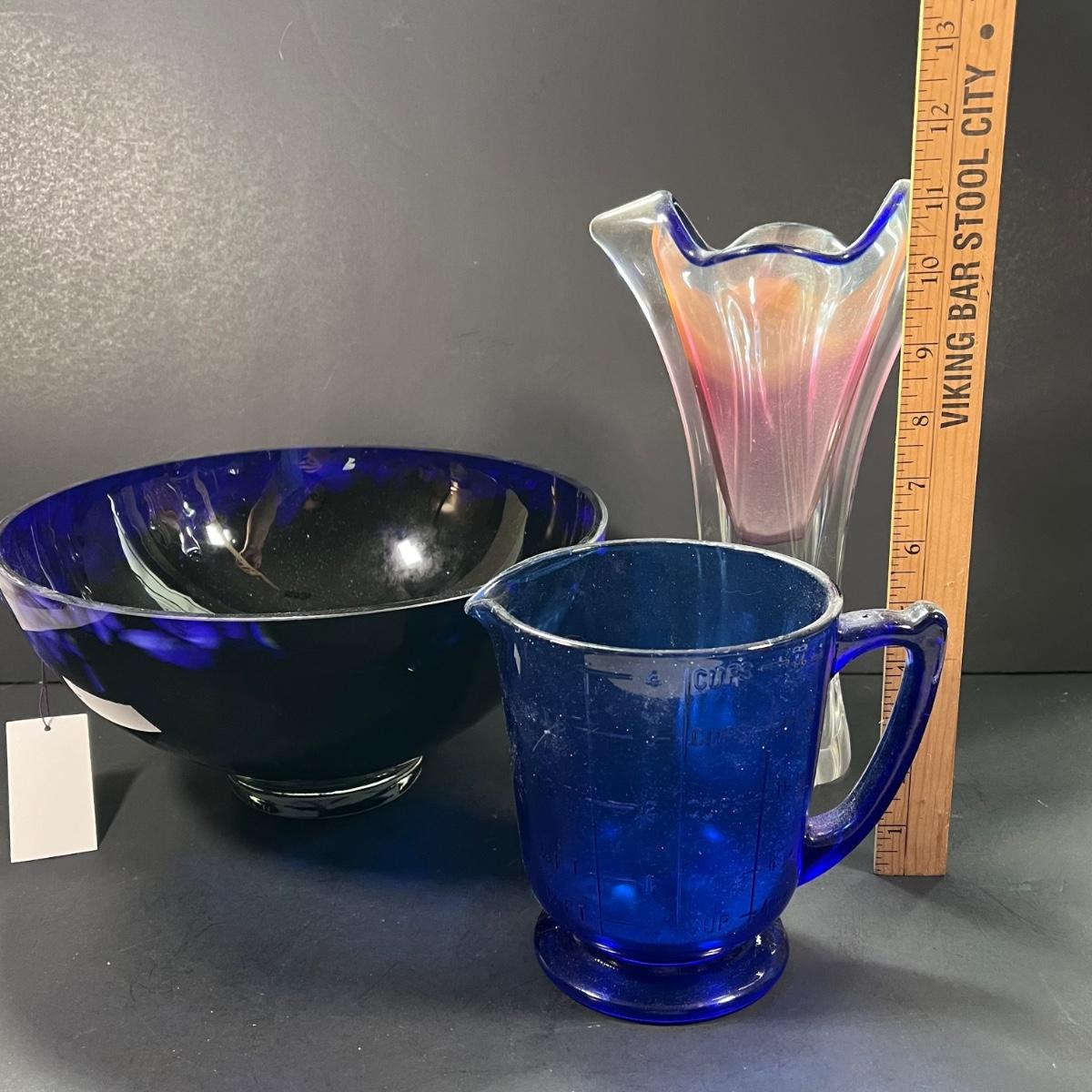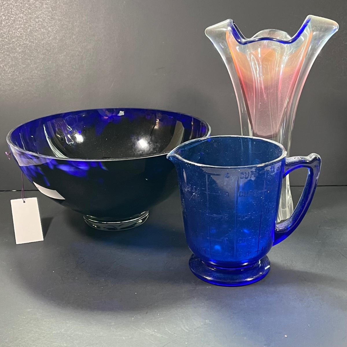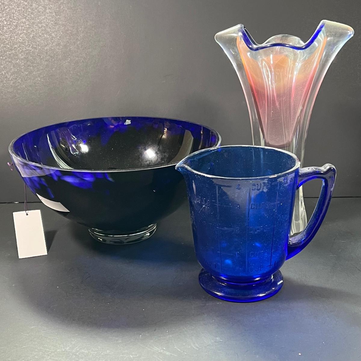 LOT 179: Glass Collection - Vase and Cobalt Blue Bowl and Measuring Cup