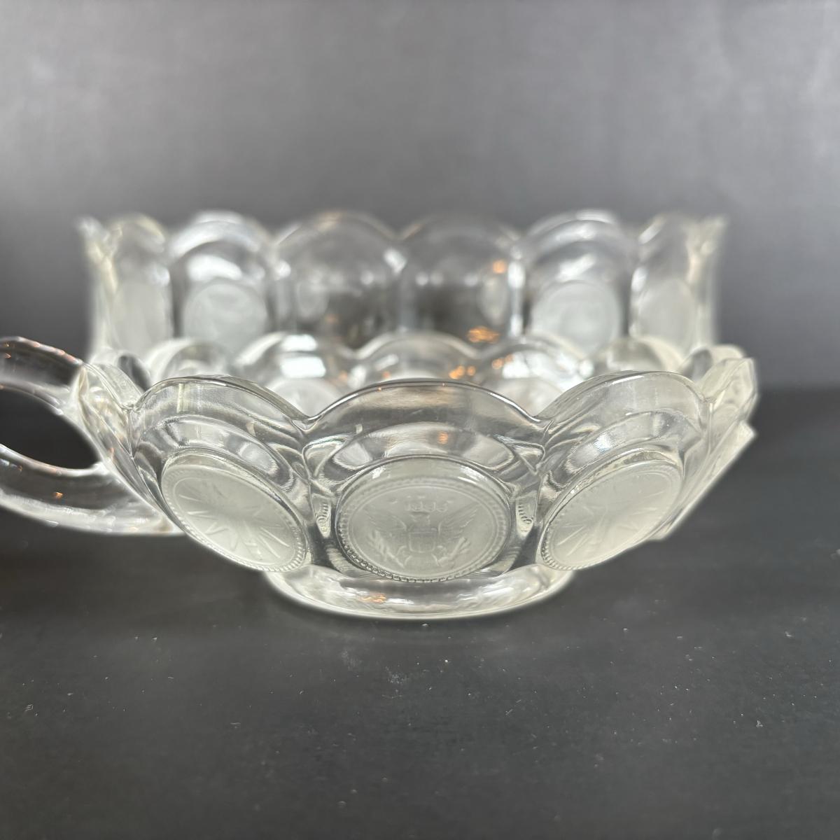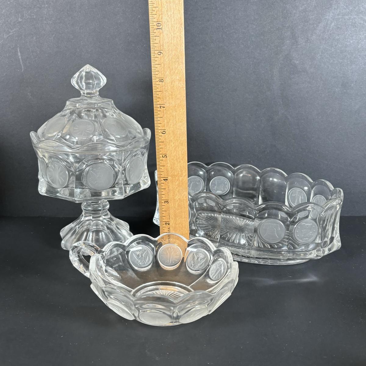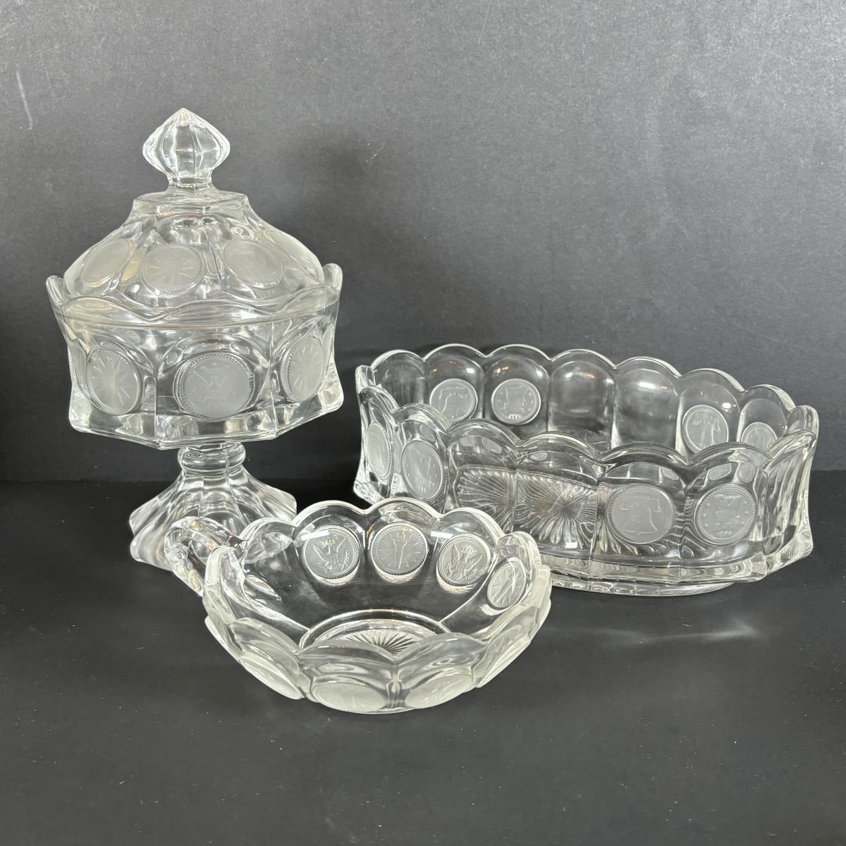 LOT 3: Vintage Fostoria Coin Glass Compote, Nut Bow & Serving Bowl, Noritake Sugar Bowl w/Creamer, Covered Bowl & More